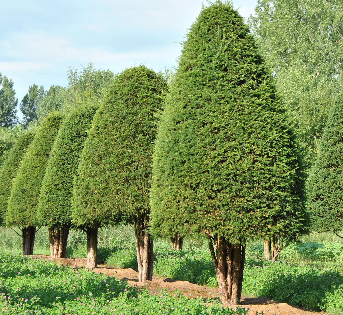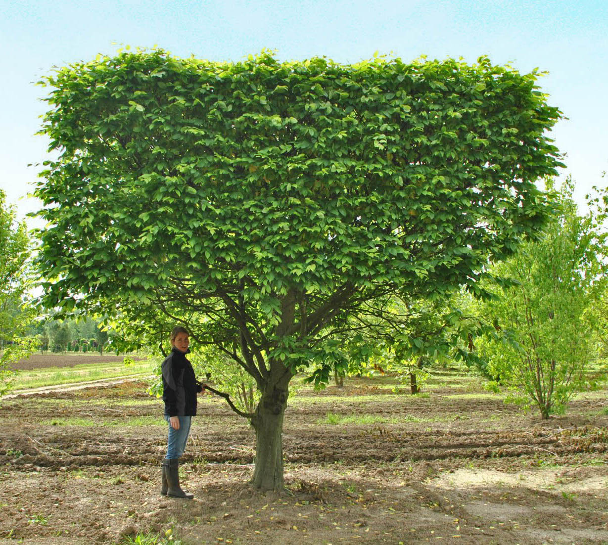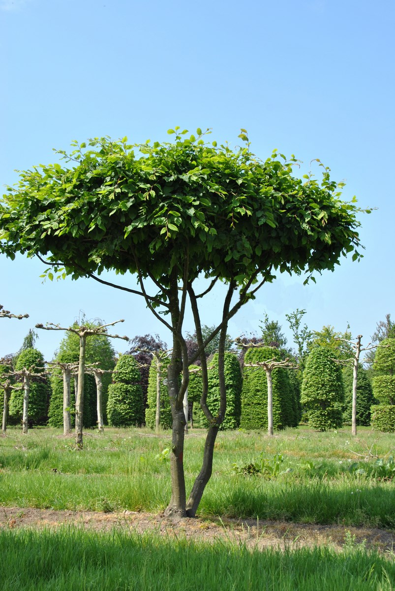 Lime trees and parasol-sycamores are the best known shaped trees but there are many other possibilities. Maples, horse chestnuts, beech, parrotia and many other species are available as espaliers and shaped trees. Carpinus betulus is available in an incredible variety of shapes. It is a very grateful tree that is easy to prune. There are pleached hornbeams with low stems, high stems, as block form trees, multi-stem parasols, cylinders or spheres. The possibilities are endless. If you would prefer an evergreen species, consider a Taxus or holly.