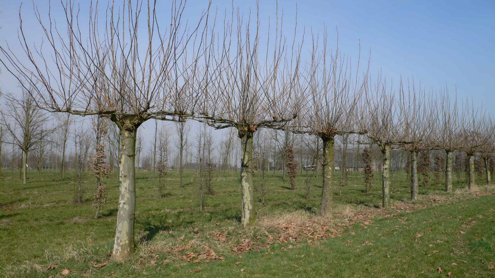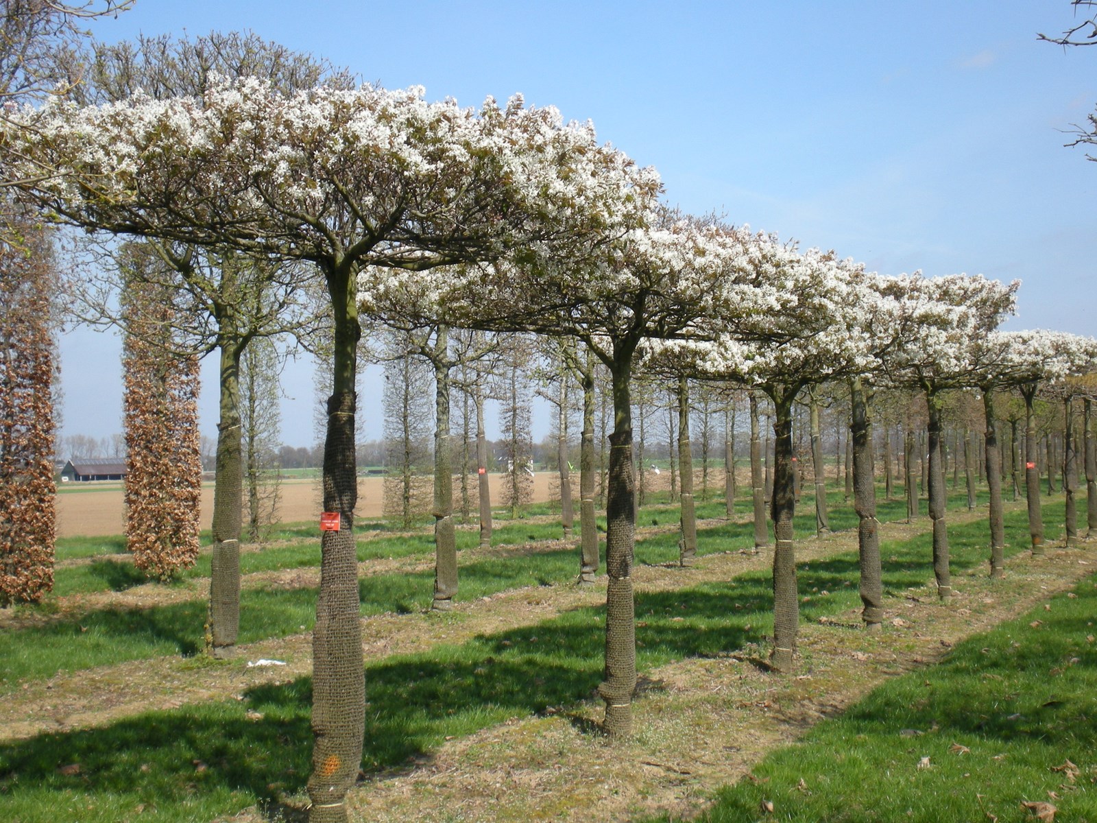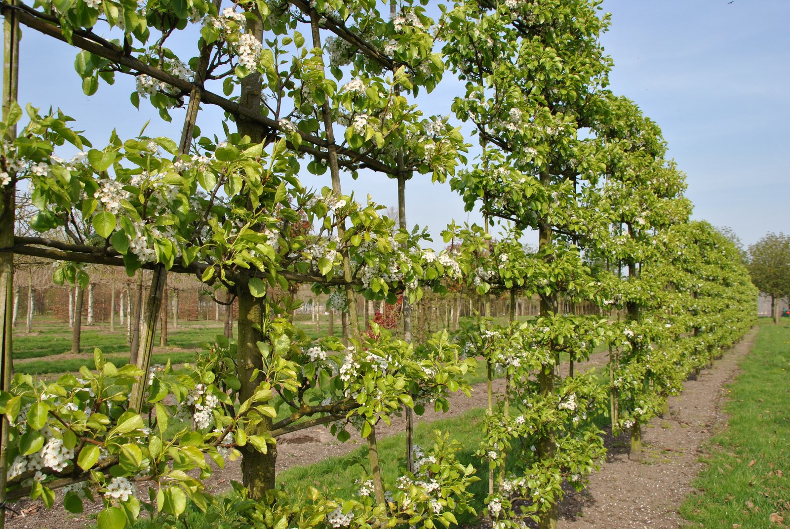 The best known espalier is the lime tree. In winter the trained ‘arms’ of this tree are clearly visible. In summer, when the leaves are on the branches, an espalier cannot always be distinguished from a shaped tree. A Carpinus betulus as a pleached screen has more or less the same shape as a youngish lime tree.