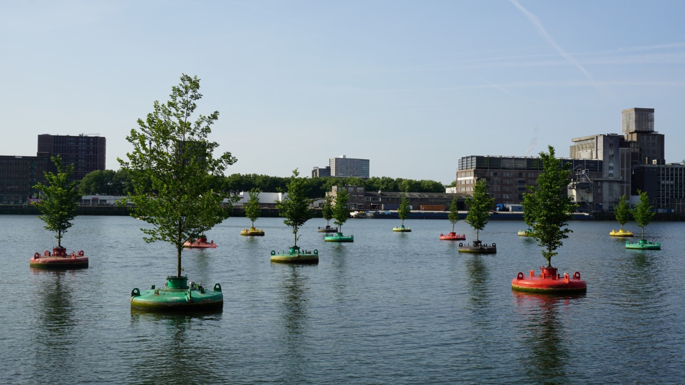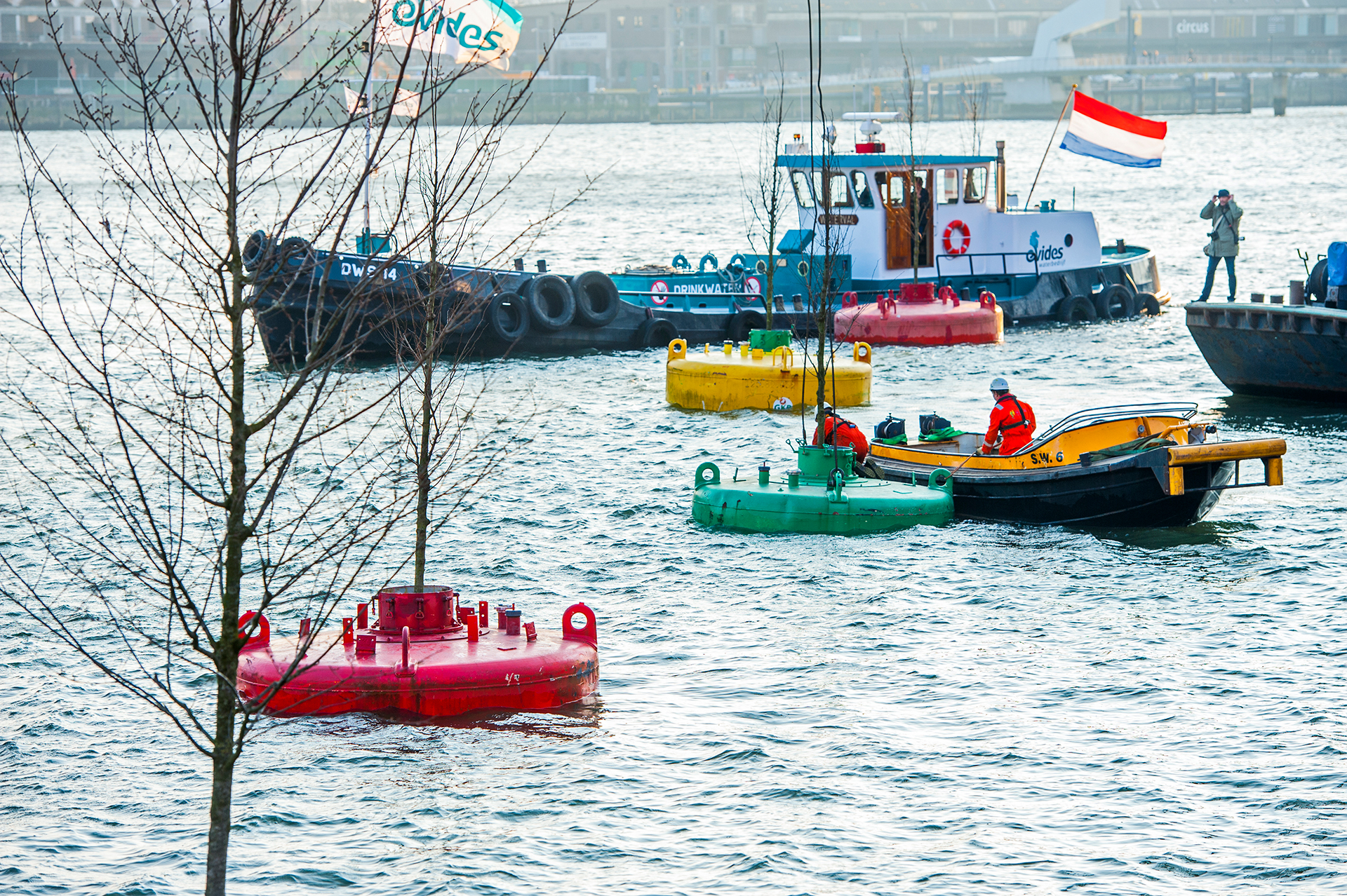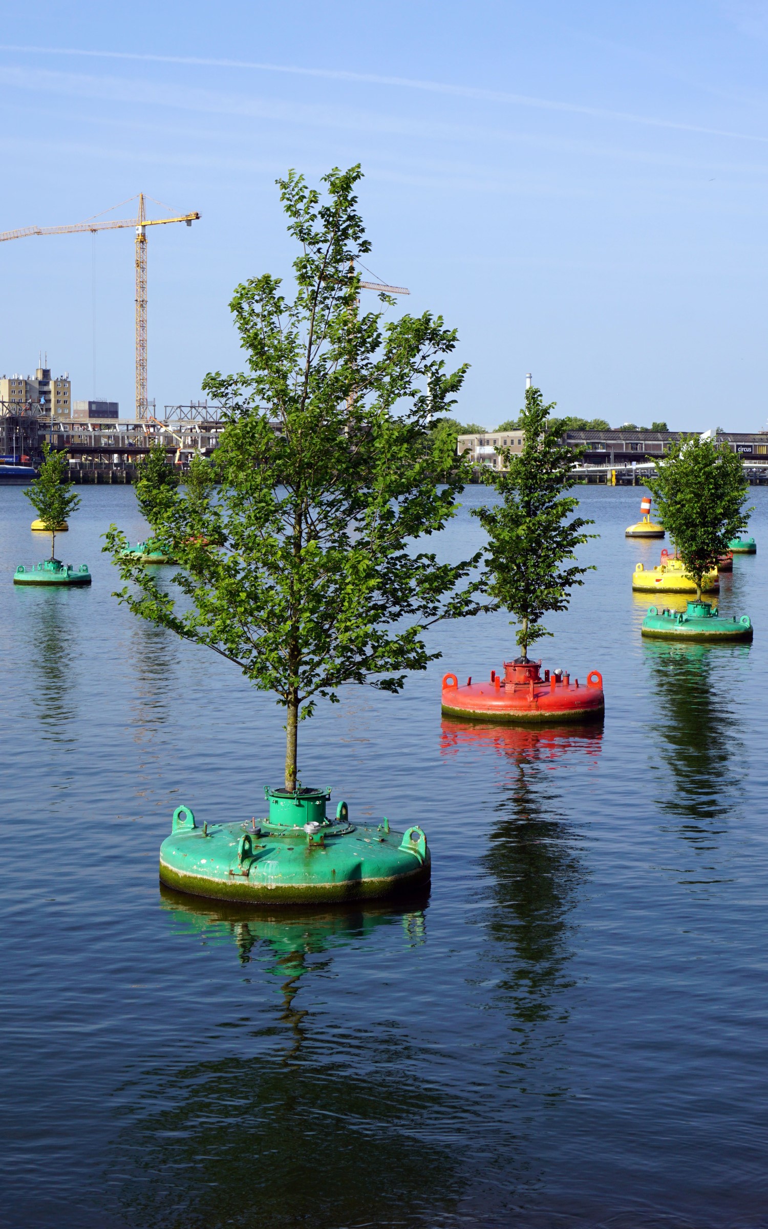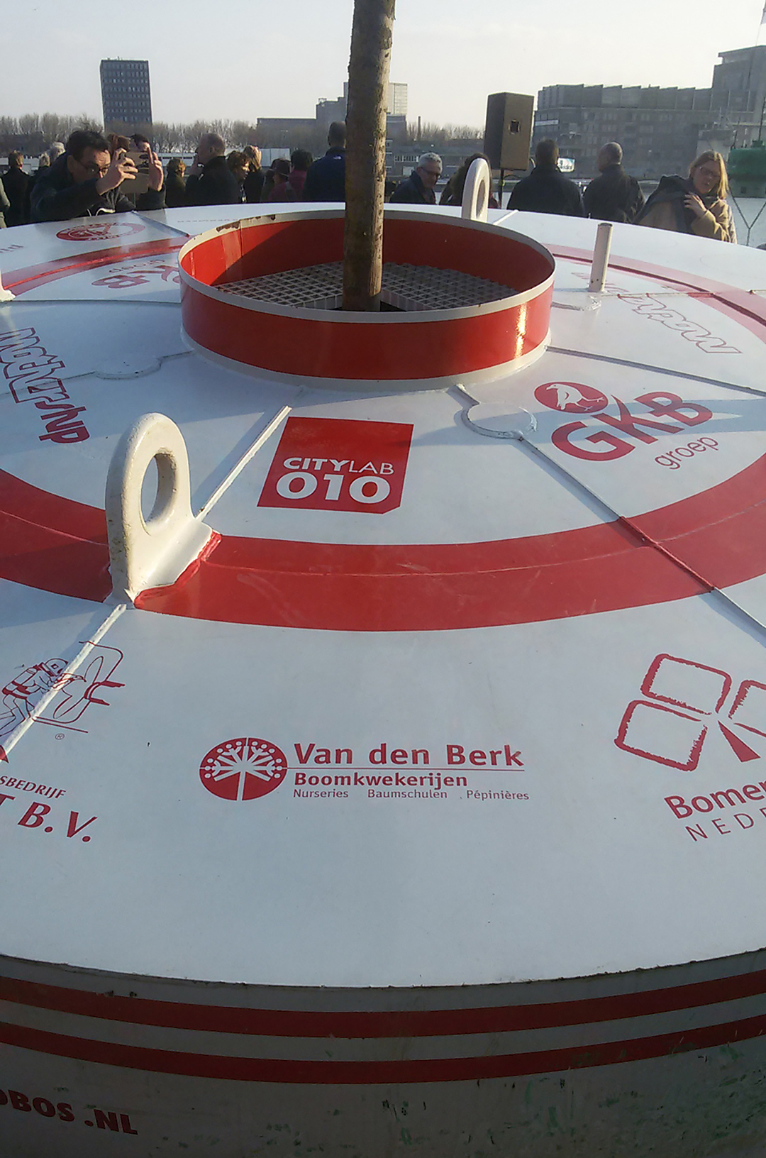 The Bobbing Forest was presented as part of the 2016 National Tree Festival in Rotterdam. The ‘forest’ was designed by art producer Mothership and calls attention to issues such as climate change and the importance of greenery in the city. It consists of 20 converted maritime buoys, each holding an elm. For at least five years, the art installation will bob around near the Nieuwe Luxor in the Rotterdam Rijnhaven. Van den Berk Nurseries is sponsoring the project and supplied the elms: Ulmus ‘Dodoens’ in size 25-30. The trees were planted by GKB-Barendrecht.