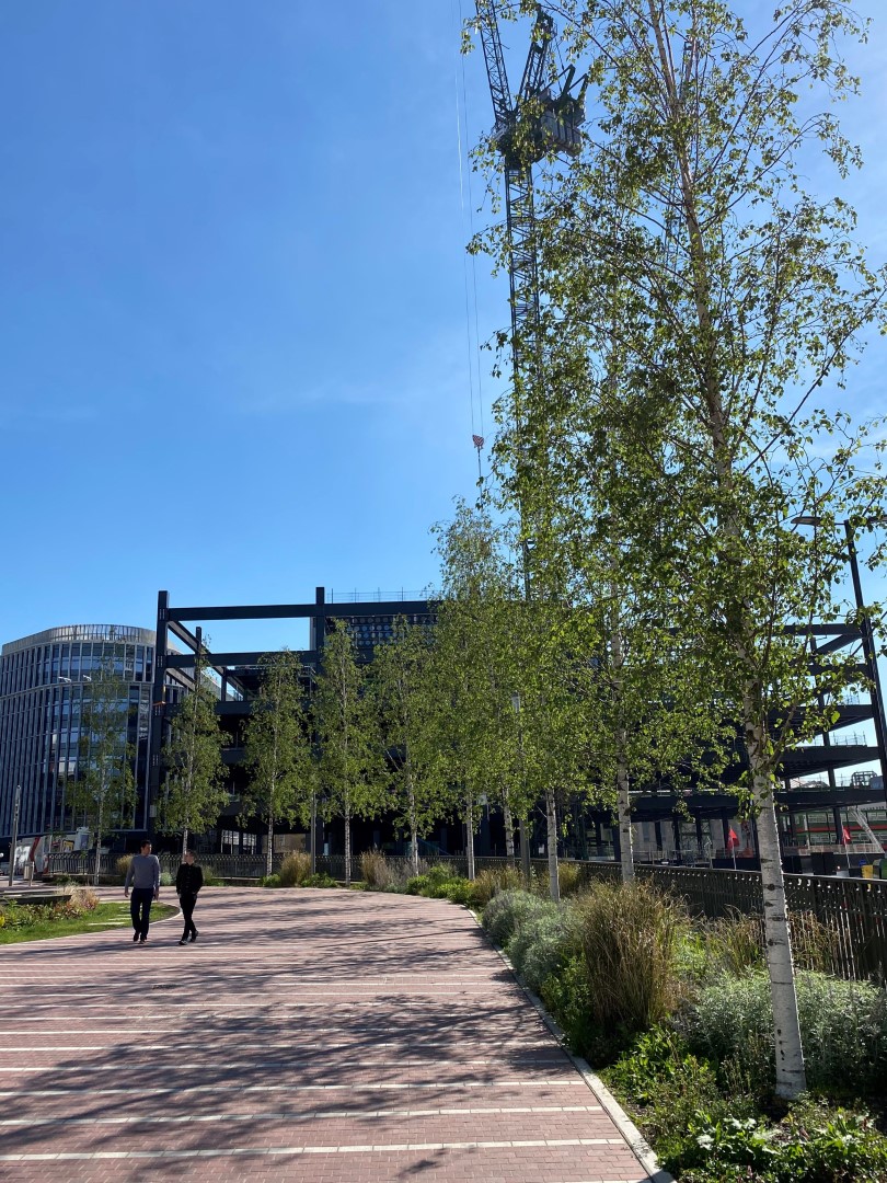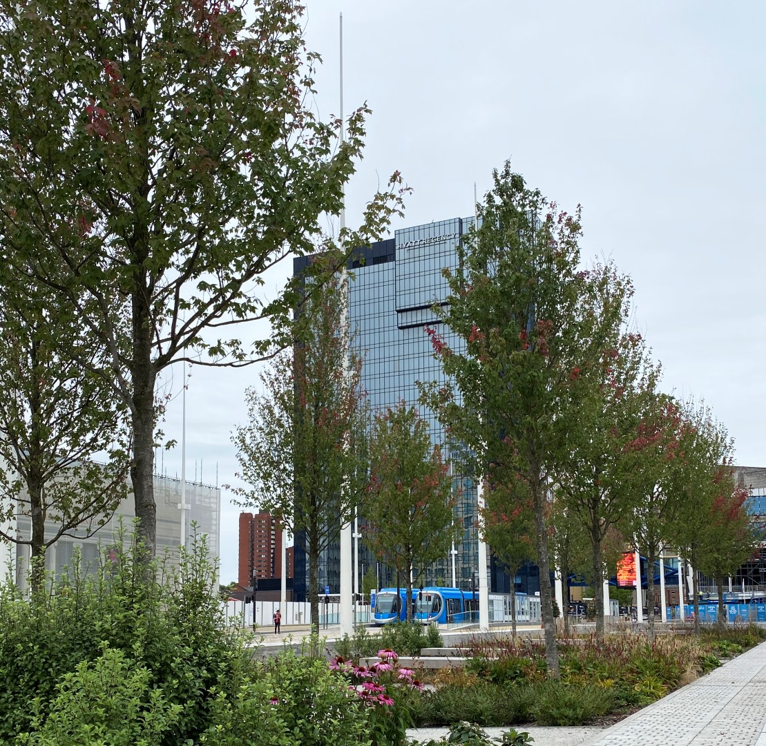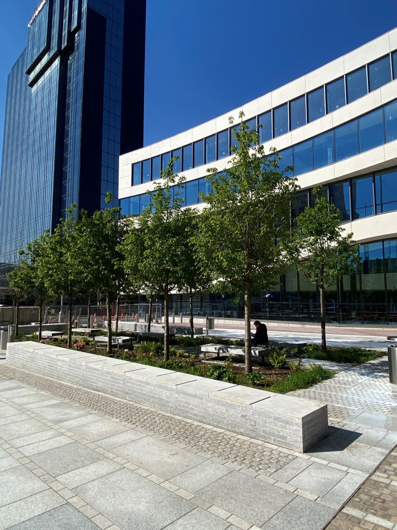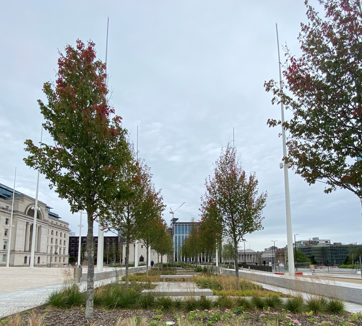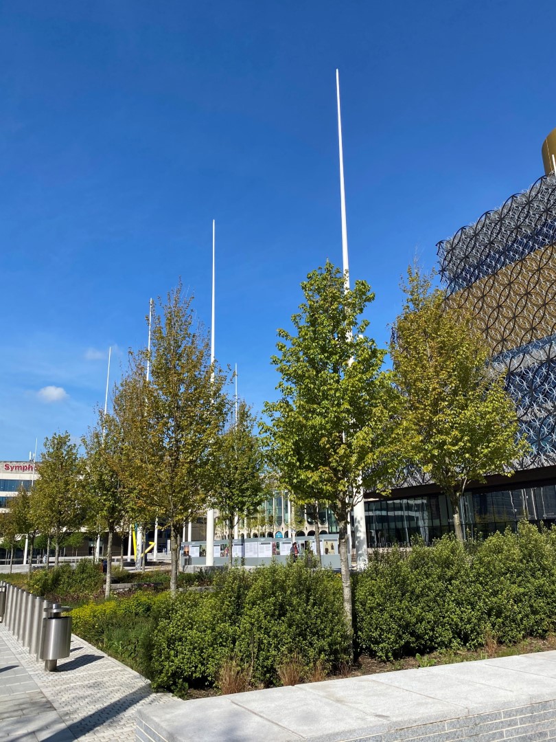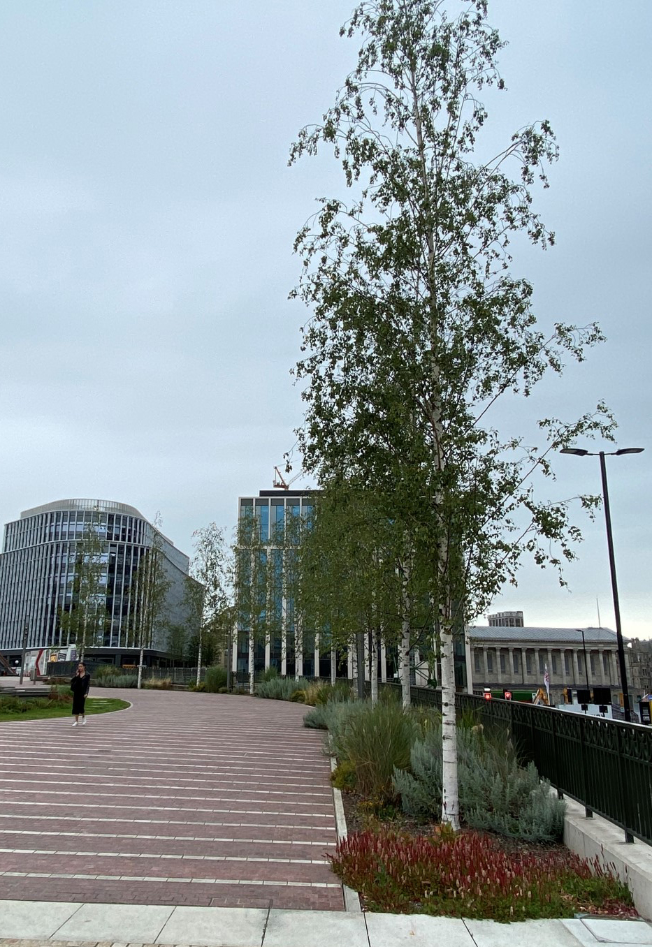 A beautiful combination of trees, water and modern architecture in the historic center of Birmingham. Acer rubrum 'Sun Valley', Ginkgo biloba and Betula pendula, all in size 50-60, were planted by Killingley NT in winter and spring 2018. The photos are taken in August 2019 and spring 2021
