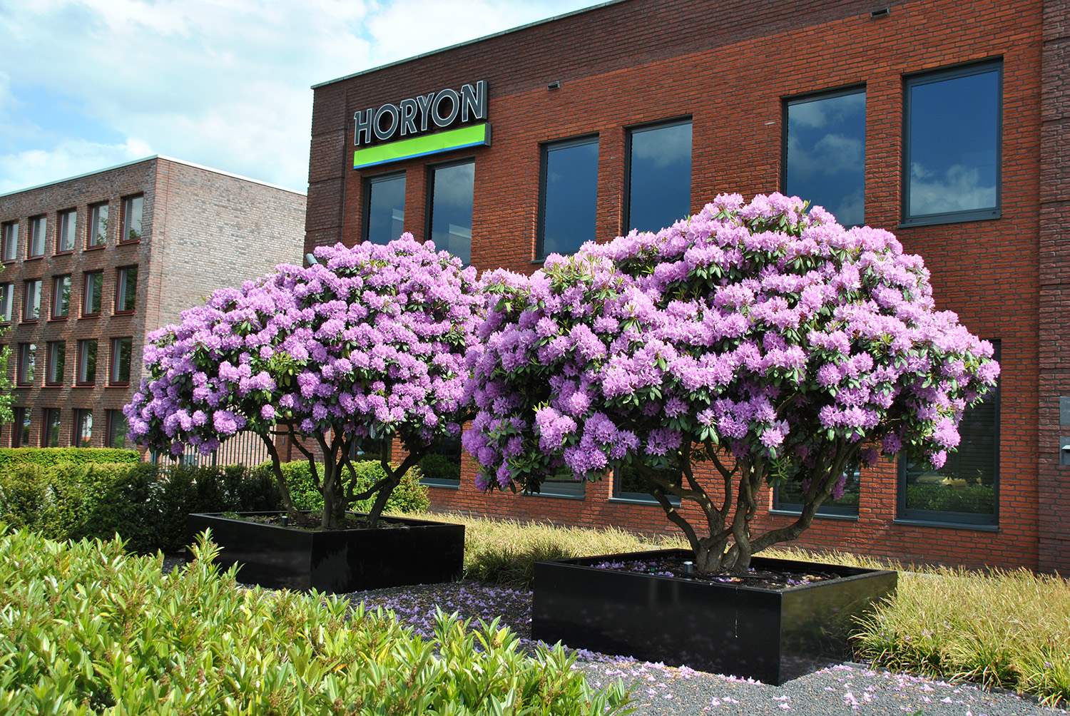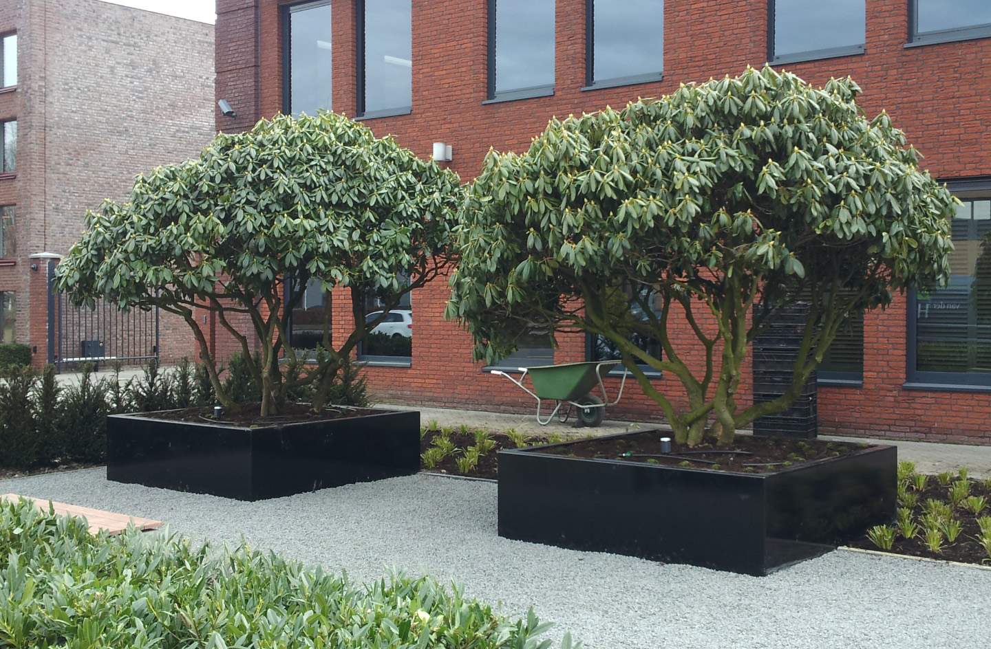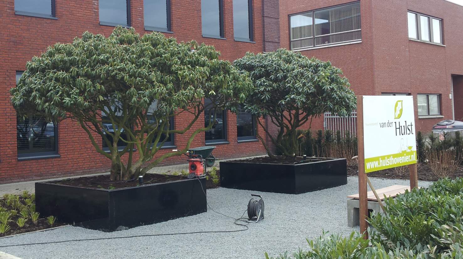 The owner of a business building in Eindhoven wanted to ameliorate the appearance of his building and make the entrance more attractive. In consultation was chosen for the planting of four large rhododendrons in planters. These plants require little maintenance, are green all year round and bloom abundantly in May. This is the specie 'English Roseum', with a width of 250-300 cm and a height of 225-250 cm.