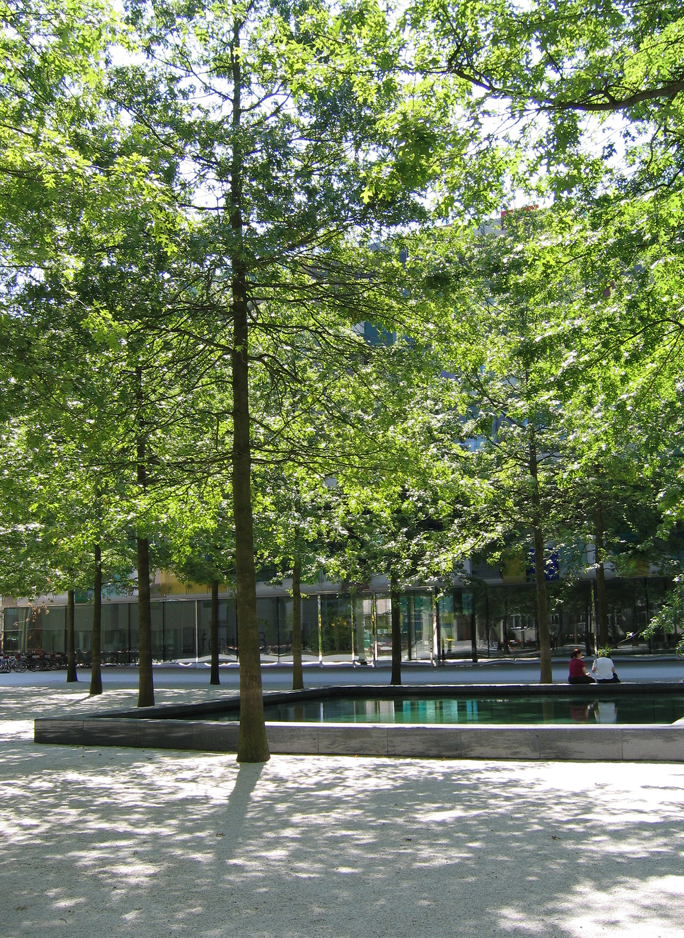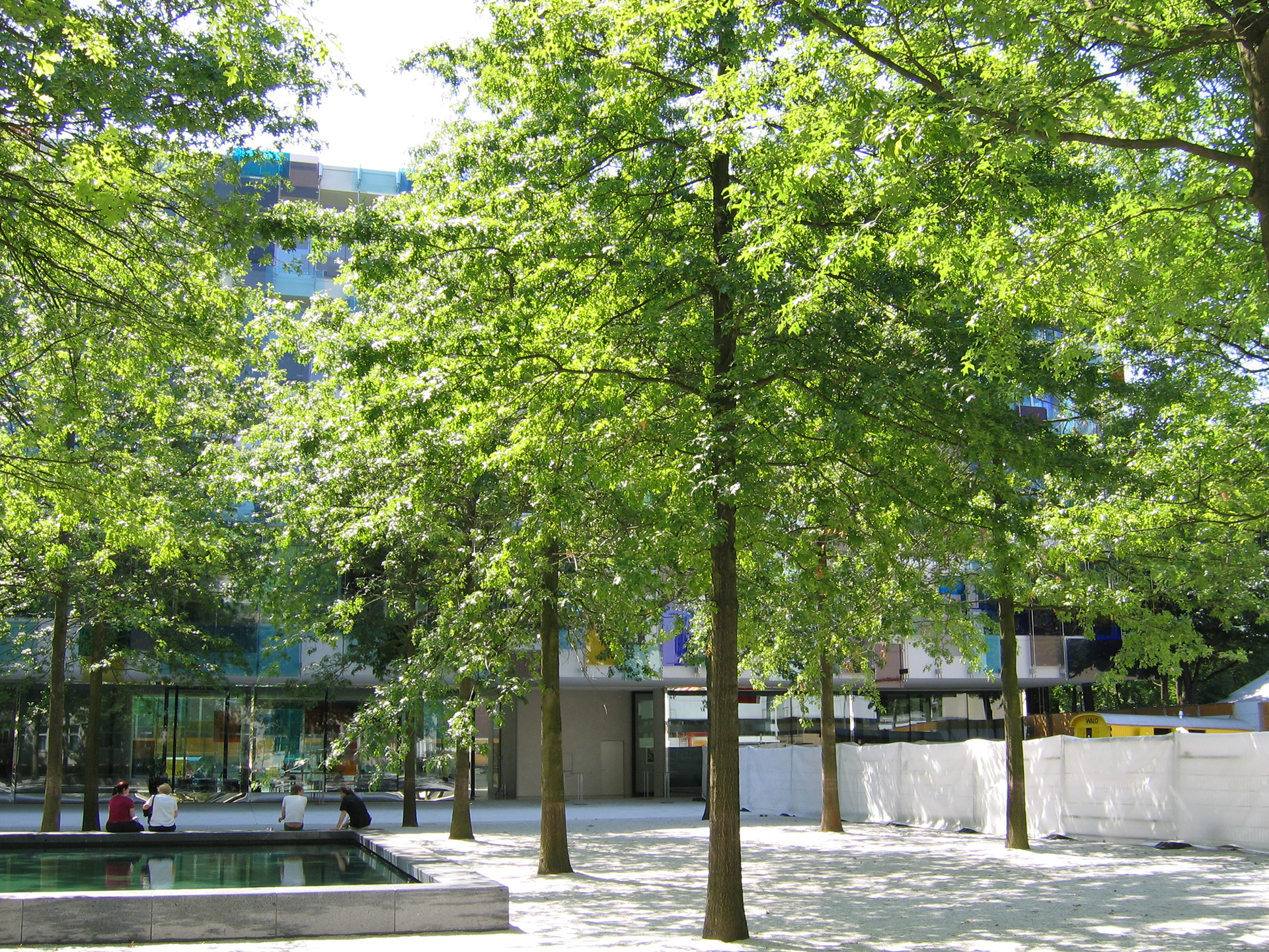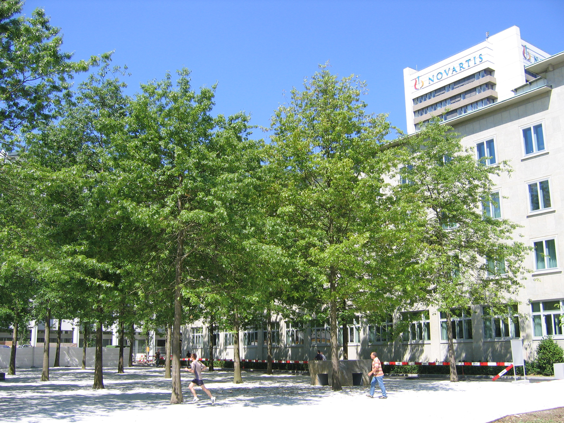In the spring of 2006 Van den Berk Nurseries delivered 35 Quercus palustris with a trunk diameter of 100 – 120 cm for the new campus of the head office of the Novartis pharmaceuticals concern in Basel, Switzerland. Each tree was delivered separately with a special vehicle and planted with a telescopic crane. The trees are arranged in a tight lattice formation parallel to the management offices and surround the square known as The Forum. The entire square consists of white split granite chips and is bordered with white granite panels. A Koi carp pond is situated in the middle of the trees.