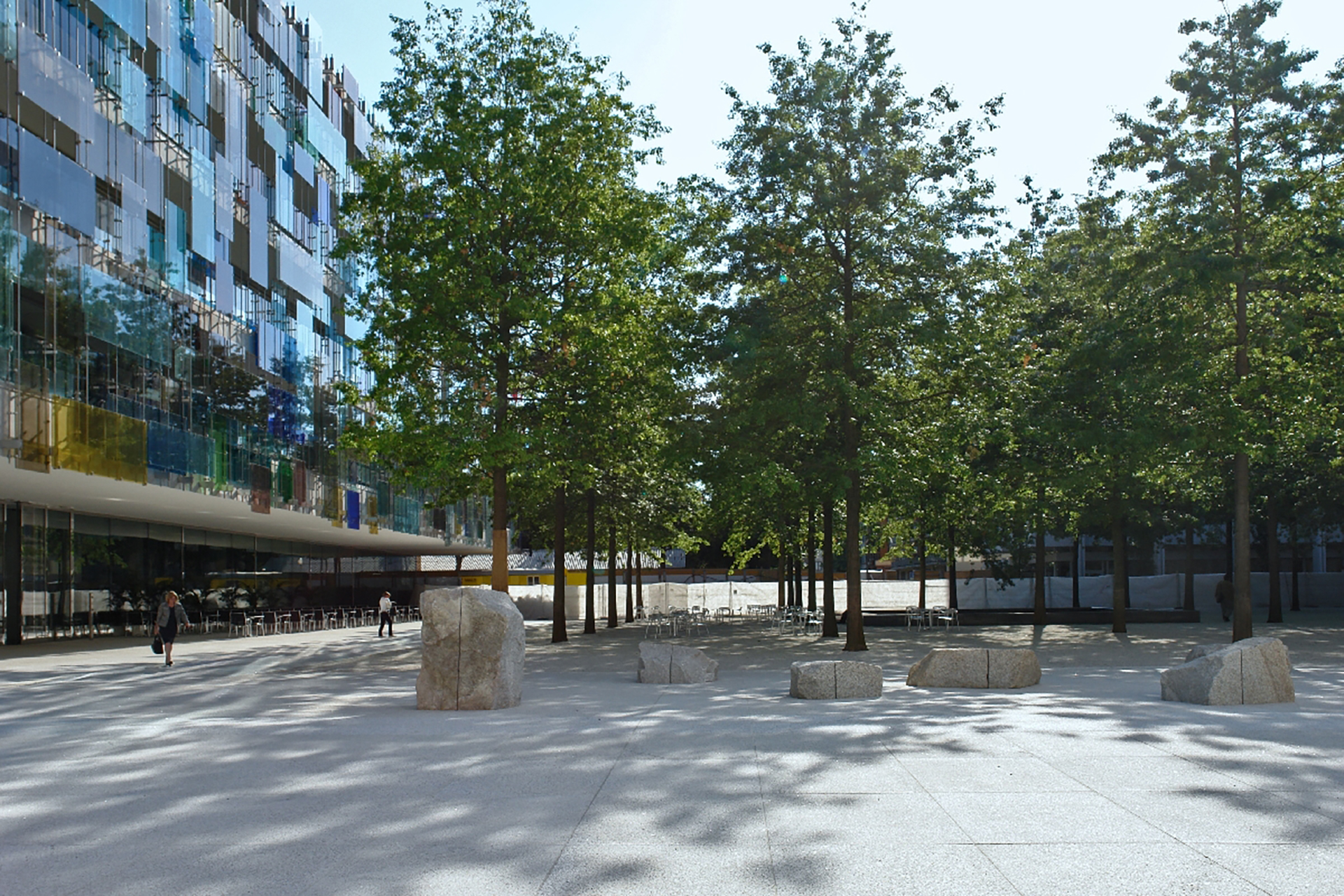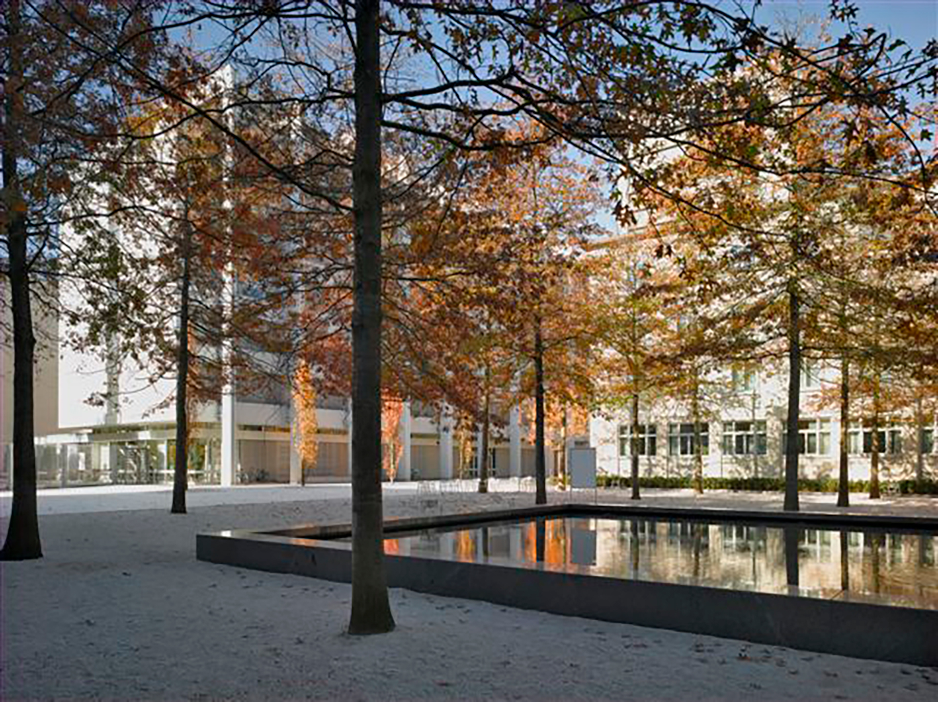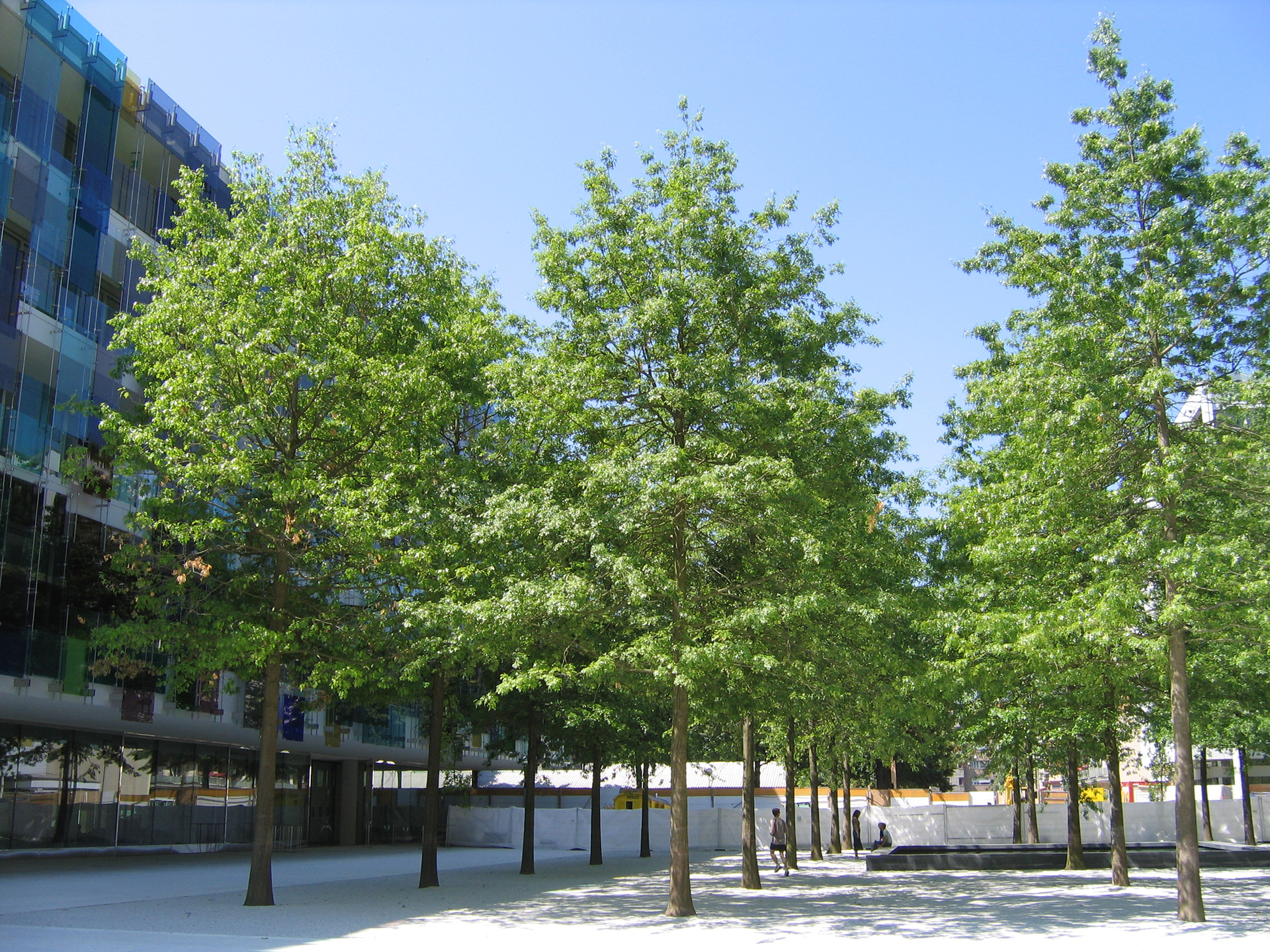 In the spring of 2006 Van den Berk Nurseries delivered 35 Quercus palustris with a trunk diameter of 100 – 120 cm for the new campus of the head office of the Novartis pharmaceuticals concern in Basel, Switzerland. Each tree was delivered separately with a special vehicle and planted with a telescopic crane. The trees are arranged in a tight lattice formation parallel to the management offices and surround the square known as The Forum. The entire square consists of white split granite chips and is bordered with white granite panels. A Koi carp pond is situated in the middle of the trees.