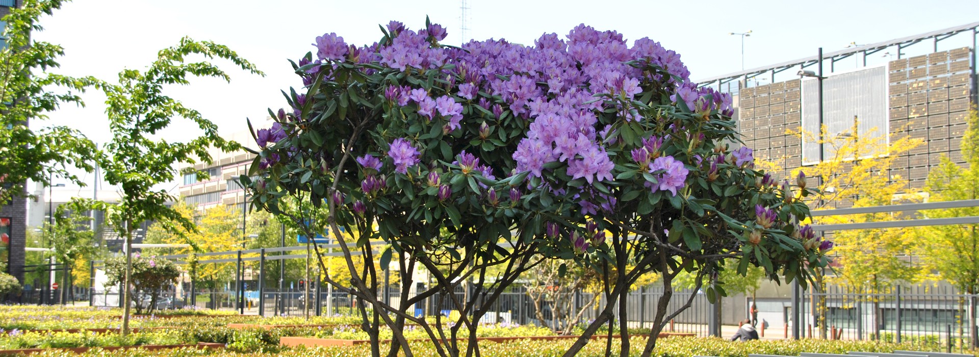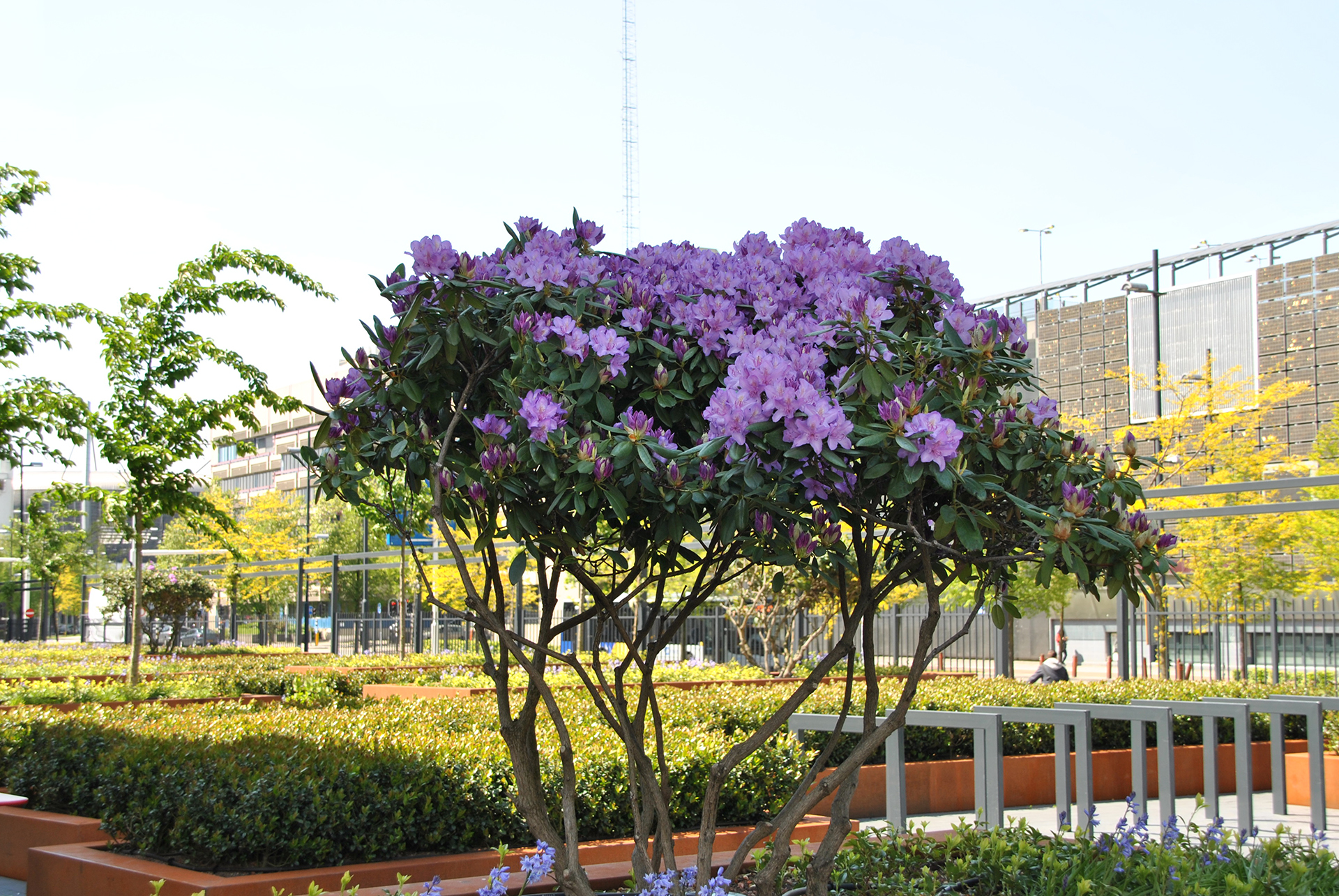 De Witte Dame is a restored factory building on Emmasingel in the centre of Eindhoven. It was built in 1928-1931 under the auspices of architect Dirk Roosenburg in the style of the New Objectivity. Philips used the building from the beginning as a manufacturing plant for making light bulbs. In the eighties the building was left empty as Philips moved production abroad. Philips wanted to demolish the building but the local authority wouldn’t grant permission for them to do so. The building was renovated and now houses facilities such as the Design Academy, a library and a grand café. Beneath the square, there is a parking garage, so before planting, special arrangements had to be made in the form of raised tubs. Buro Lubbers signed up to do the design and Du Pré Groenpojecten for carrying out the works. Elongated weathering steel tubs were used to hold parasol-shaped Rhododendron catawbiense ‘Boursault’ for its silhouette and evergreen aspect and Prunus yedoensis for its abundant flowering in spring. Immediately in front of the terrace, there are Ginkgo biloba, planted for their attractive autumn colouring.