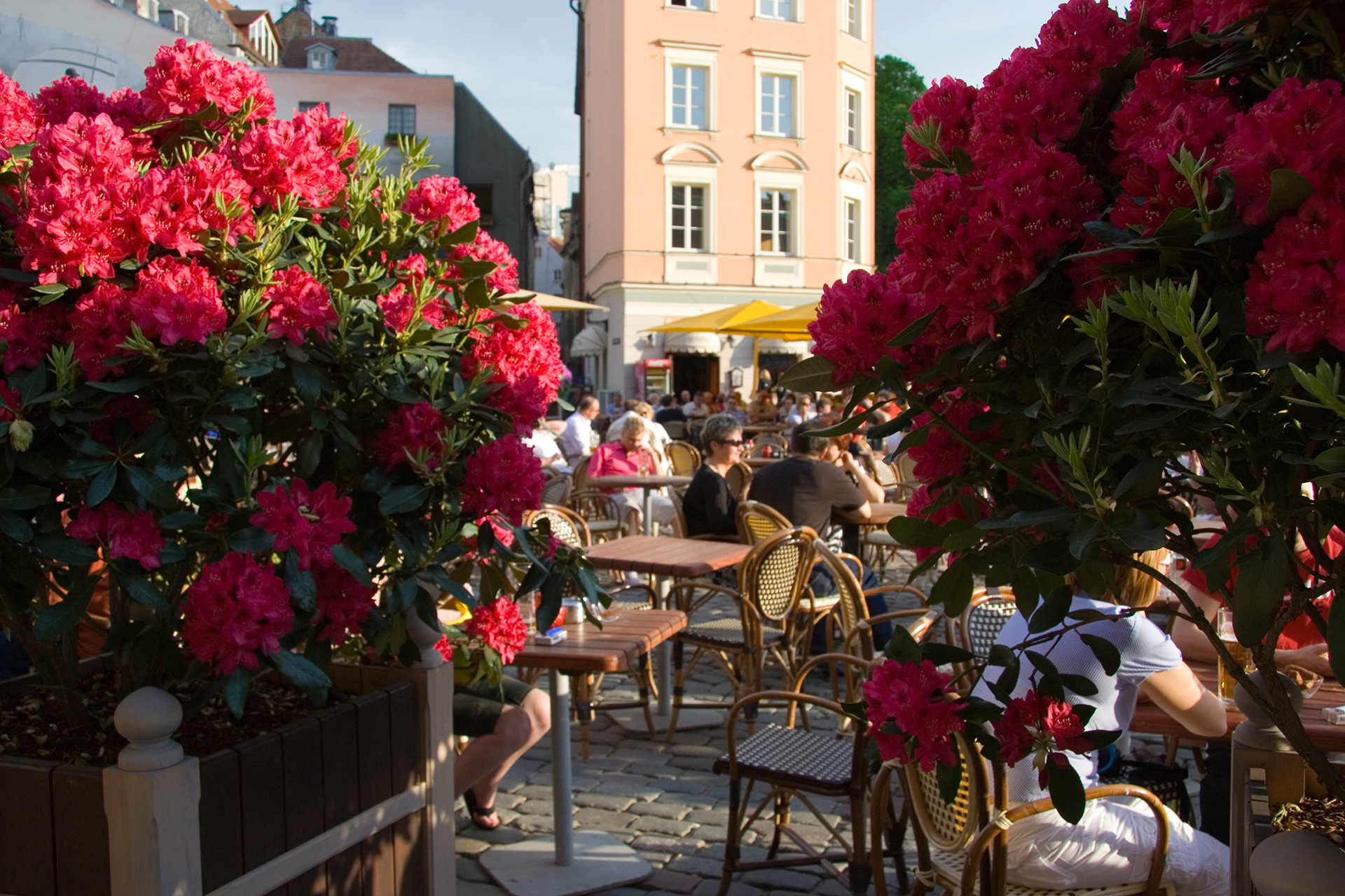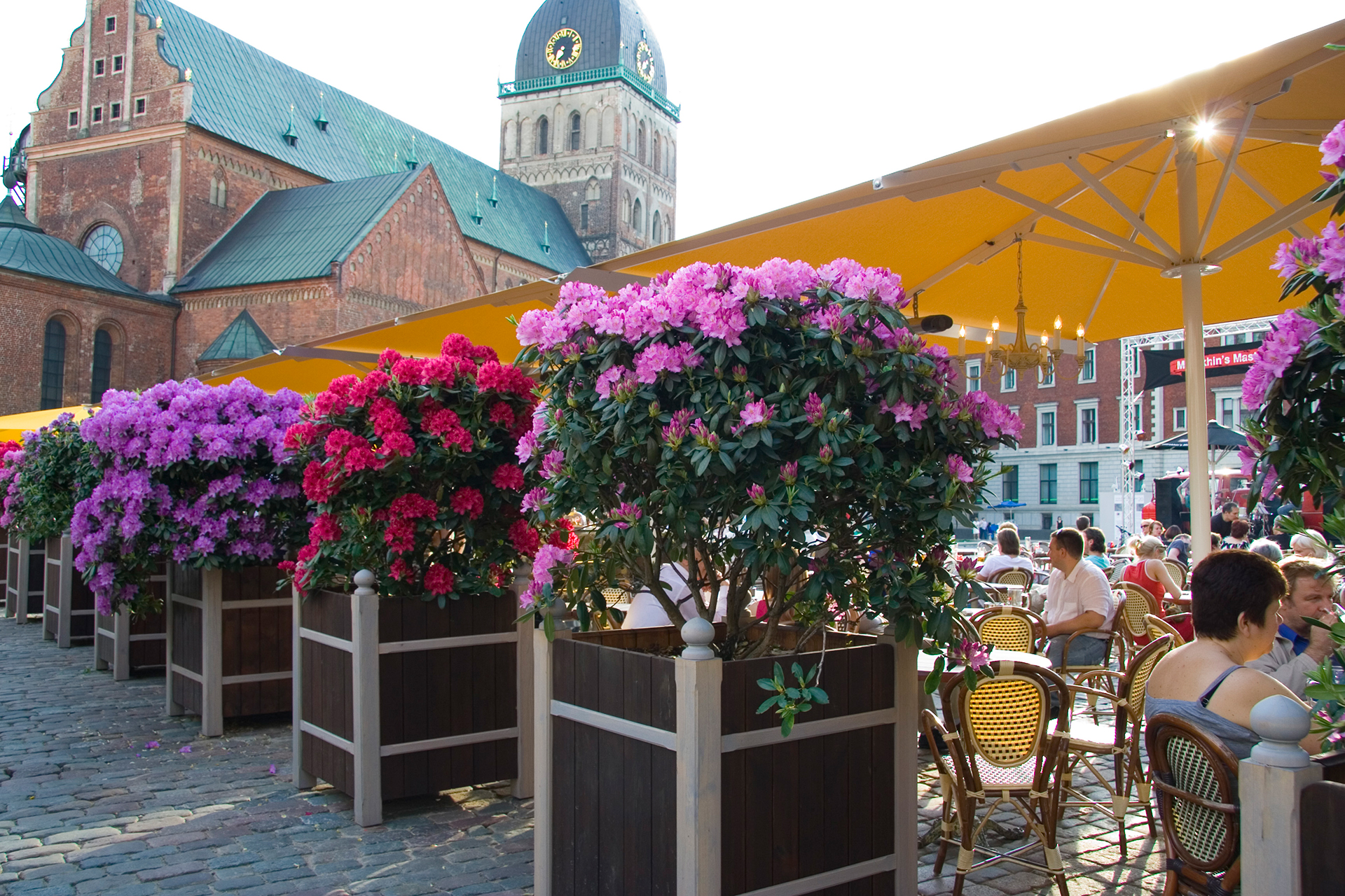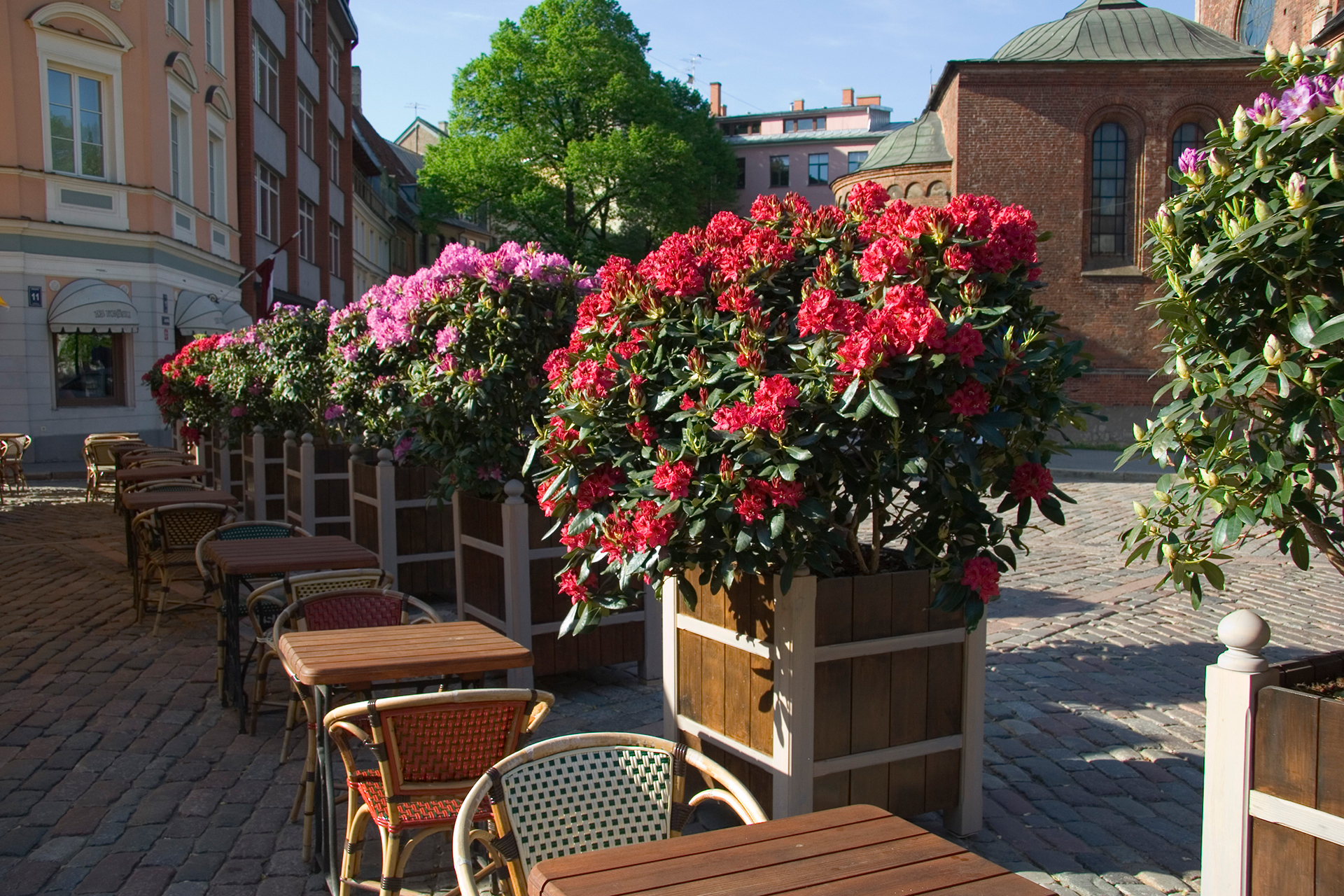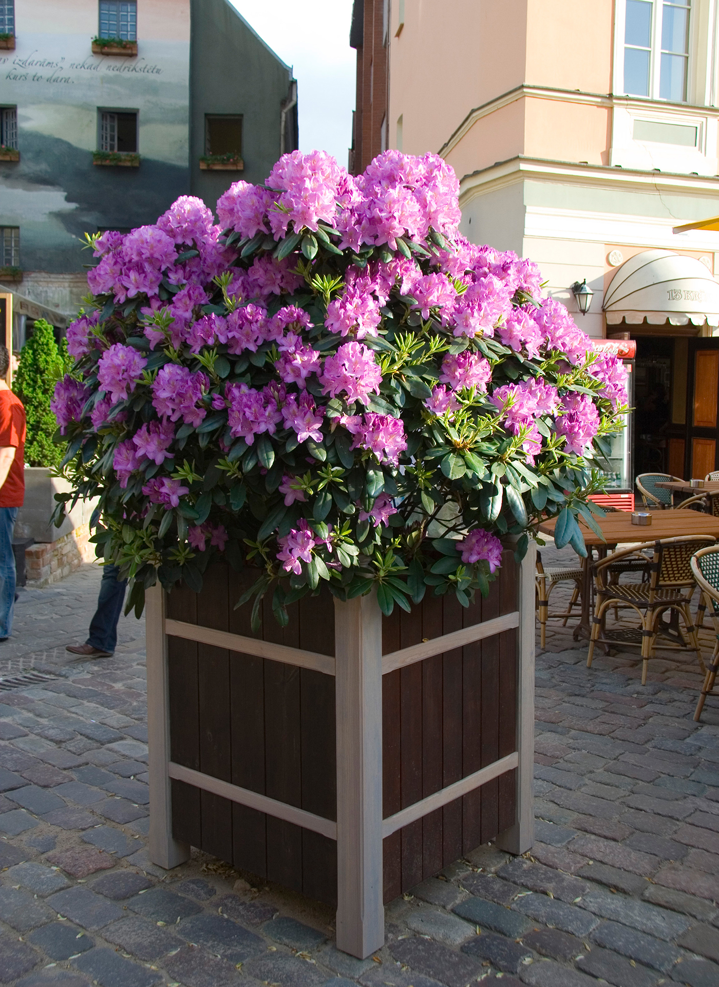 In 2010, Van den Berk Rhododendron GmbH supplied 58 rhododendrons measuring 60 cm to 120 cm high for the central square in Riga. These trees were planted in containers to brighten up the square and to function as boundaries for the many outdoor cafés. The photos show the species Rhododendron ‘Cat. Boursault’, Rhododendron ‘Cat. Grandiflorum’, Rhododendron ‘English Roseum’ and Rhododendron ‘Nova Zembla’.