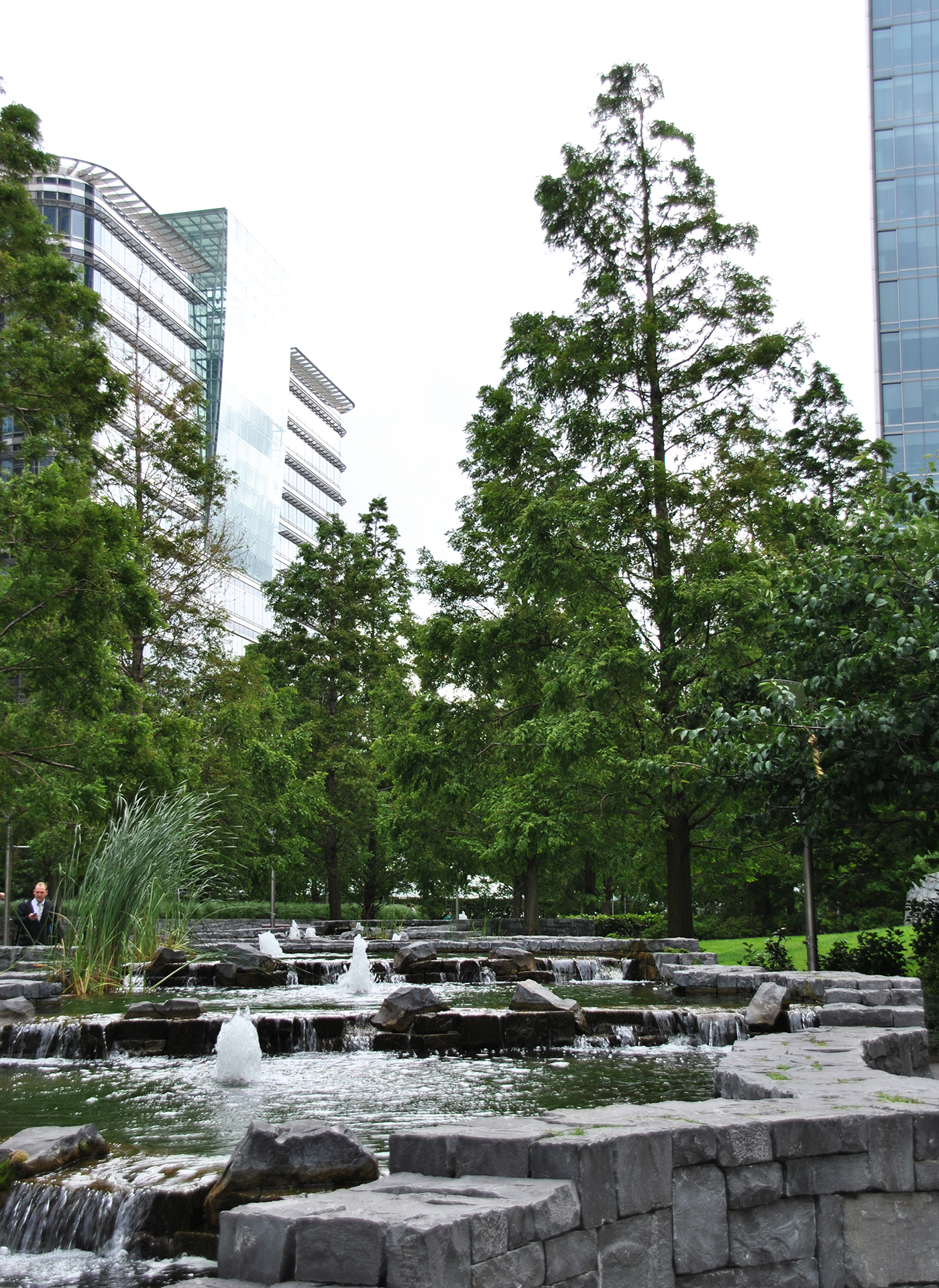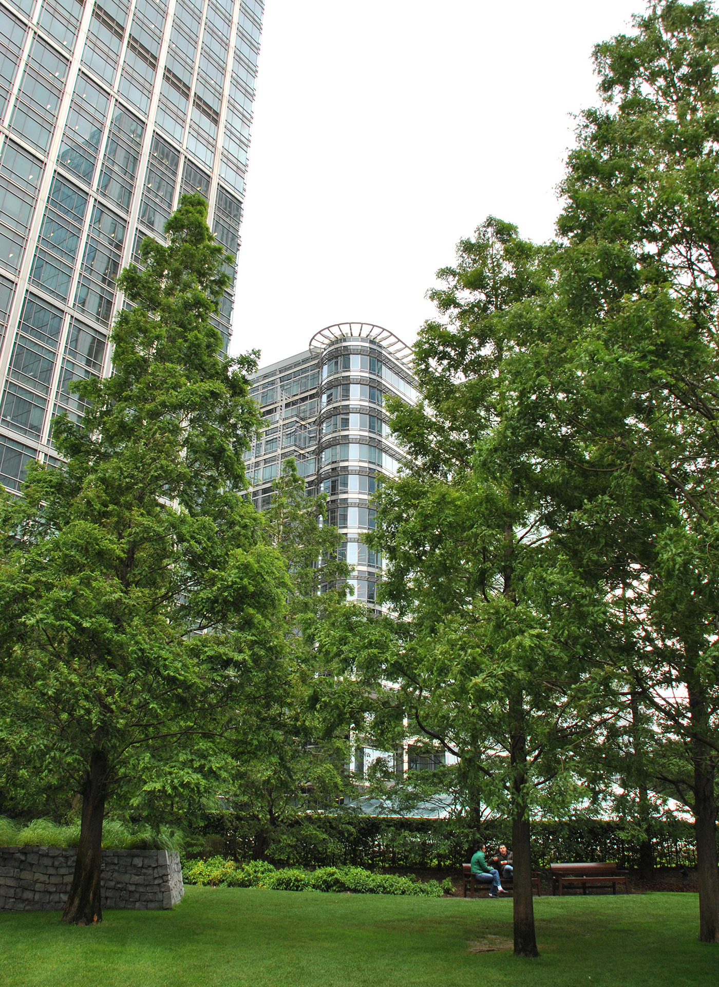 This park was created in order to function as a green buffer zone between various, extremely tall, office buildings overlooking the river Thames. Each day, the Tube station in the middle of the park handles thousands of commuters who can stop and rest amongst the Metasequoia trees in this green oasis. The tallest of these trees are 12 to 14 metres high.