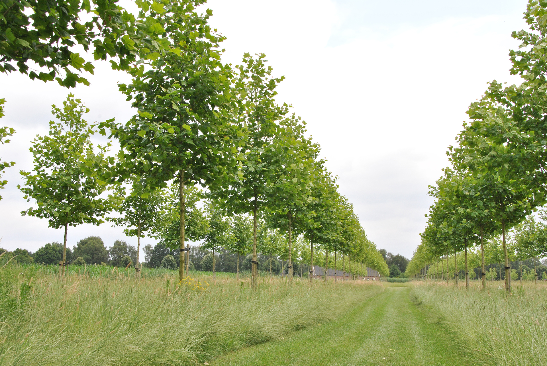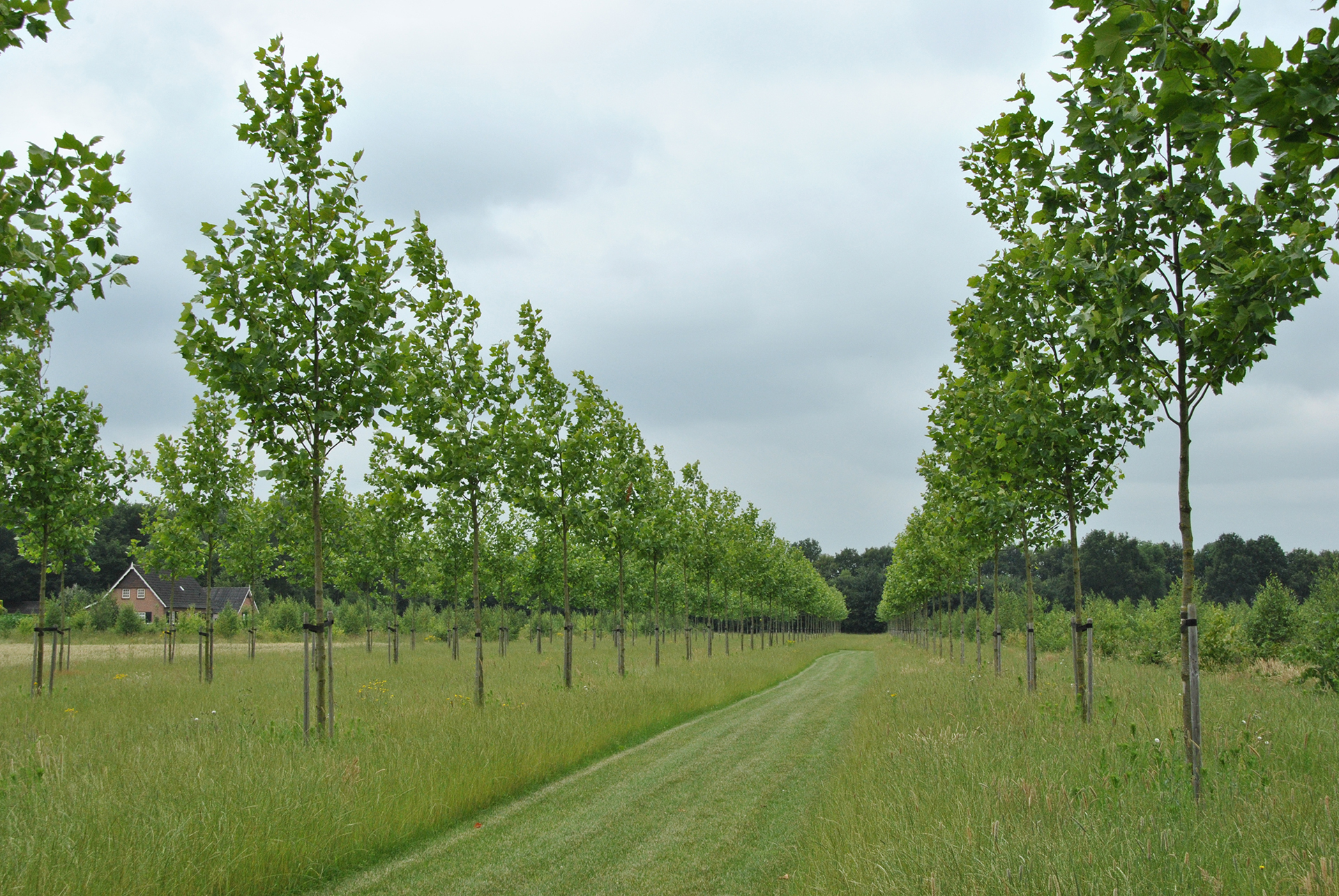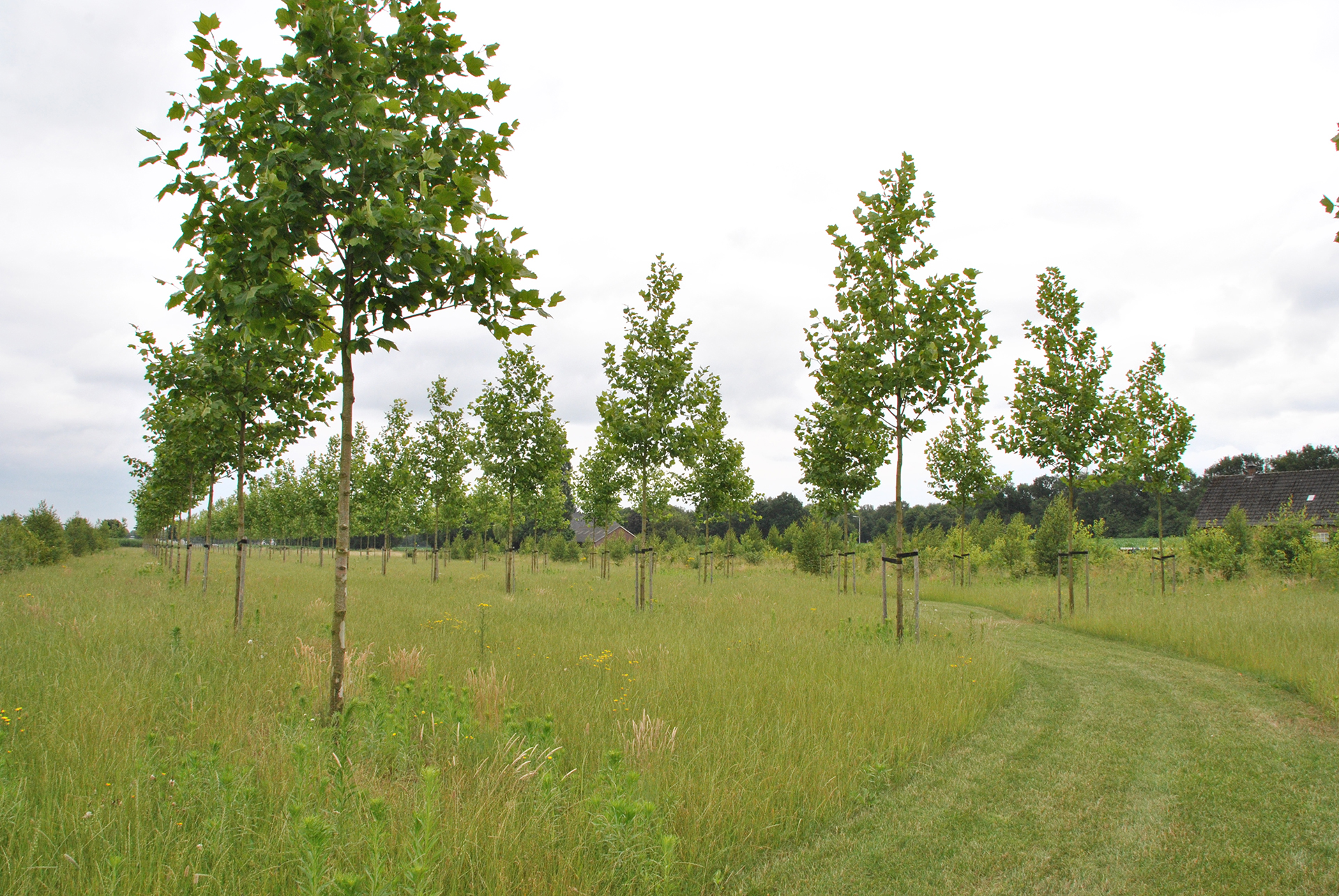 With the permission of the local authority, a new estate is being created on the meadows of a former cattle farmer. 450 sycamores with trunk size 14-16 were supplied by Van den Berk and planted mechanically with the aid of nursery machinery. The photos date back to three years after planting and the growth is looking good. The forestry stock consisting of trees such as oaks, birches, ornamental cherries, alders, holly and ornamental apple trees is also coming on well.