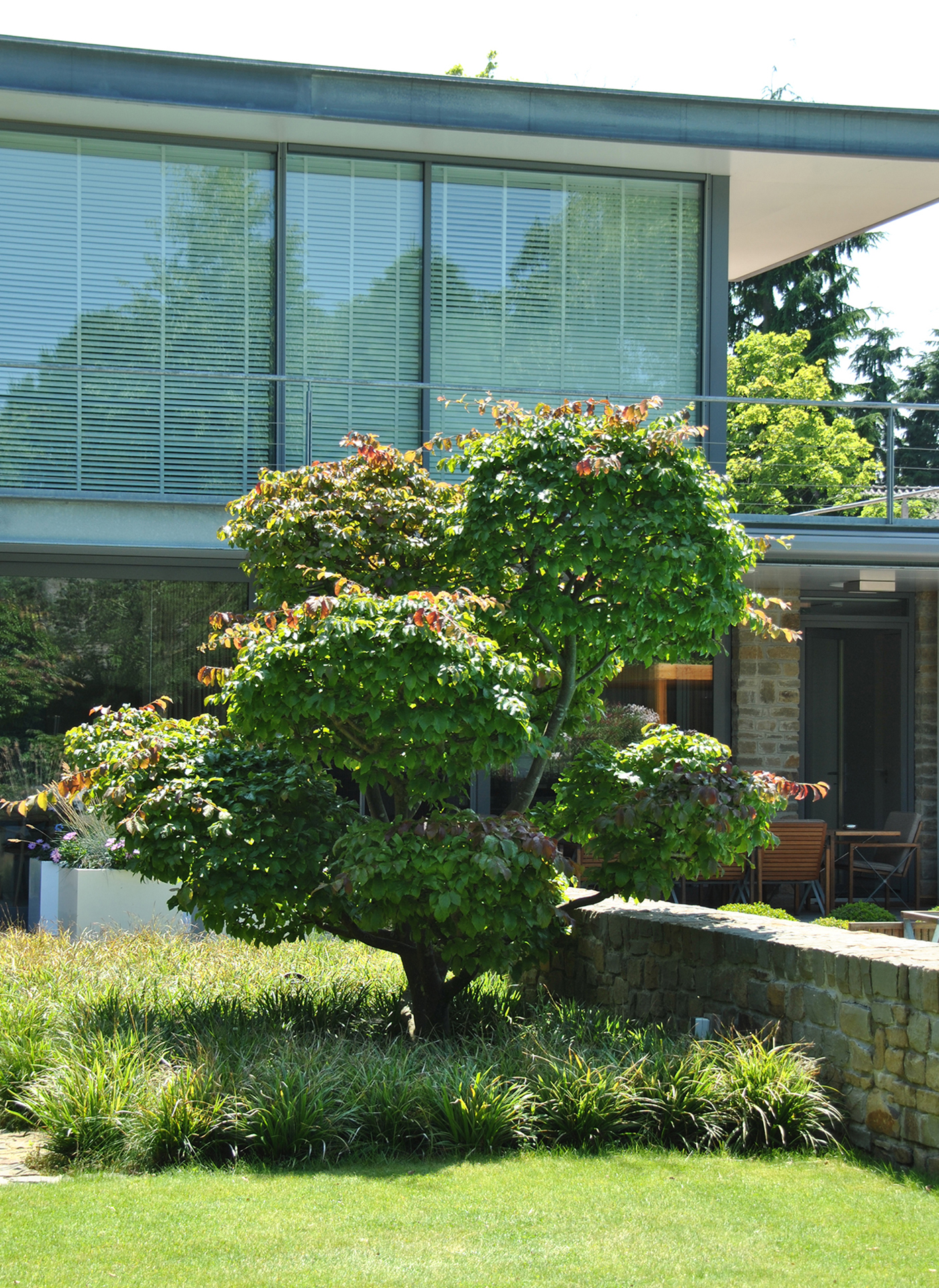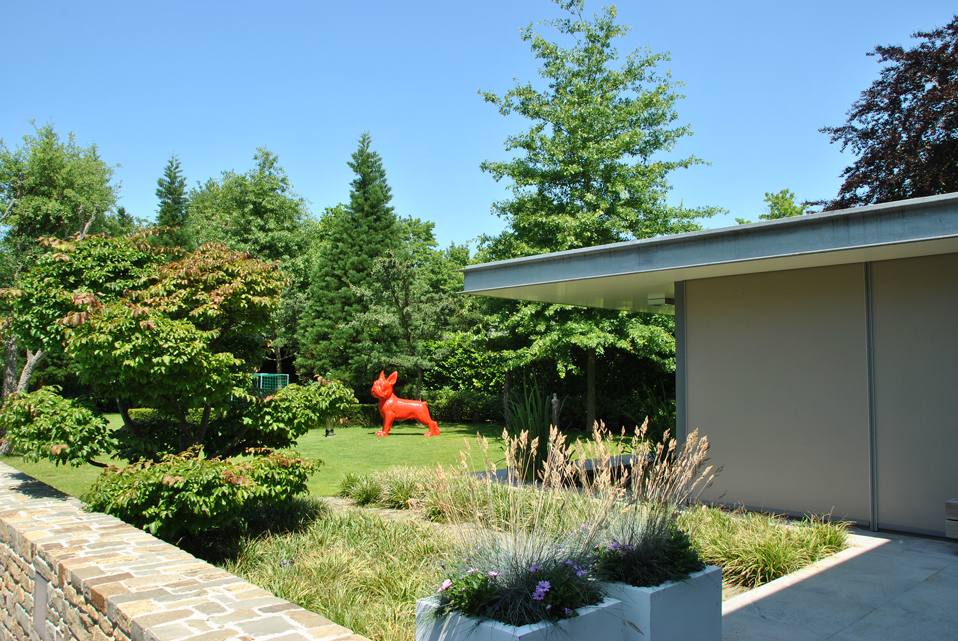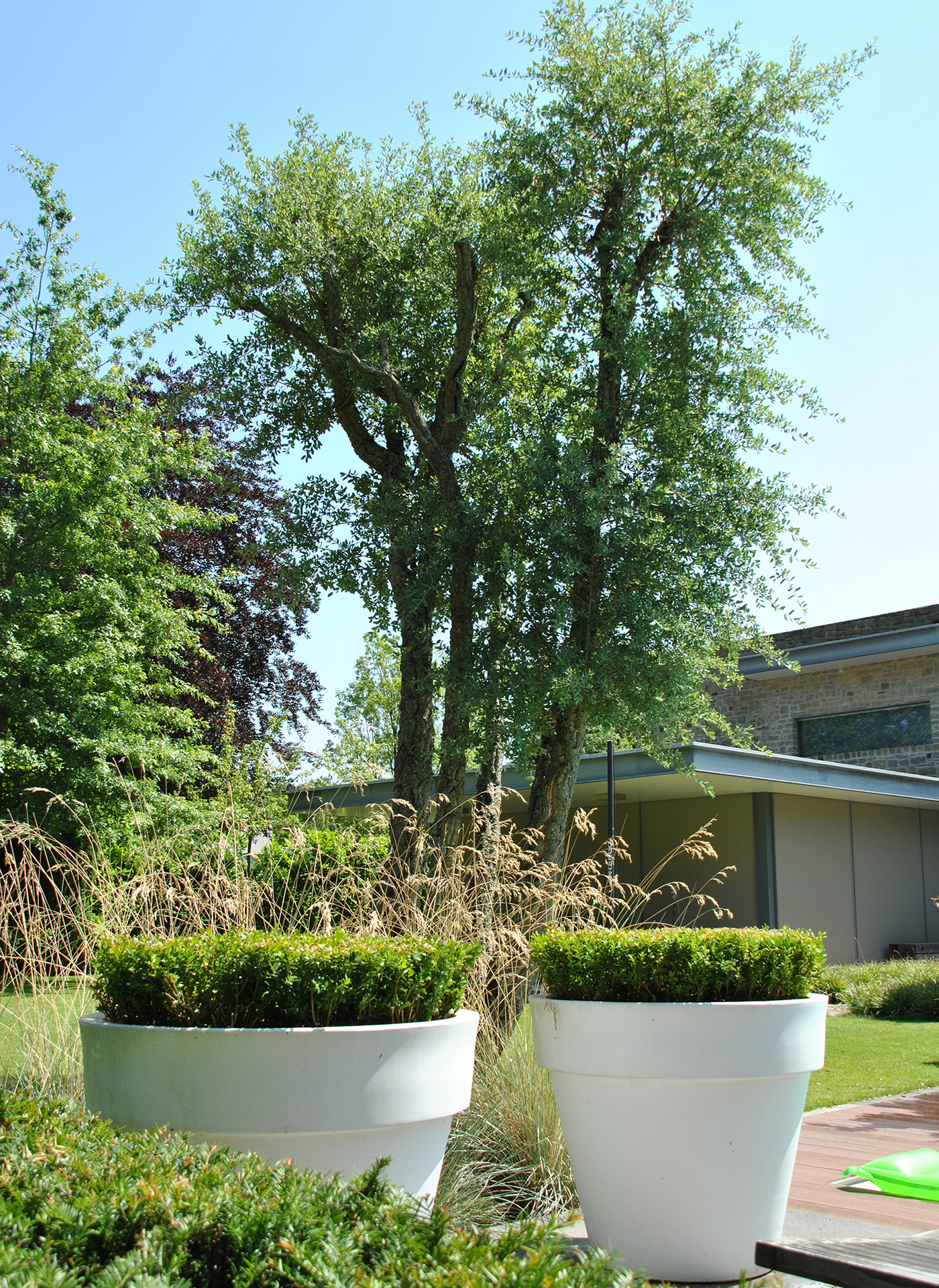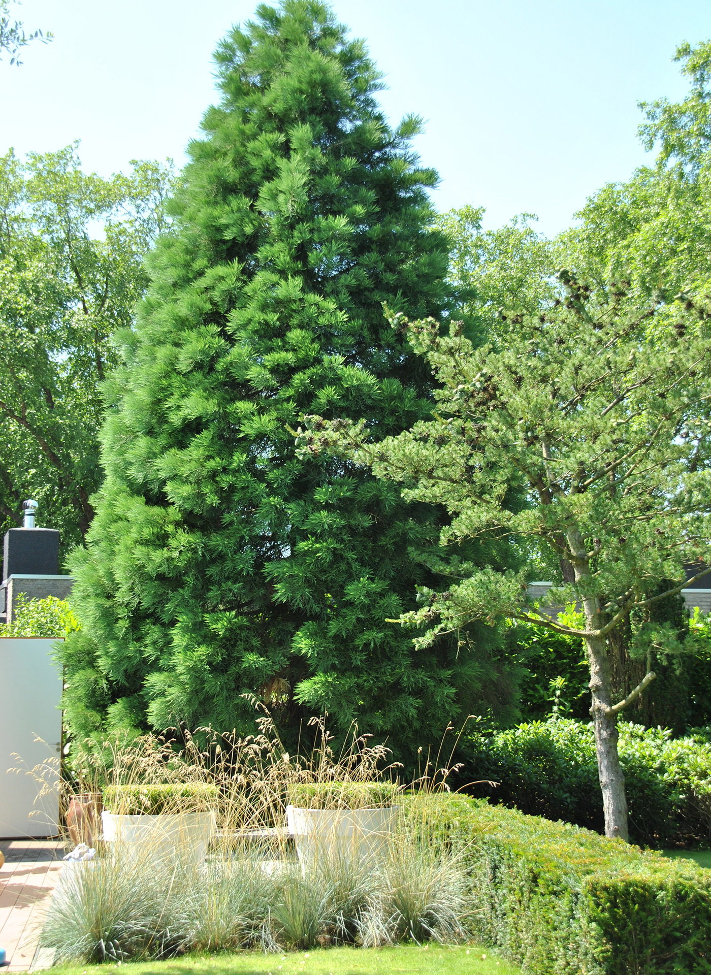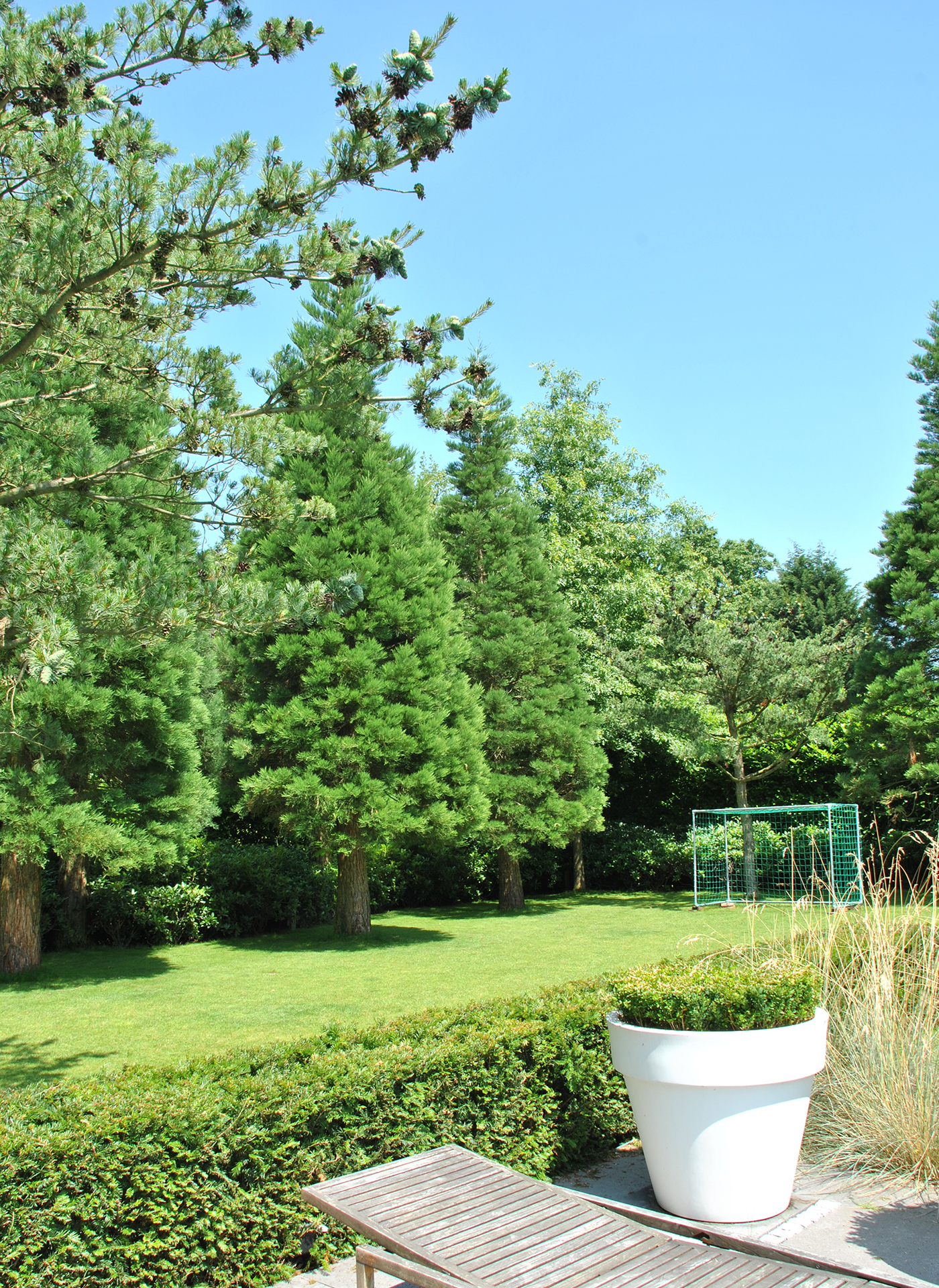 The owners of this garden in a residential area in Brabant were keen on having some privacy. Tuintechnisch Bureau Smeulders signed up for the design came to the nursery with their client to find substantial trees to block the view of their rear neighbours. They opted for Sequoiadendron giganteum (giant redwood), which stays green in winter. Other trees include a swamp oak, a cork oak and a Parrotia persica macro bonsai as an eye-catcher. There are large groups including evergreen rhododendrons around the perimeter. The trees were hoisted over the house using a telescopic crane. After planting, the garden already looked as though it was years old.