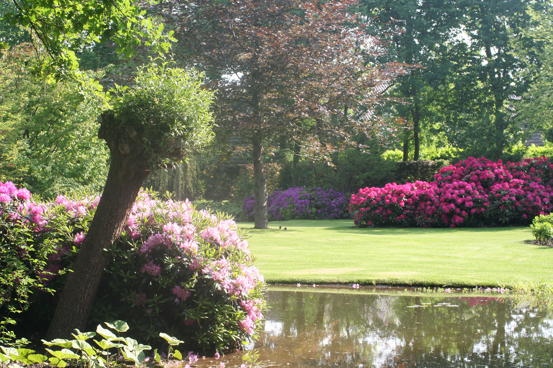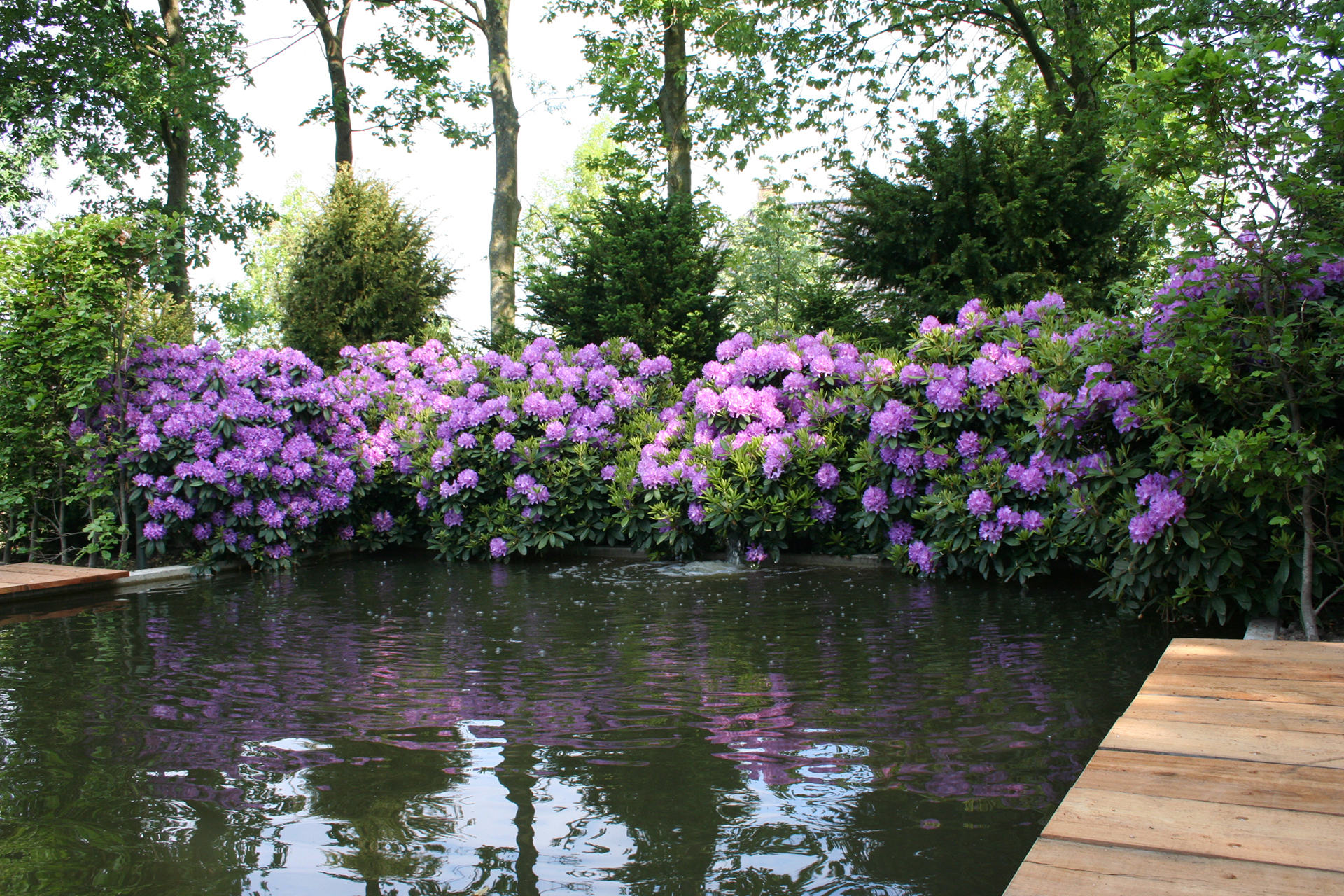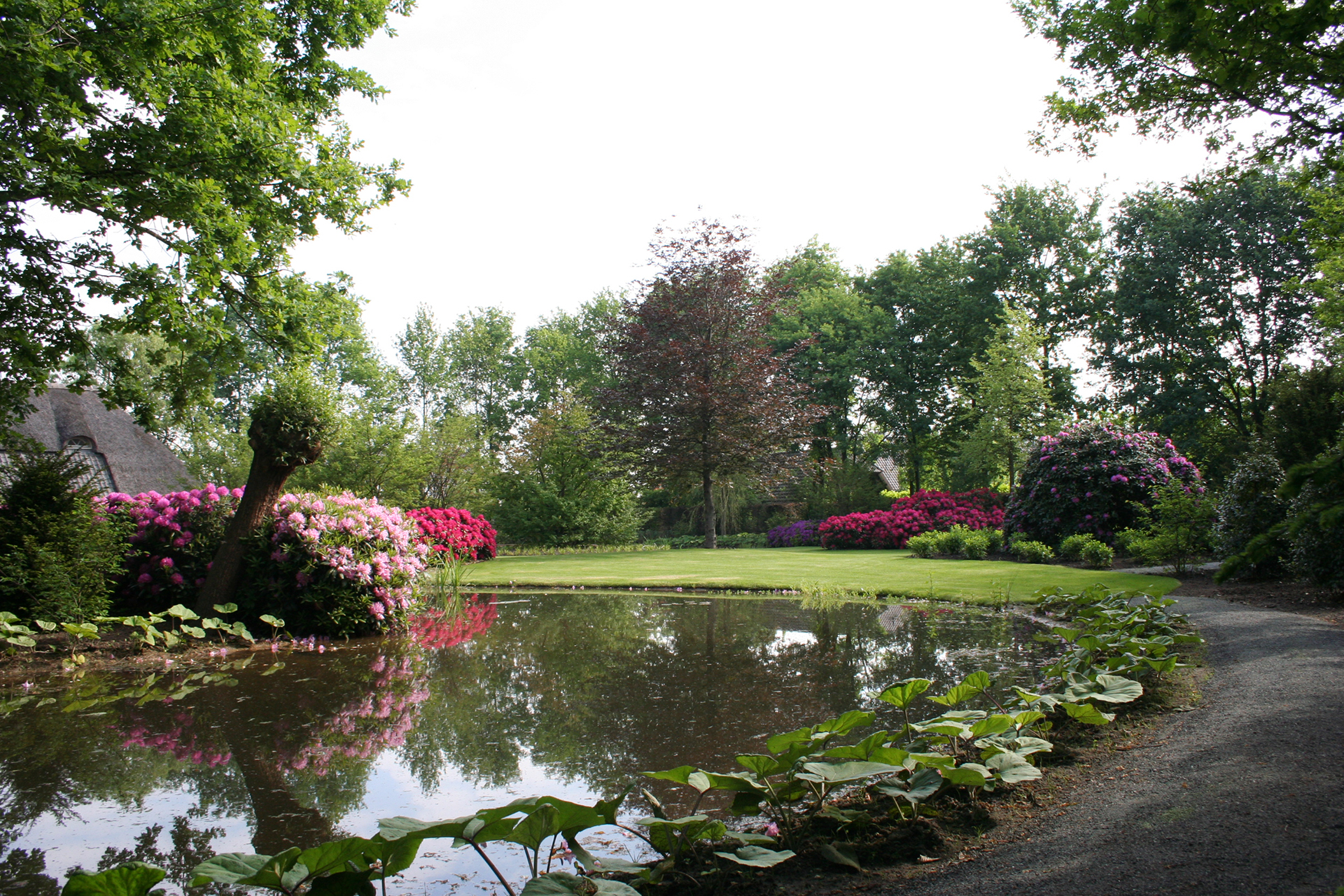 The house of this former farm was surrounded by a farmyard, orchard and pastures. In 2008, the current residents created a 6000 m2 garden. Large rhododendrons, pollard willows and solitary trees and shrubs were planted around the large swimming pond. A red beech (size 70-80) was planted on the lawn and a number of large trees were planted to hide the newly built house at the rear from view.