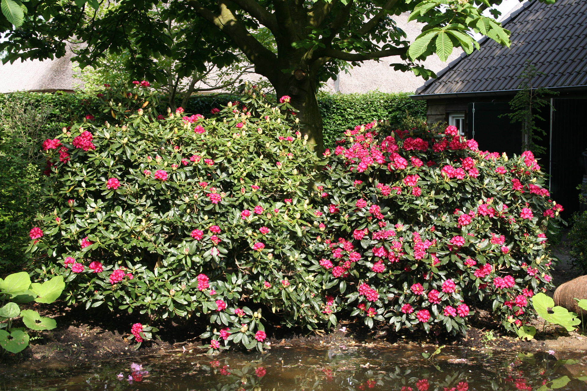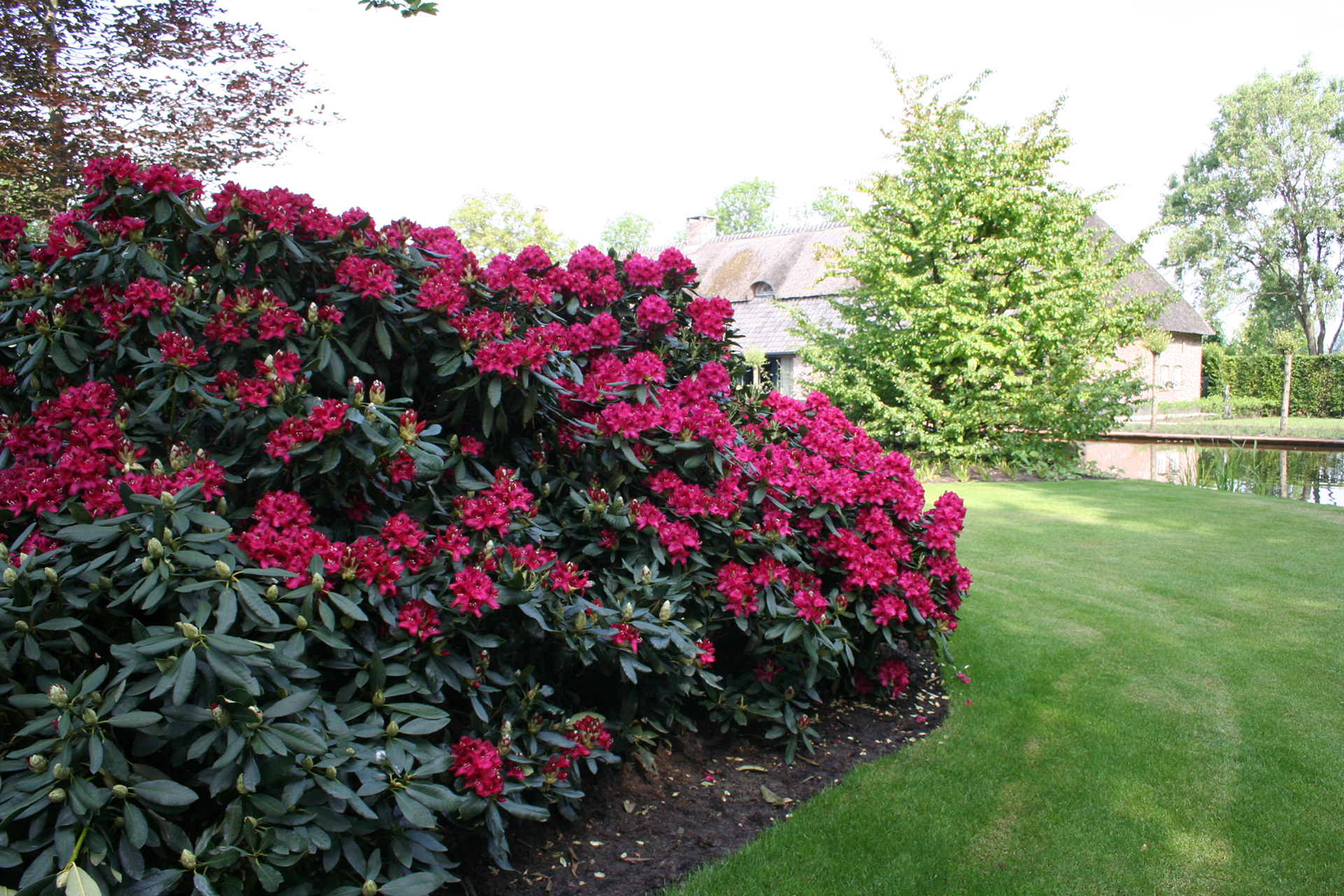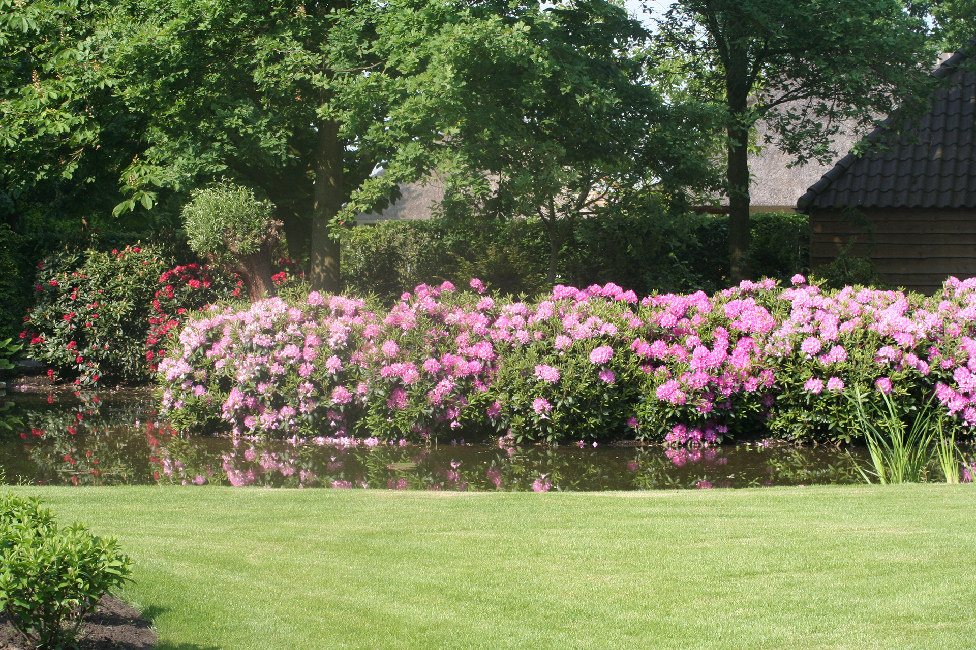 The house of this former farm was surrounded by a farmyard, orchard and pastures. In 2008, the current residents created a 6000 m2 garden. Large rhododendrons, pollard willows and solitary trees and shrubs were planted around the large swimming pond. A red beech (size 70-80) was planted on the lawn and a number of large trees were planted to hide the newly built house at the rear from view.