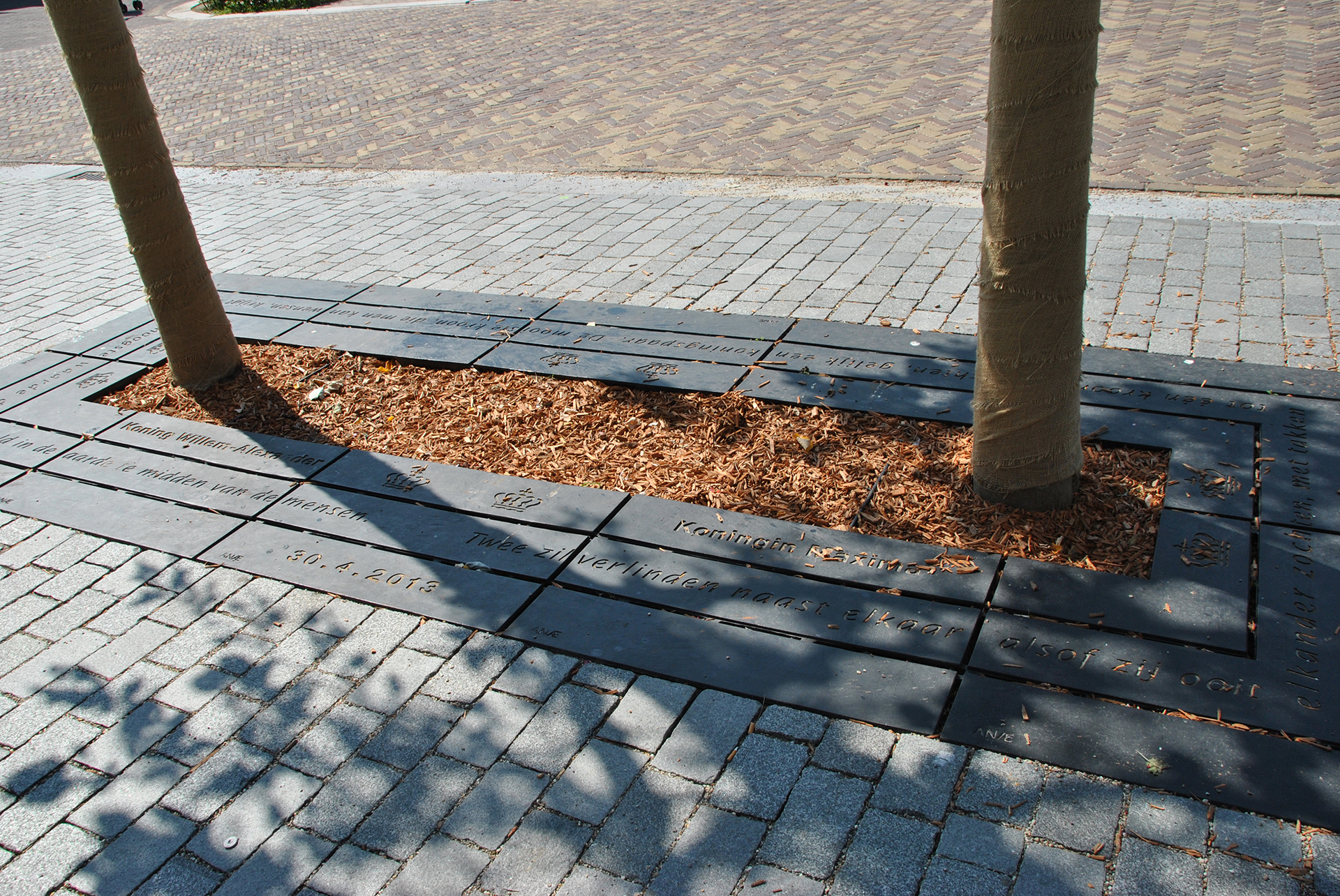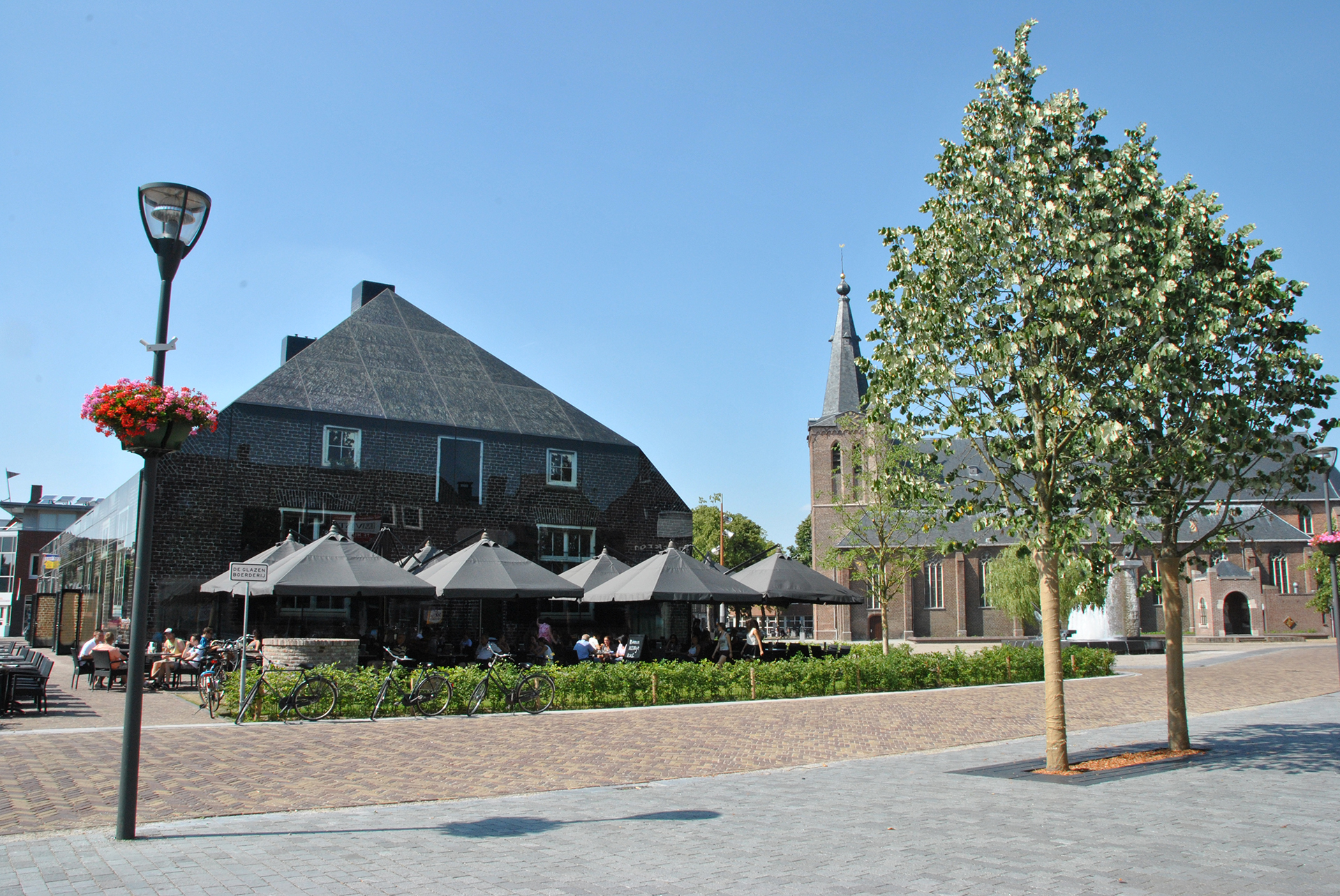 The Glass Farm is a multipurpose building in the central market square of the Brabant village of Schijndel. It is a glass, scaled-up (1.6:1) version of an average local farmhouse which recreates history by evoking a spirit of the past. This market building, which has a total of 1,600 m2 of floor space, houses shops, restaurants, offices and a wellness they chose Tilia platyphyllos pruned into block shapes and clear stem Tilia tomentosa ‘Szeleste’ in centre. The municipality handed MTD landscape architects the job of redesigning the square around the farmhouse and sizes 40-50.