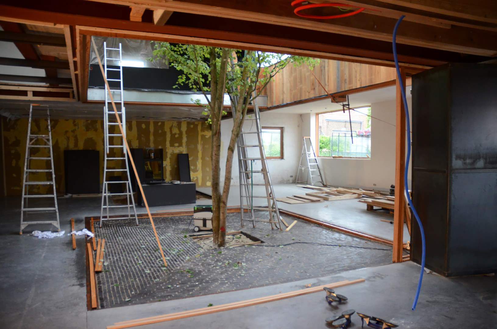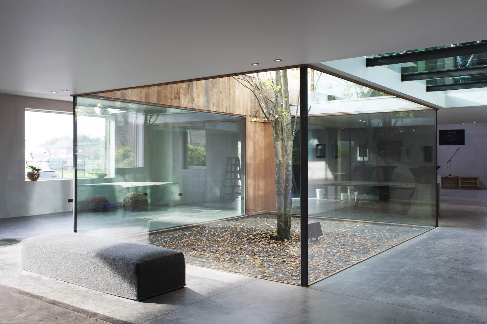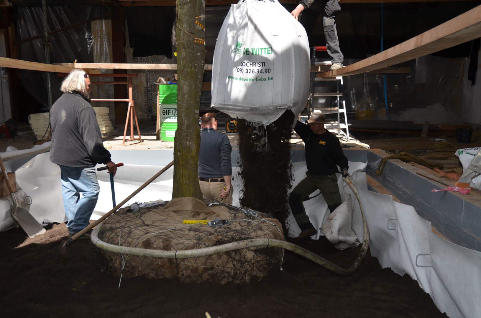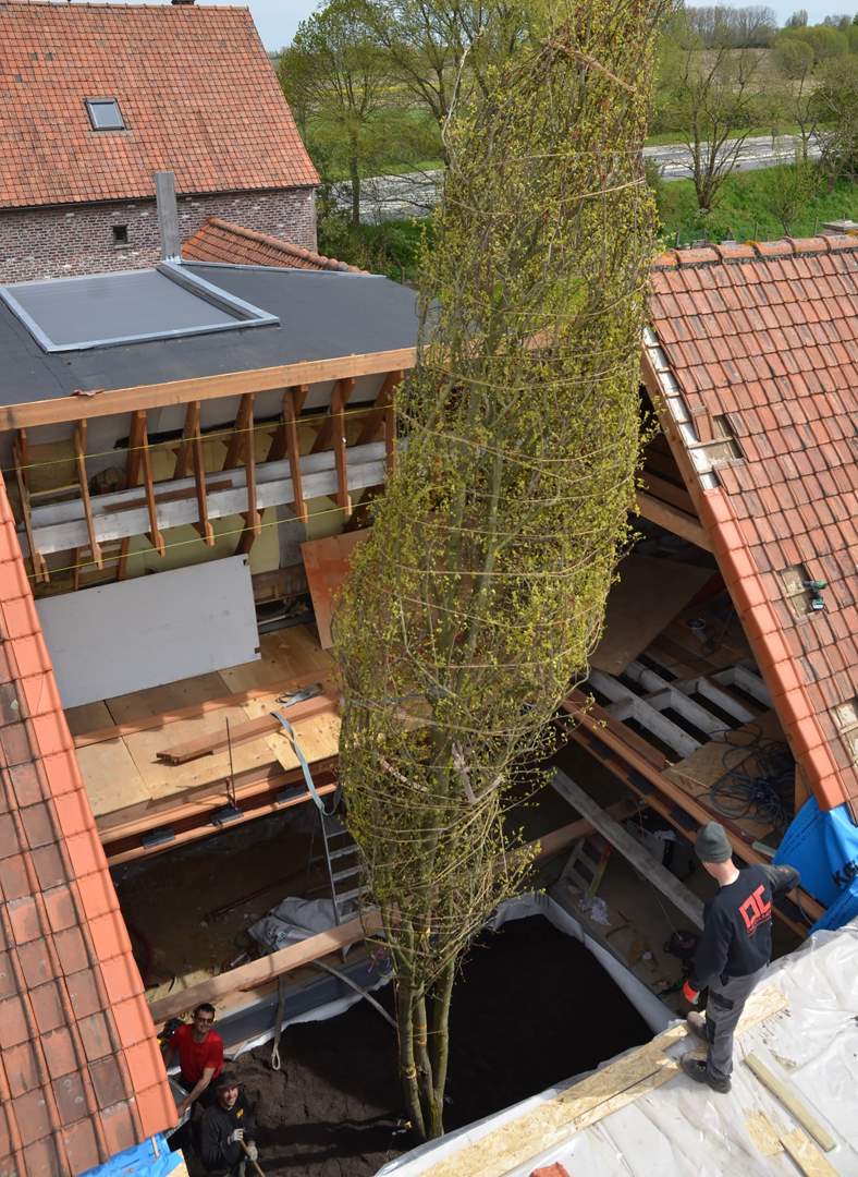 For the refurbishment Dirk Cousaert Design’s showroom, Avalon L-E landscapers were hired for the challenge of creating a tree atrium within the existing building capacity. This required taking the necessary measures in terms of structure and soil in order to create a good growing location as well as achieving the image that the designer had in mind. After extensive research, a third of the existing roof was dismantled and the honour of taking centre stage in this atrium was bestowed upon a multi-stem, trained Acer rubrum. The red maple brings the seasons inside. In summer, the foliage provides natural protection from the sunlight and keeps the building cool and in the dark months, the absence of leaves means more light is let in.