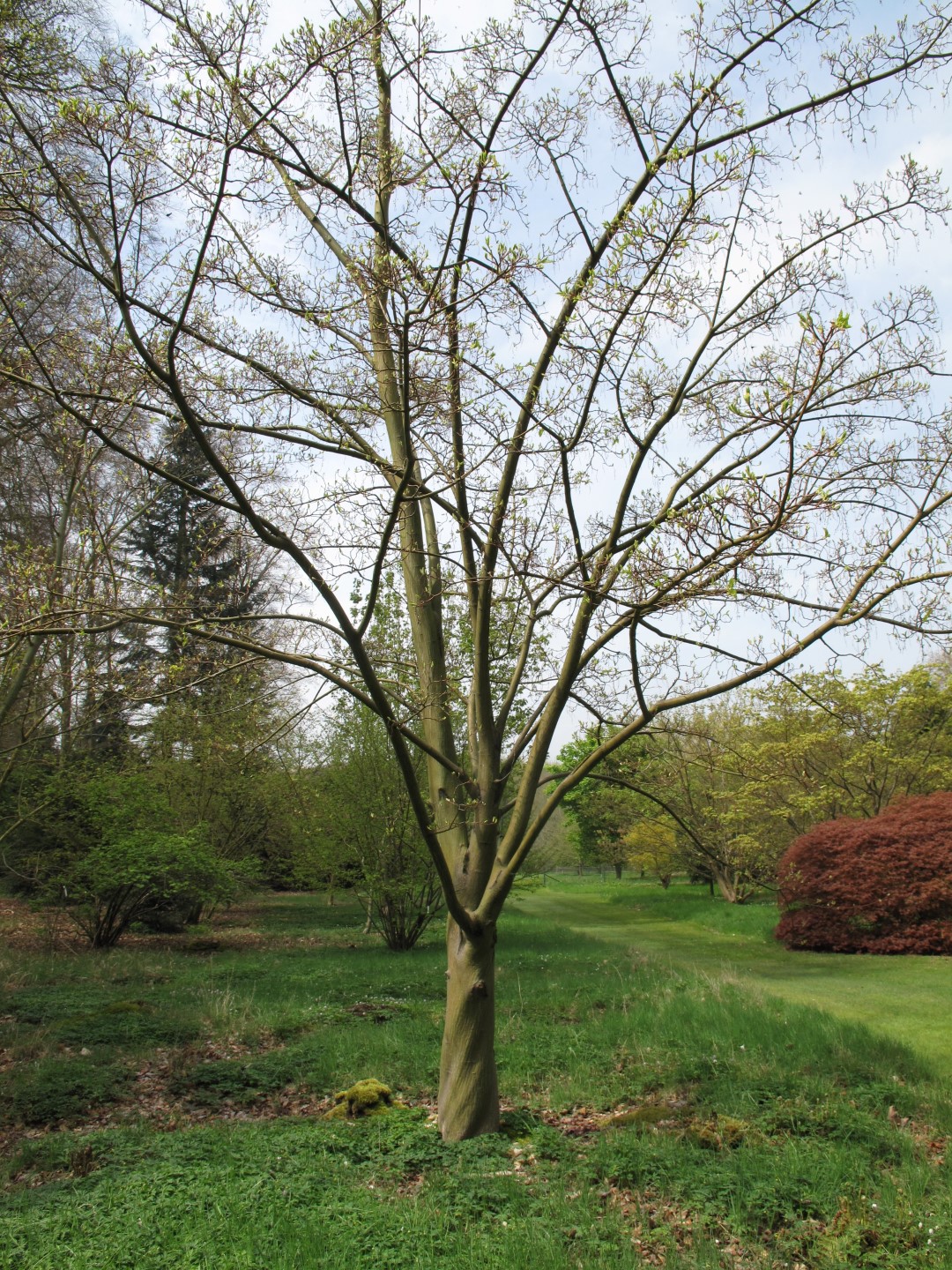 Because of its conspicuously striped bark A. davidii, together with A. capillipes and A. rufinerve, belong to the so-called “Snake Bark maples”. The young twigs are dark purple- red and retain this colour during winter. The older twigs and stem have conspicuously greyish white longitudinal stripes. The leaves are less prominently lobed and unlike A. capillipes the leaves of A. davidii are hairy on the under surface along the veins. The leaf of young plants is ternate, those of older trees do not have lobes. The flowers are unisexual, male and female flowers appear on one plant. The plant has a strongly branched and compact root system. The application of the plant is restricted to parks and larger gardens because it is less suitable for use in hard surfaces. This decorative tree will also stand out well in green borders.