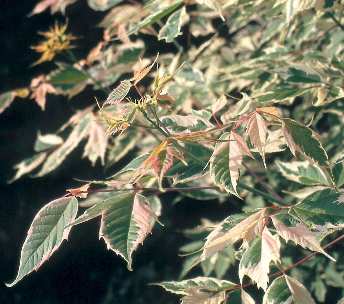 A fast growing, medium-sized tree, reaching a maximum height of 7 m. This cultivar differs little from the other cultivars of the A. negundo with variegated leaves. The leaves are green with silver-white to light-pink margins. Young unfurling leaves have a nice light-pink colour. 'Flamingo' can be applied in parks and gardens. The tree grows both on wet and dry sites. It has a deep rooting main root which branches out strongly. Regular pruning will stimulate the growth of finely coloured young sprouts.