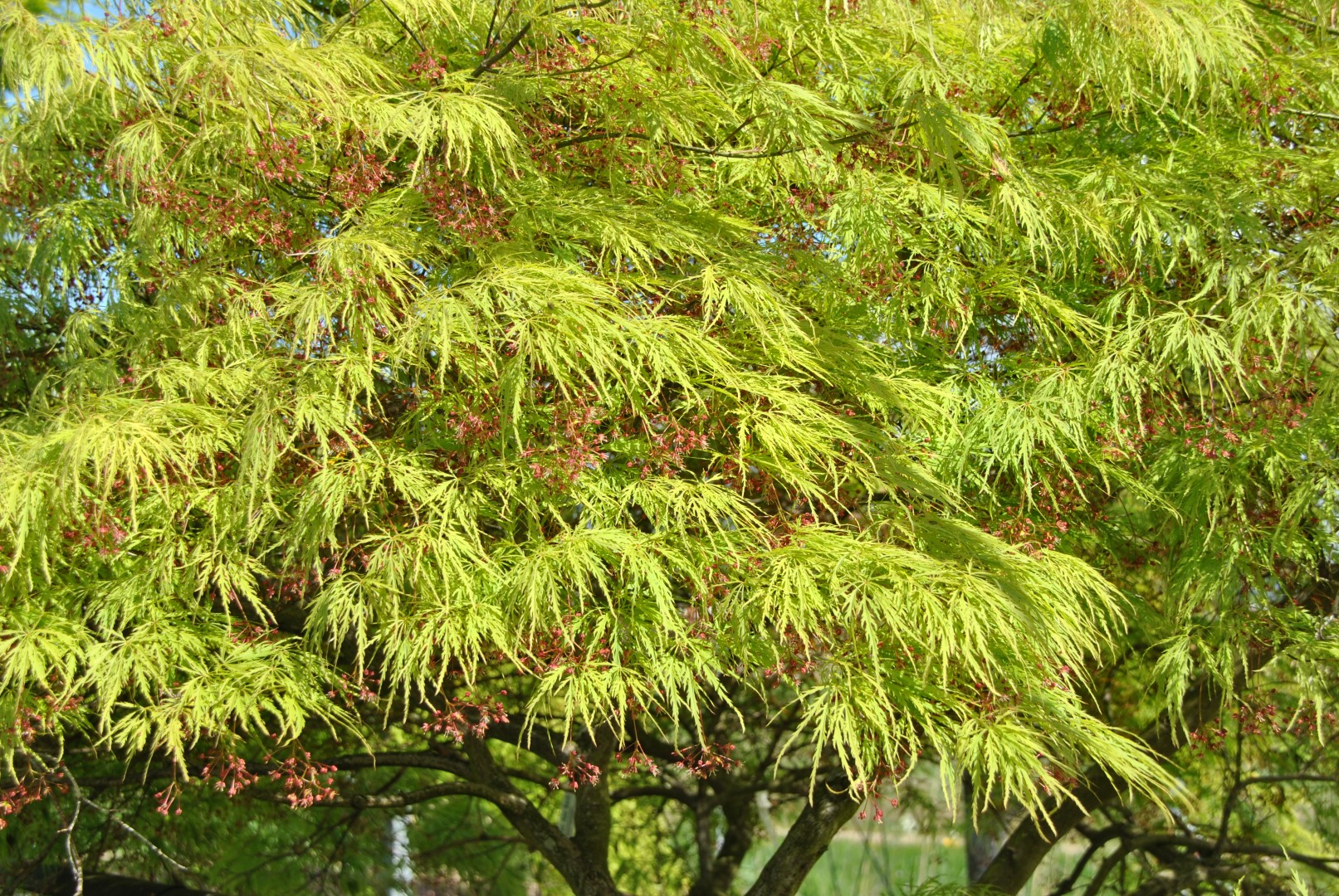 Low, broad shrub, with widely overhanging branches if grafted onto a stem. The leaves are palmate and the leaf segments are also dissected nearly to the main veins. The young leaf is light green to yellowish green. The summer leaf is mid-green. In autumn it turns flaming orange to light red. ‘Dissectum’, previously also traded widely as the variety dissectum viride, gives its name to all of the “Dissectum Group”. A common characteristic of this cultivar group is that the leaf segments of the palmatifid leaves are very deeply dissected.
