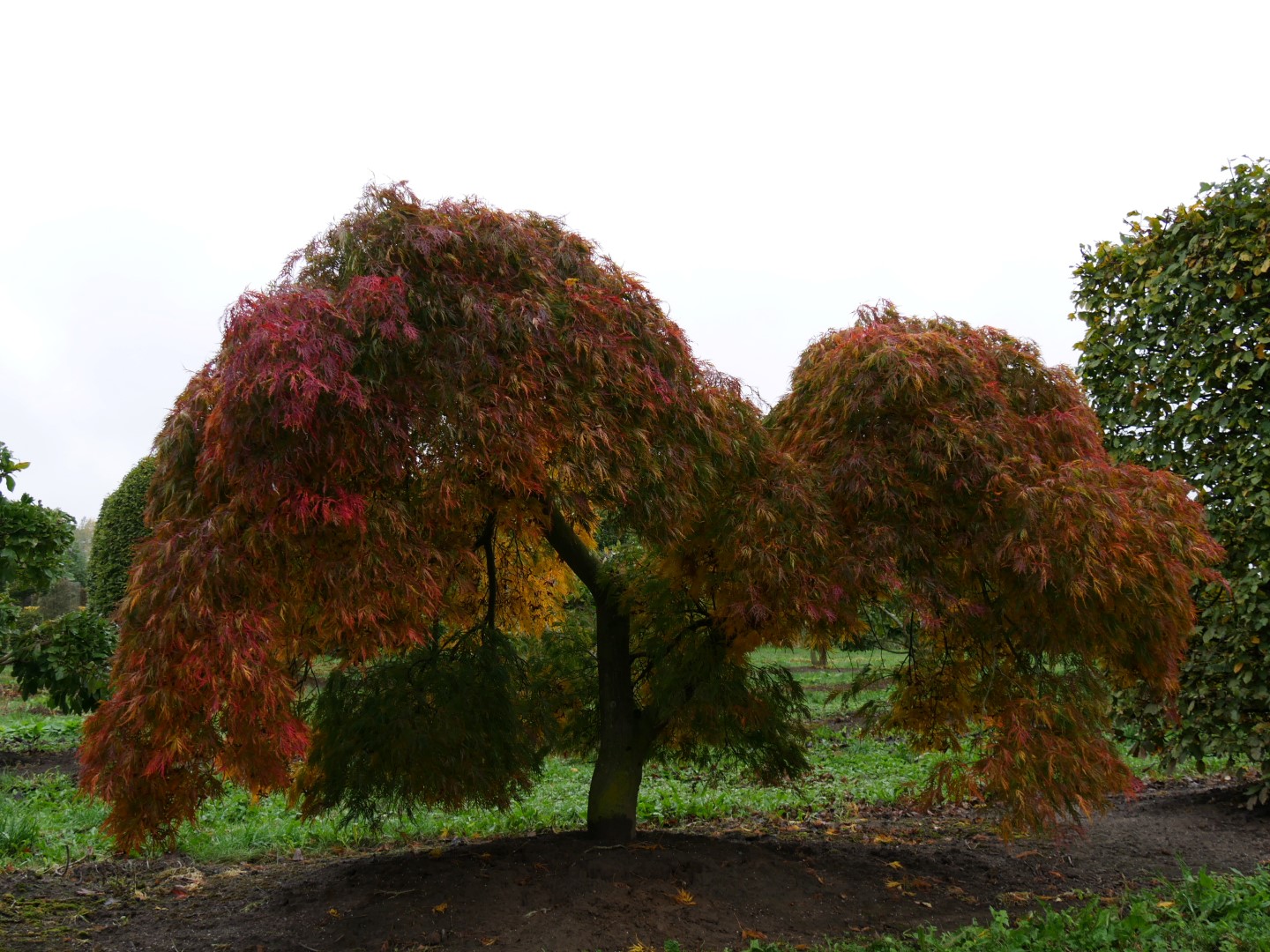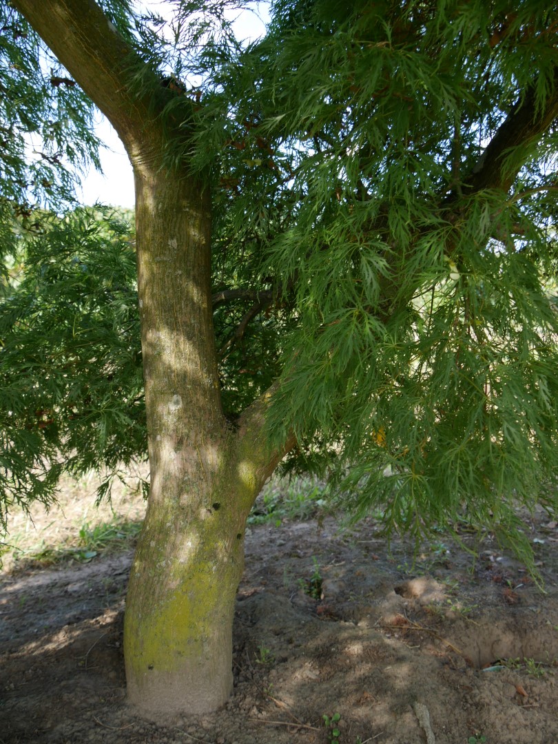 Low, broad shrub, with widely overhanging branches if grafted onto a stem. The leaves are palmate and the leaf segments are also dissected nearly to the main veins. The bright green colour emphasises the fine leaf structure and the plant does full justice to its cultivar name. There can therefore be no doubt that ‘Green Lace’ belongs to the “Dissectum” group. On emerging, the leaf is a creamy green. In the autumn, the leaf turns deep yellow, which is fairly unusual as most cultivars turn orange or red.