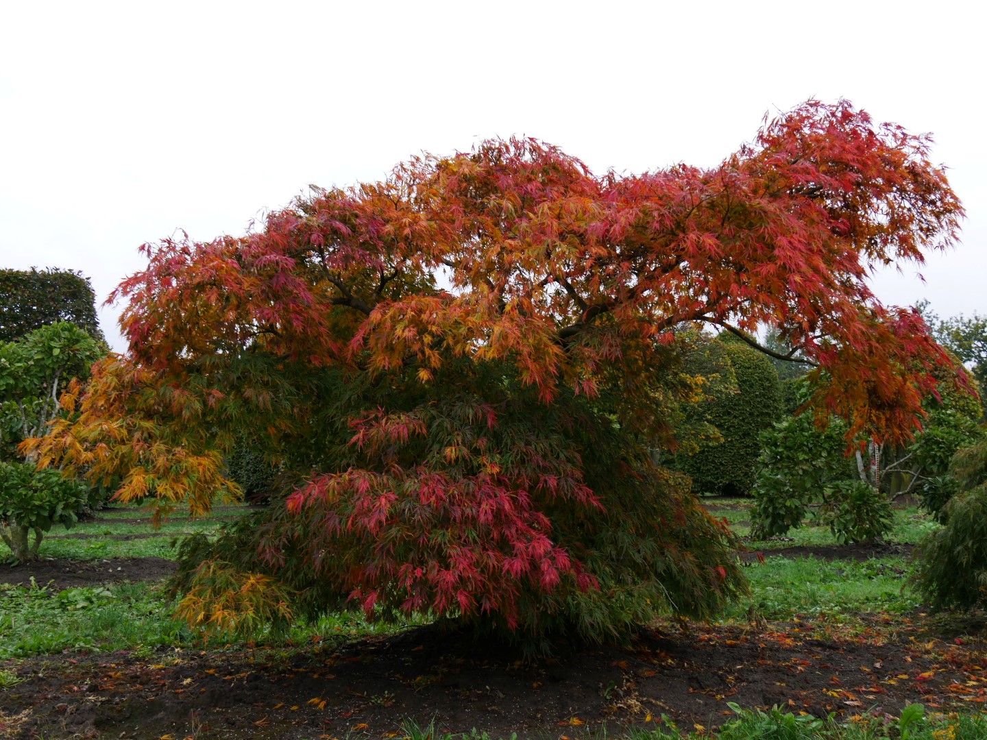 The leaves of Acer palmatum 'Pink Filigree' turn orange, red in autumn.