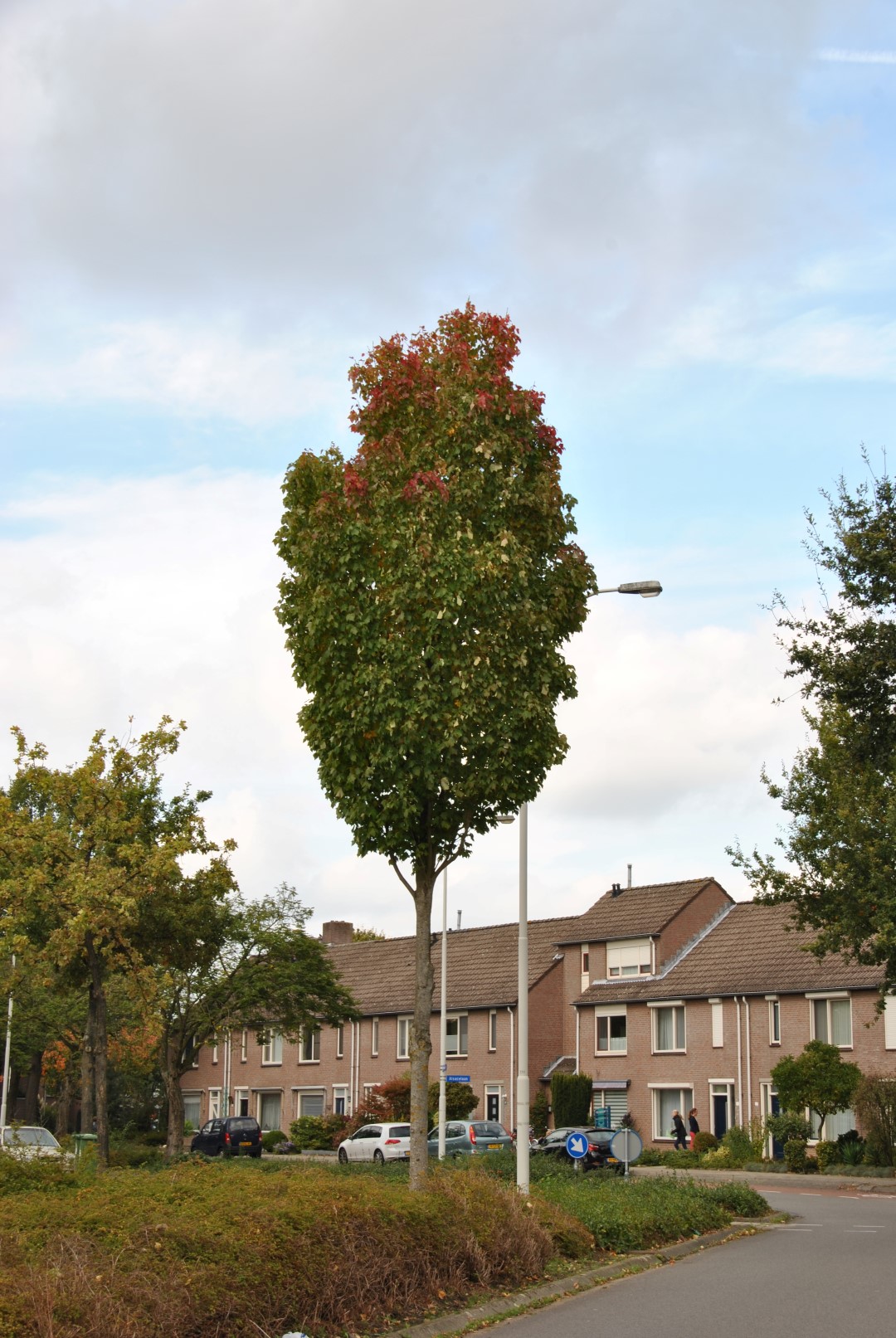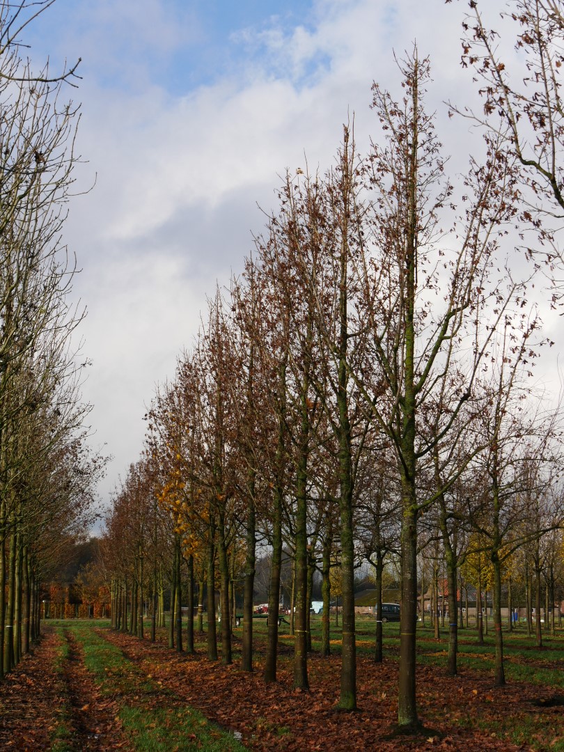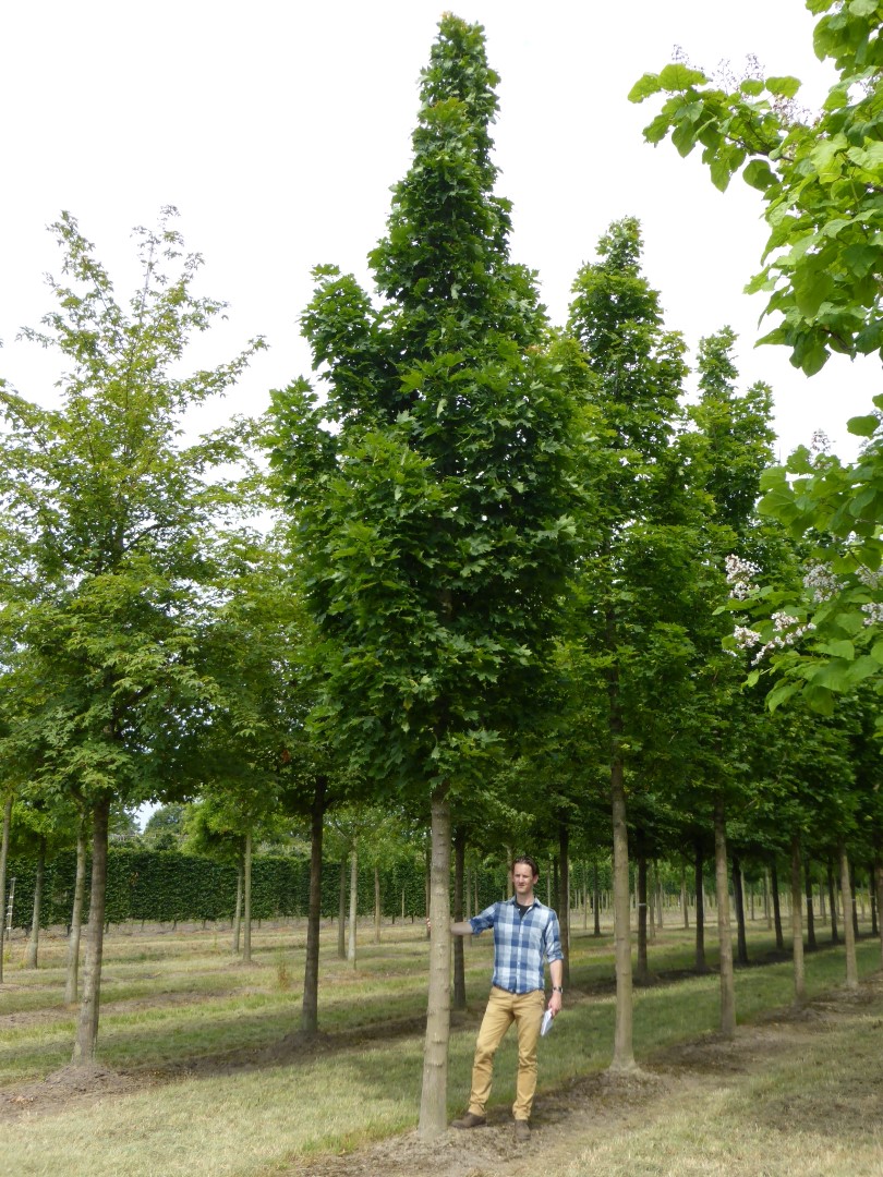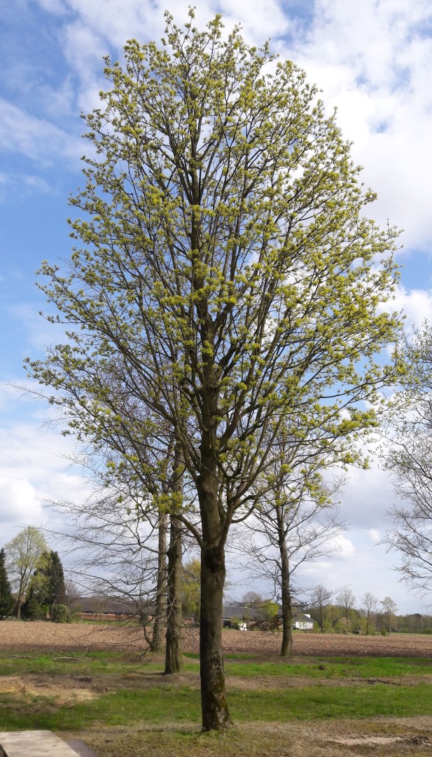 An old French cultivar which has an egg-shaped crown at first. When maturing the branches grow more upright and it becomes a columnar shaped tree. Spread up to circa 6 m. The columnar crown makes this tree very suitable for narrow streets and avenues. Trees grafted on rootstock remain smaller than trees grafted on root collars. These usually grow as multi-stemmed trees. The leaves are lobed and are of the species. When unfolding they have a brown-red colour, in autumn they turn yellow. The inflorescence is profuse and the flowers are hugely visited by bees. Fruits are of the species. Like 'Columnarbroad' this cultivar is very tolerant to any soil, but it does not thrive on a wet soil. Very tolerant to a city climate. The tree has a good wind resistance.