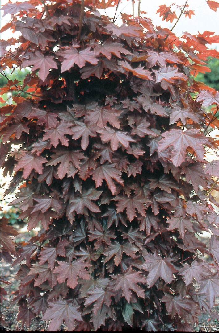 A medium-sized tree with a wide egg-shaped crown. Height up to 10 m. When mature strongly resembles 'Crimson King', but especially when juvenile it has a more slender crown. The leaf is shiny dark red all summer. Flowers and fruits are of the species. Is used as a park tree and as a solitary. Can be applied in smaller gardens as well. Grows on any soil, but does not tolerate stagnating groundwater and peaty soils. Good wind resistance. Winter hardiness zone: 4