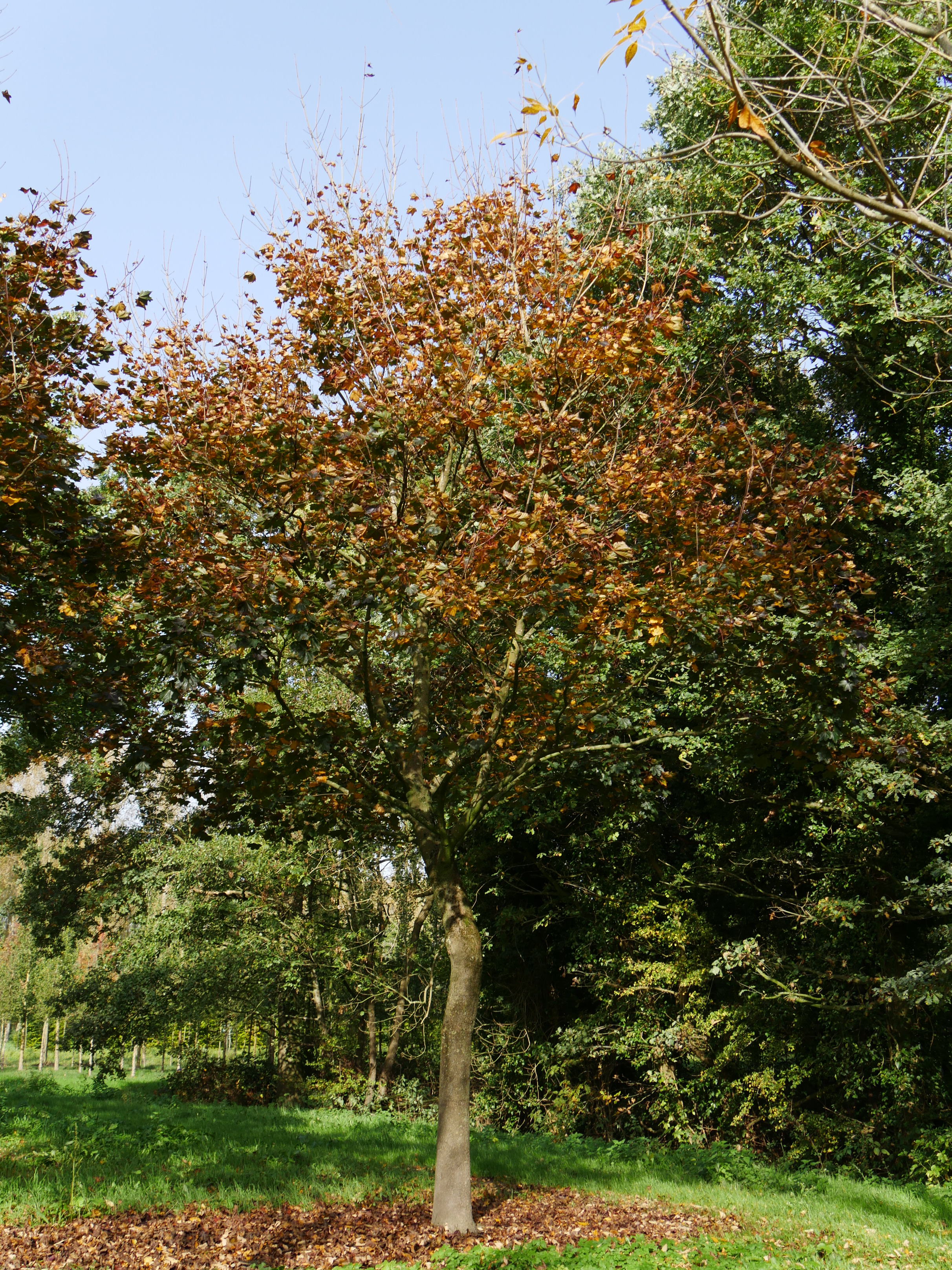 Medium-sized tree that can reach a height of 15 - 20 m. The crown is dense and irregular, wide conical. A mature tree can have a crown width of circa 8 m. The unfurling leaf is light red, in summer it turns deep red-brown. 'Faassen's Black' strongly resembles 'Crimson King', but the leaf of 'Faassen's Black' is darker and duller. The tree was selected from the same sowing as 'Crimson King'. The green-yellow flowers appear just before the leaf unfurls. This makes the tree a real harbinger of spring. The unfolding, red leaf makes a bold contrast with the yellow flowers. 'Faasen's Black' grows in any soil, but does not tolerate stagnating groundwater and peaty soil. The tree is good wind resistant. The cultivar A. p. 'Royal Red' is less sensitive to mildew.