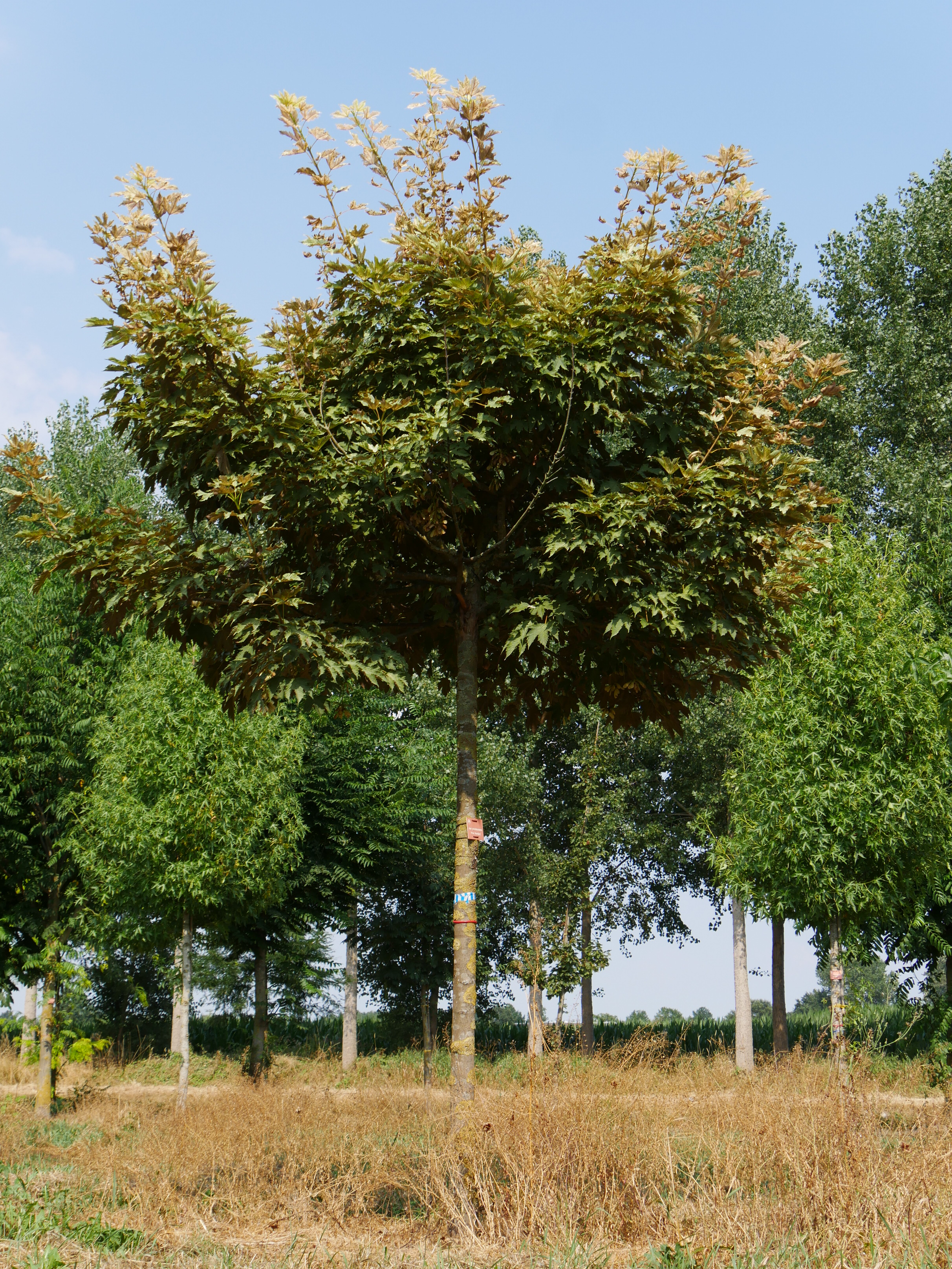 This small and slow growing tree has a spherical crown and is shows a distinct resemblance to 'Brilliantissum'. The tree can reach a height of 4 to 5 m. The leaf has 5 lobes. Young foliage is purplish, later yellow-green speckled. The underside remains light purple all summer. The leaf of this cultivar is less sensitive to scorching than that of the 'Brilliantissum'. Flowers and fruits are of the species. 'Prinz Hadjery' is applied as a small park tree and as a solitary in gardens. It does not require anything special from the soil. In addition the tree has a good wind resistance. Winter hardiness zone: 4