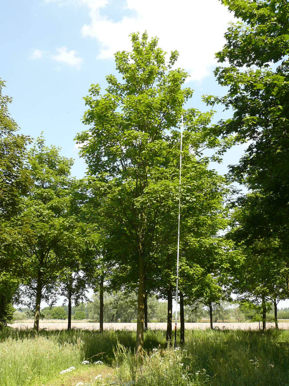 The cultivar 'Rotterdam' is a healthy tree with an even habit and a rough trunk. It can reach circa 20 m. When juvenile it has a narrow pyramidal crown. In maturity the crown becomes a little vase-shaped. The leaf is 5-lobed and has a cordate leaf base. Flowers and fruits are of the species. This tree is applied as avenue and street tree, in the city or in the country side. It is a good wind resistant tree that, due to its being insensitive to sea wind, can perfectly be applied in coastal areas. Deep rooting. Thrives in almost any soil. Winter hardiness zone: 4