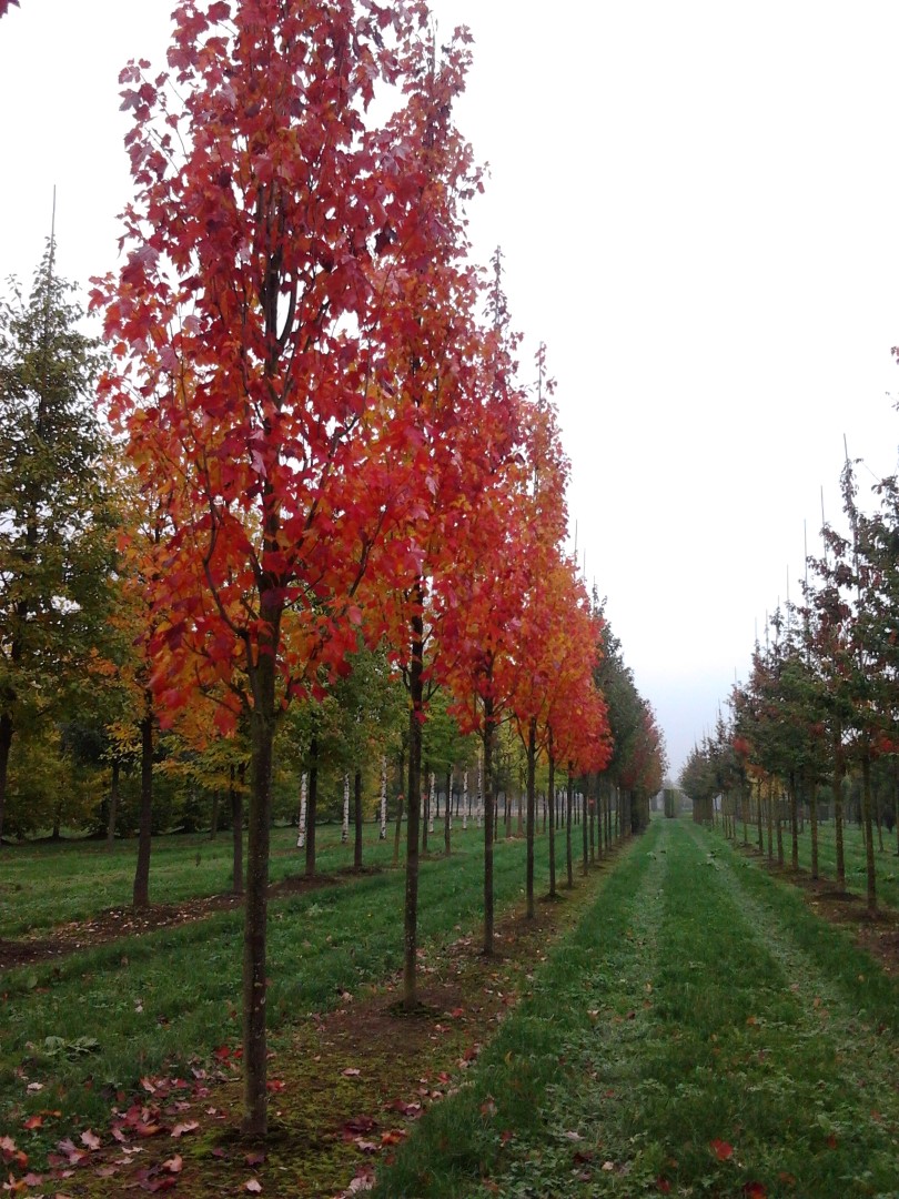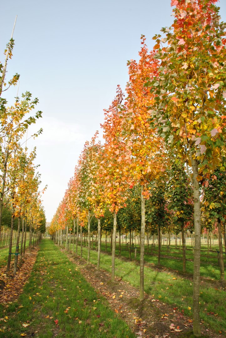 A somewhat older, American selection reaching circa 15 m. The crown is narrow pyramidal, making it a perfect tree for application in avenues. Young twigs are red-brown, the leaf stalk of the bright green 10 cm leaf is also red-brown. The underside of the palmate leaf is blue-green. Autumn colouring in orange-red hues. The red flowers emerge before the leaves unfurl. The tree develops a sturdy main root with fibrous root branches. In dry, limy soil the growth stunts and the autumn colouring will not occur. Intolerant to (sea) wind. 'Bowhall' shows a strong resemblance to A. freemanii 'Armstrong' but remains slightly shorter and has a more dense crown. The autumn colouring is more intense too. Winter hardiness zone: 4