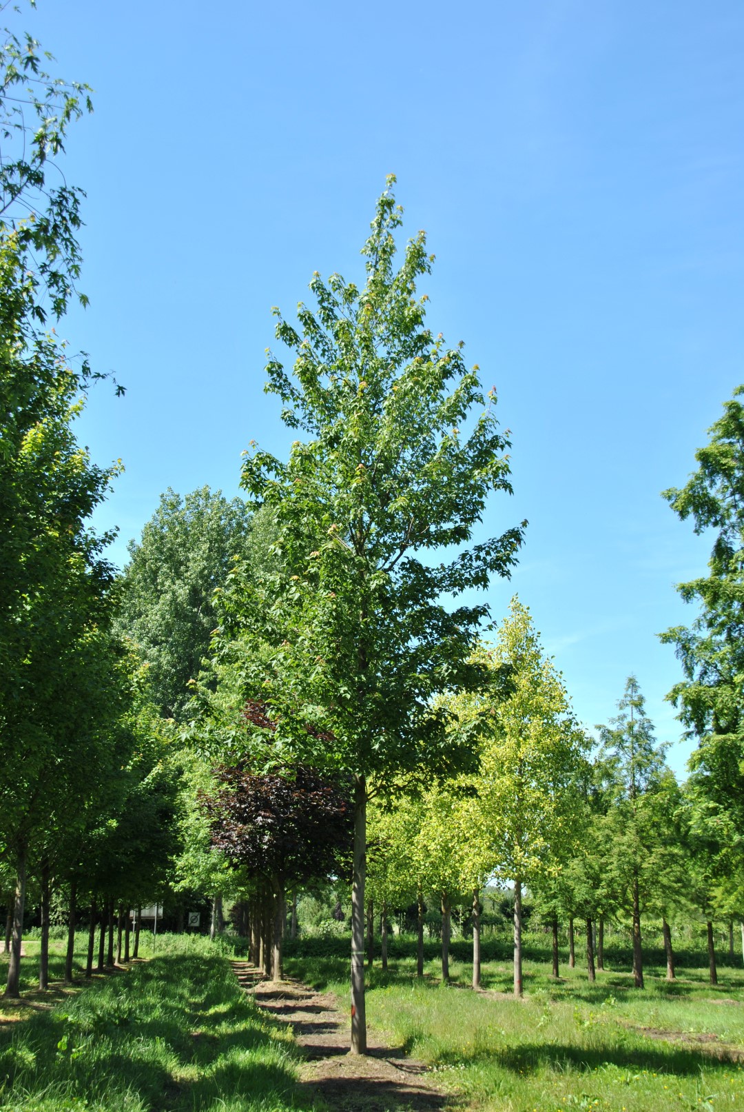 Dense, oval to wide oval crown. Vigorously growing, reaching a height of circa 20 m. Young twigs are red brown. The leaf stalk is red-brown too. The leaf is bright green and can be 10 cm. The underside of the leaf is blue-green. In comparison to other cultivars, it has a spectacular autumn colouring in orange-red hues. Juvenile trees already have this colouring. This autumn colour remains well into autumn. A male variety without any flowers or fruits. Limy soil stunts the growth. In dry soils no autumn colouring. Poor tolerance to (sea) wind. Winter hardiness zone: 4