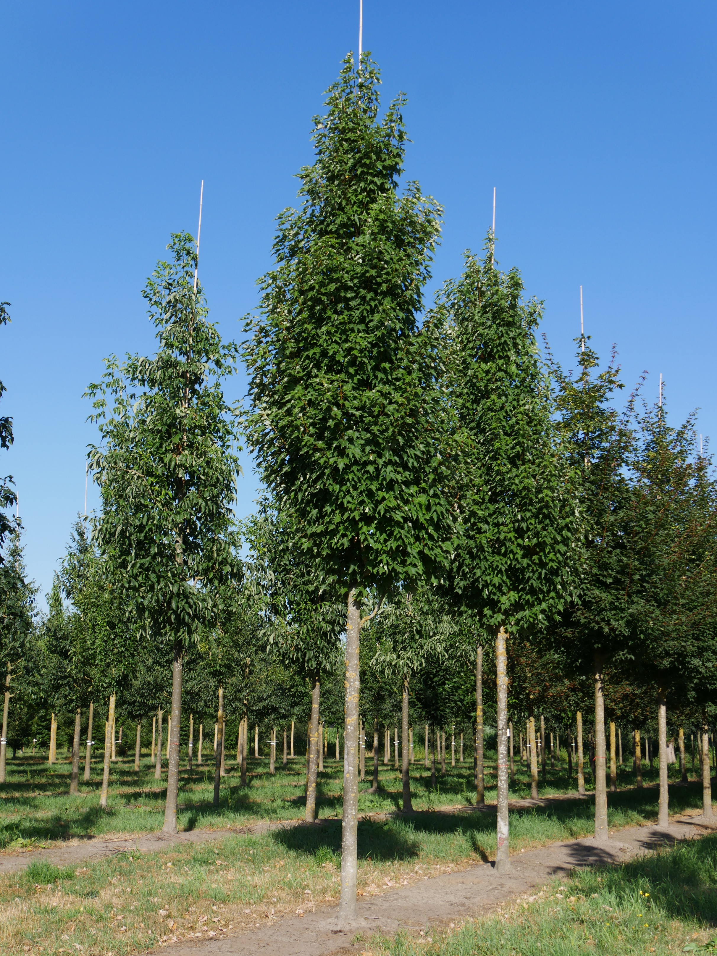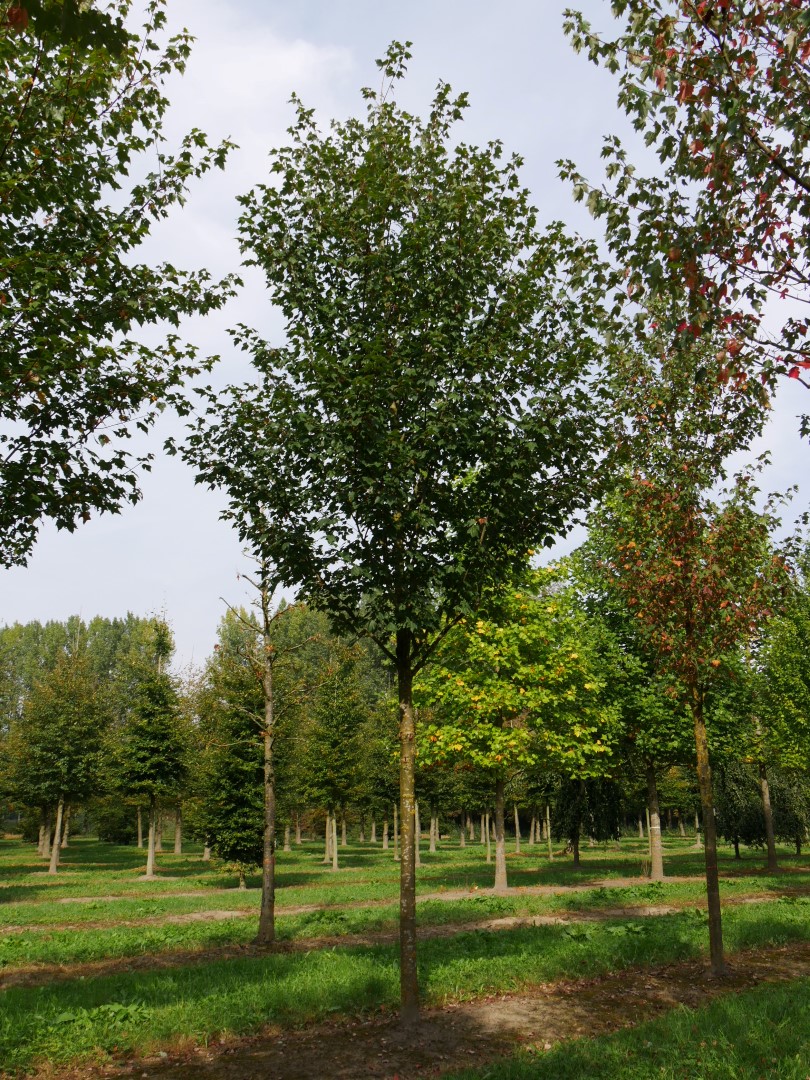 New American selection outstanding for its hardiness. Oval, dense, closed crown. Its branches have a crotch angle of 45 degrees. Height circa 12 m. Young twigs are strikingly red brown. The leaf stalk too, is red. The leaf itself is dark green and can be circa 10 cm. The orange-red autumn colouring can differ from year to year. A male variety without any flowers or fruits. Limy soil stunts the growth. No colouring in dry soils. Poor tolerance to (sea) wind. Winter hardiness zone: 4