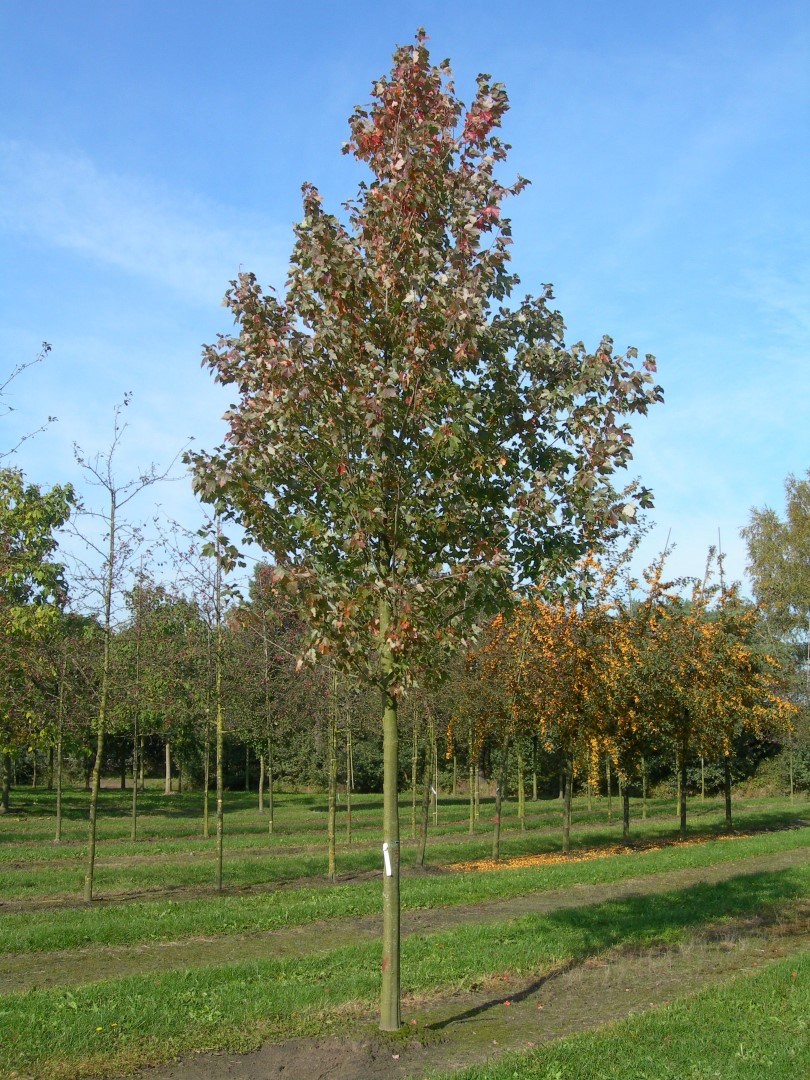 Medium-sized tree, evenly branching, pyramidal to egg-shaped crown and well-growing top. Dense, closed crown. Height 15 to 18 m, spread circa 12 m. Young twigs are red-brown and have lenticells. The leaf stalk is also red. The circa 12 cm large leaf is shiny and dark green, slightly thicker and larger than of the species. The underside is blue-green. Red flowers emerge before the leaves unfurl. Autumn colouring is intensive orange to dark red. Leaf remains long on tree. The tree grows a sturdy main root with fibrous rootlets. In limy and dry soil the growth stunts and there will be no autumn colouring. Poor tolerance to (sea) wind. Sensitive to salt. Winter hardiness zone: 4