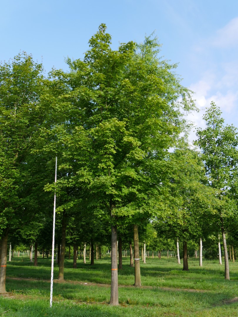 Medium-sized to large tree with a dense, oval-round crown. It can eventually reach a height of up to 40 m. In America specimen of 40 m are indeed found. There, the tree is also used for the production of sugar. It rarely reaches a spread of more than 10 m. The pointed buds are brown. The long and wide leaf is bright green and turns into orange and red hues in autumn. Both the habit and the shape of the leaf resemble those of A. platanoides. The difference being that a bruised leaf of A. saccharum does not produce milky sap but a clear liquid. The inflorescence is simultaneous with the unfurling of the leaf. The rooting is shallow with many branching roots. Though the sugar maple thrives in many soils, a wet soil is unsuitable for a healthy growth. The tree is not tolerant to stagnating water. Sensitive to salt for icy roads. Intolerant to hard surfaces.