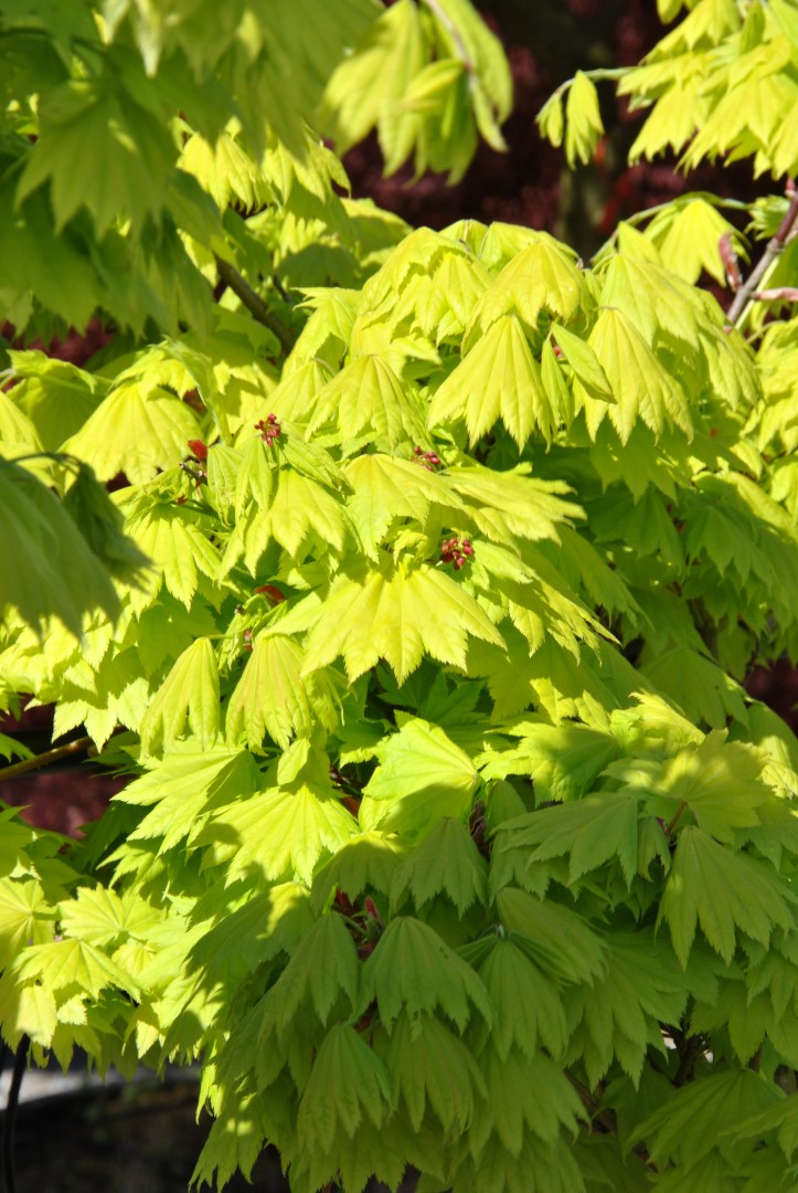 Slow growing bush that eventually grows into a small tree with a very short trunk and a bulbous crown. The leaves are virtually round and have 9 to 11 shallow lobes. On emerging, the leaf is golden yellow, becoming more greenish-yellow in summer. The autumn colour is orange, but most leaves will wither or turn brown at an early stage. This maple was cultivated for a long time as A. japonicum ‘Aureum’. Research demonstrated that the flower corymbs and fruit of ‘Aureum’ point upward, a characteristic of A. shirasawanum and not of A. japonicum.