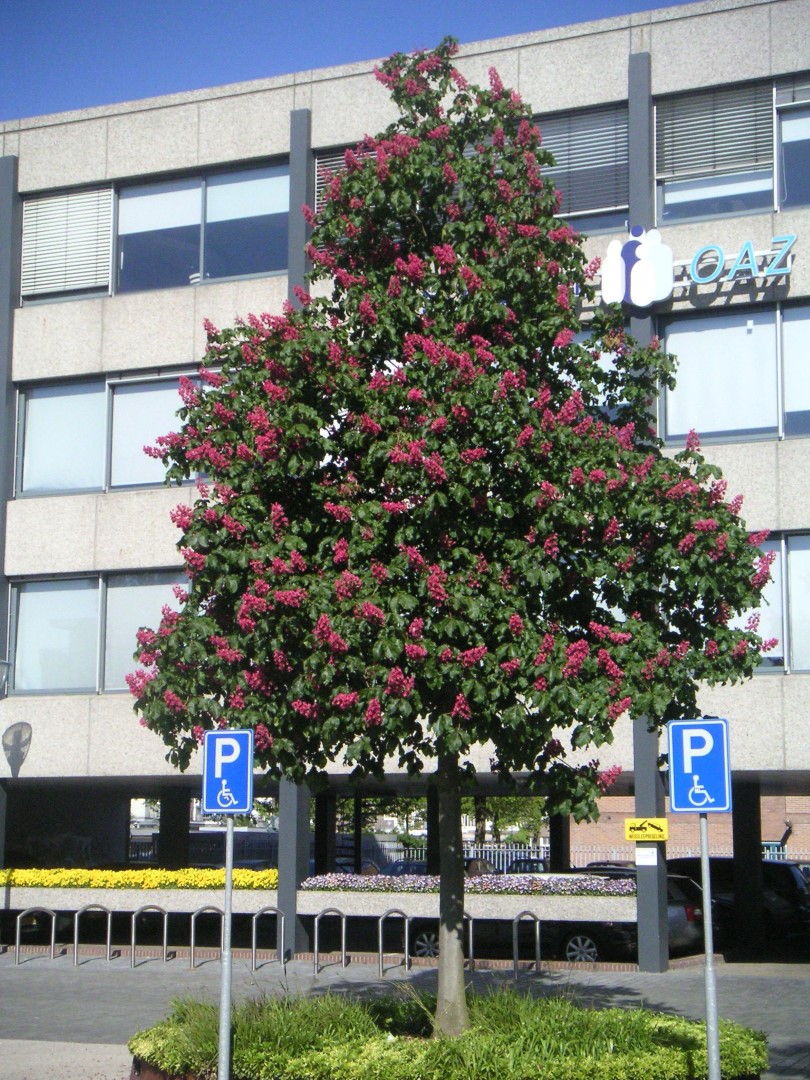 Crossing between A. hippocastanum and A. pavia. The dense crown casts a dark shade. A mature tree seldom reaches higher than 15 m and gets circa 15 m wide. 'Briotii' grows slower than the species. The slightly shiny, opposite leaves are more folded than those of A. x carnea and can reach 15 cm across. They appear early, remain long on the tree and have a yellow brown autumn colour. The midrib is tinted red at the origin. The blood-red flowers do not appear until the tree is 8 to 10 years old and are bigger than those of the A. x carnea. The fibrous root system consists of a main root which branches out well and goes deep into the ground. The ground must not be too dry. Intolerant to asphalt surfaces unless the base area is large enough.