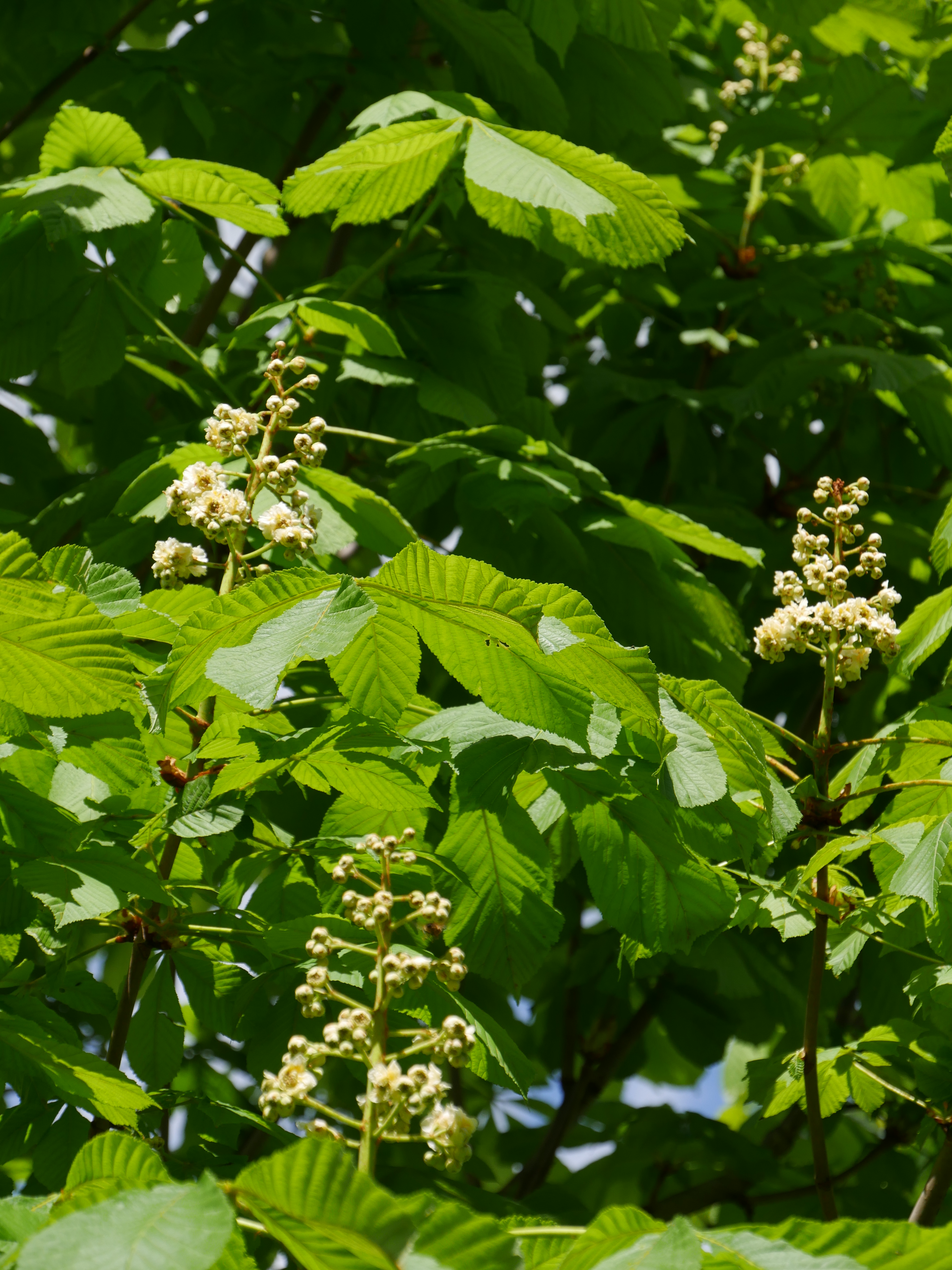 A known, double-flowered cultivar with a nicely shaped, spreading and dense crown and a short and sturdy trunk. Very dense casting a dark shade. Does not grow as big as the species. Height up to 25 m, spread up to 15 m. Main branches almost grow horizontally and have pendulous twigs with upright tips. The opposite leaves can become 20 cm across. In autumn they turn to yellow brown. The double-flowered, sterile inflorescence is large and profuse. The tree shows white, shorter and more compact panicles than A. hippocastanum. Inflorescence is longer than of the species. 'Baumannii' is a sterile variety without fruits. This makes the tree very suitable for use in streets and avenues. The tree requires pruning for vehicular or pedestrian clearance due to its horizontal branching. Has a deep going main root. Susceptible to deicing-salt (for icy roads).