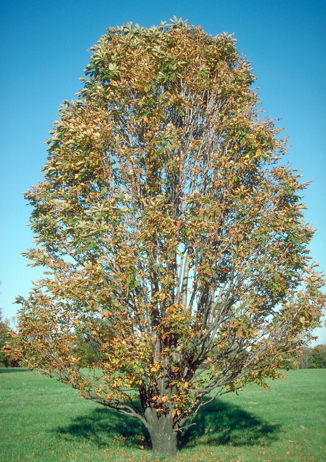 Grown on its own root, this cultivar forms a balanced shrub that is very close and entirely spherical. In that case it can reach a height and a width of 3 m. 'Umbraculifera' is usually top-grafted on rootstock (A. hippocastanum). The graft height is 2.20 m as a rule, sometimes 2.40 m. In this way a nicely shaped tree is formed that is very suitable for smaller gardens and narrow streets and avenues. The opposite leaves can reach 20 cm across. In autumn they colour into yellow brown. The inflorescence is the same as of the A. hippocastanum, only the panicles are shorter. The colouring from yellow into red of the macule (spot in the leaf) is striking. The root growth is obviously less profuse than of the species. The tree is susceptible to salt (for icy roads).