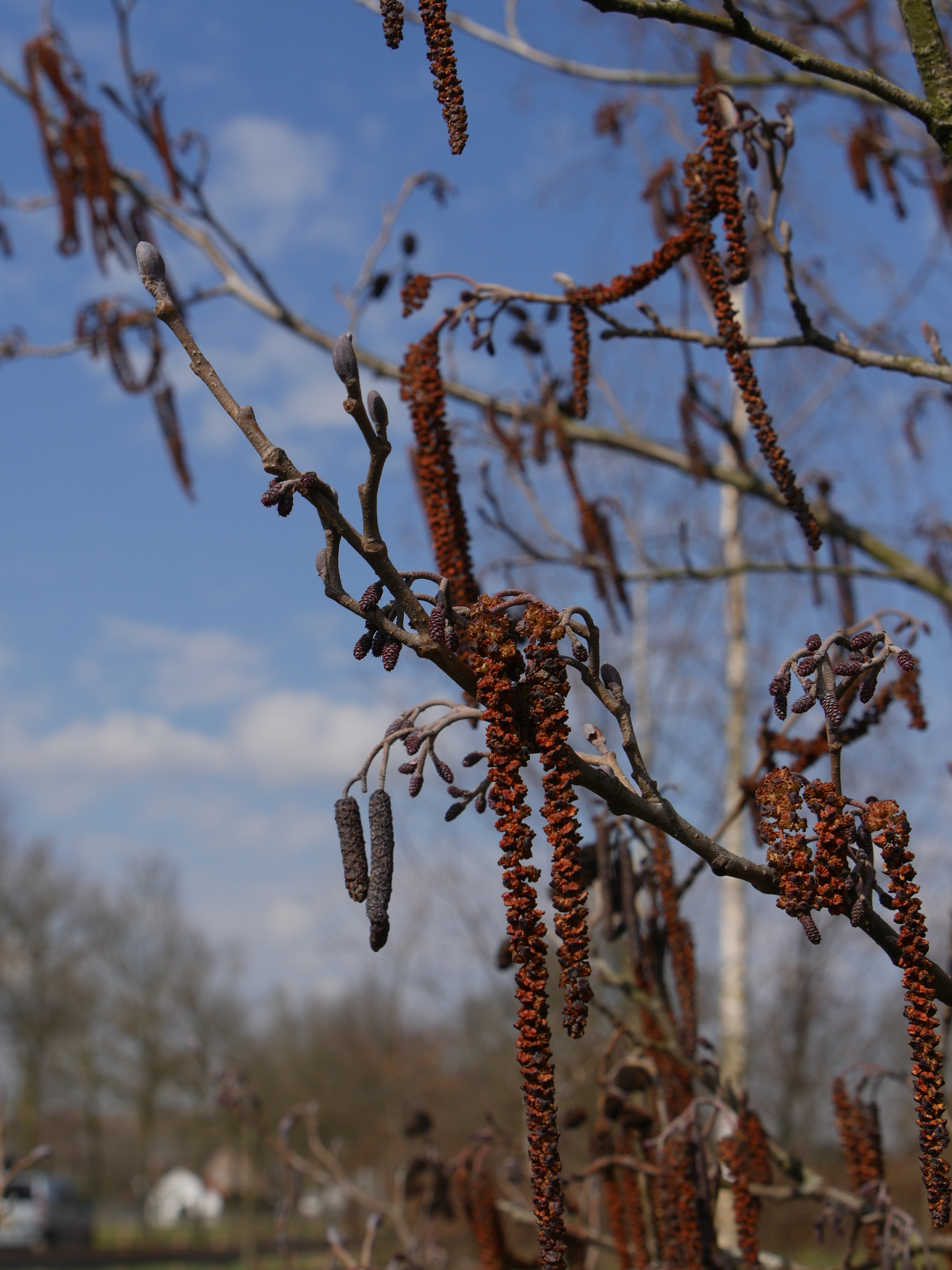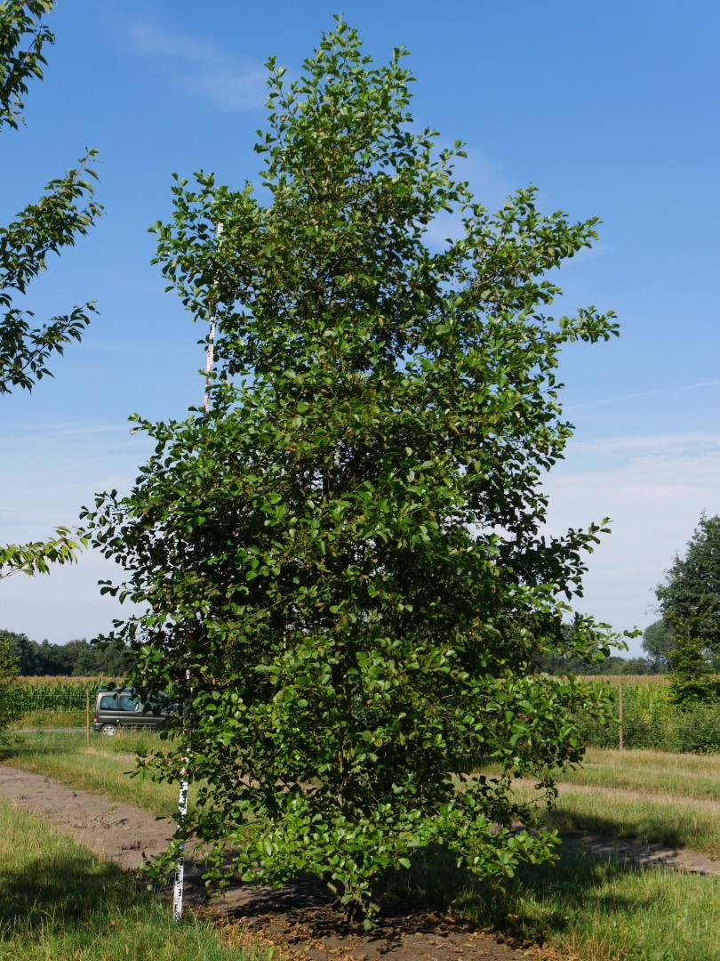 This alder is native to almost entire Europe and grows mainly in moist areas. Sometimes growing into a multiple-stemmed, big tree. Now and then a mature specimen with a height reaching over 20 m can be found. The alternate leaf becomes 10 cm, is ovate and has a blunt tip. The stalked buds, which are grey violet, and the younger leaves feel sticky (glutinosa = sticky). Female catkins are oval and inconspicuous, ± 0.5 cm long and the male catkins are brown yellow, ± 7 cm long. Strobiles appear from September and persist long. The tree roots strongly and fairly deep. Poor tolerance to hard surfaces. Often used as brushwood in landscapes. Withstands severe pruning. Little susceptible to (sea) wind.