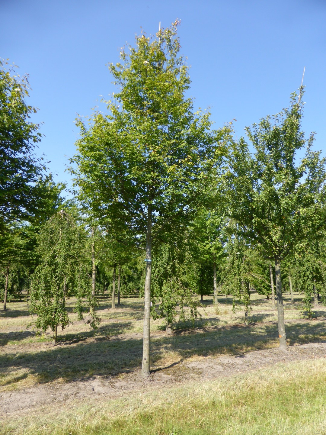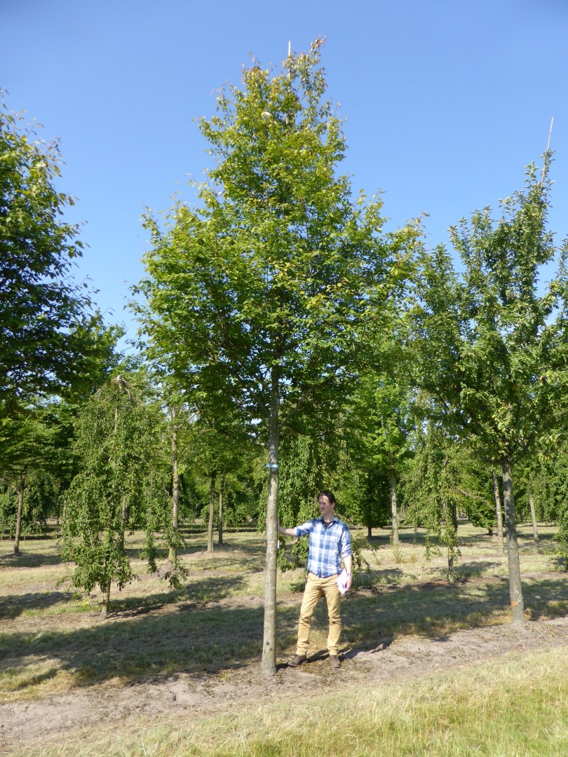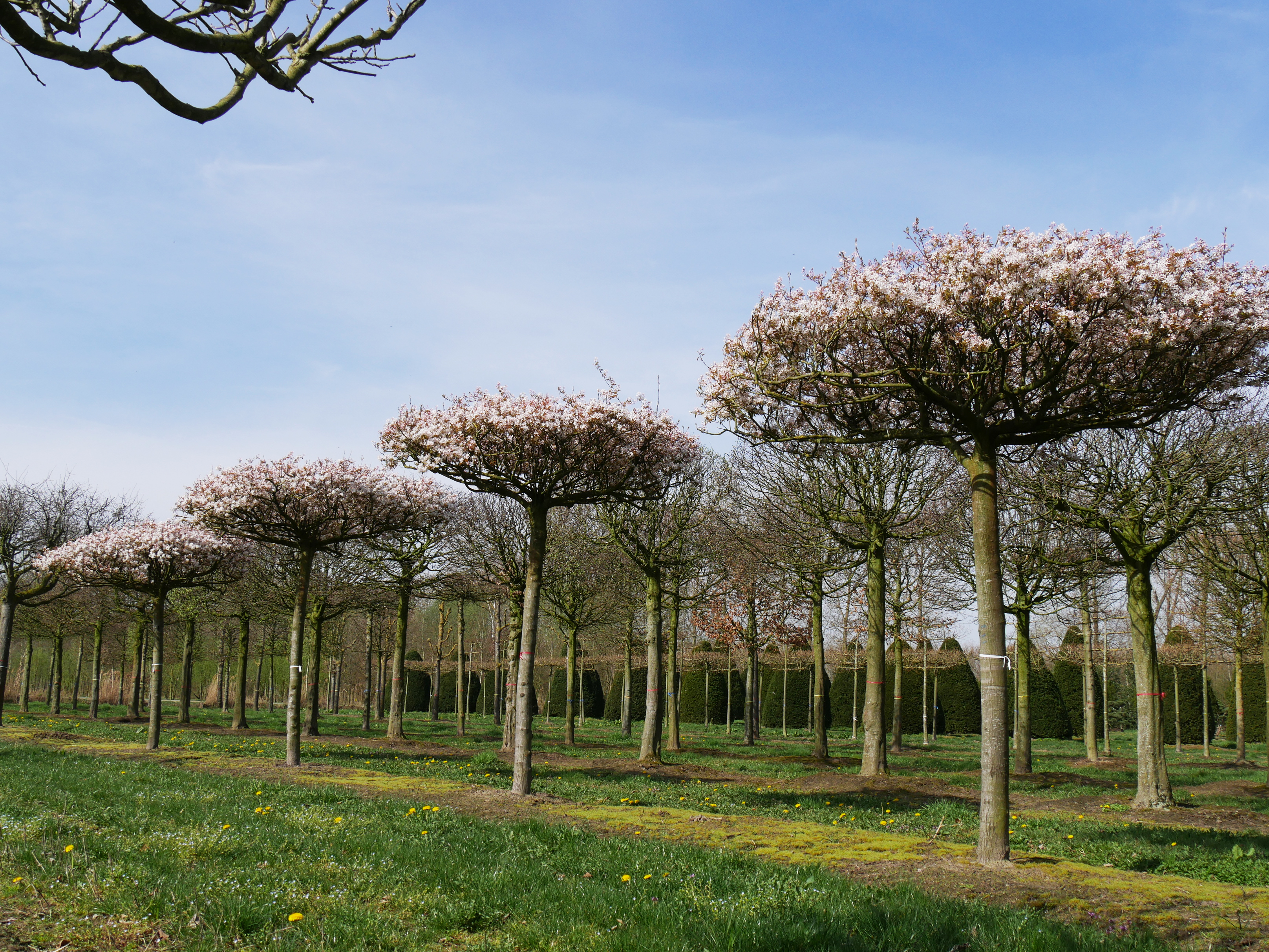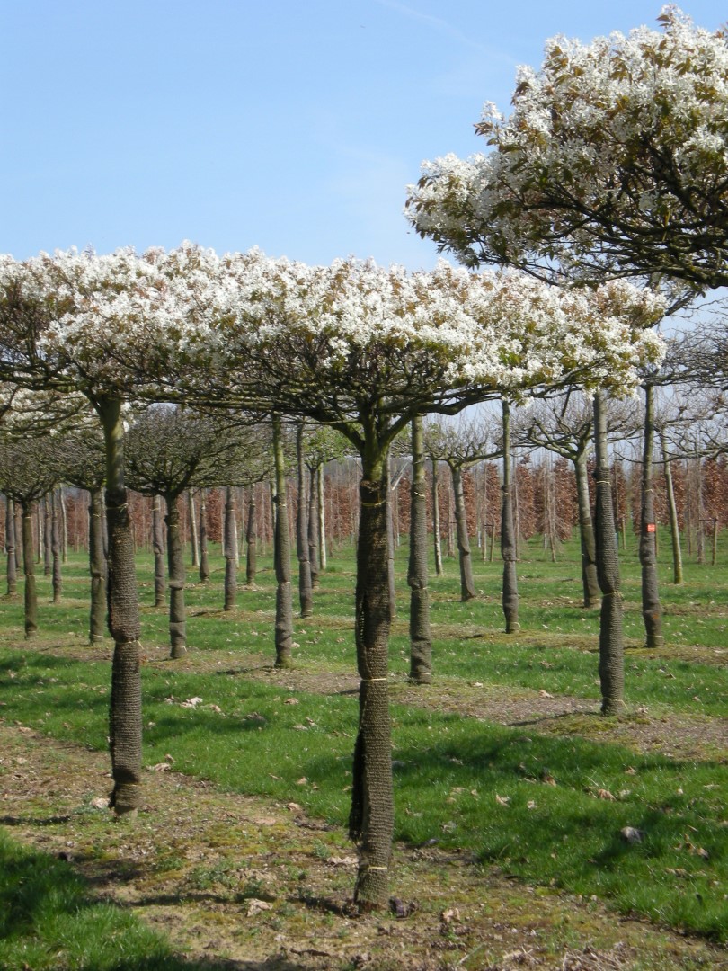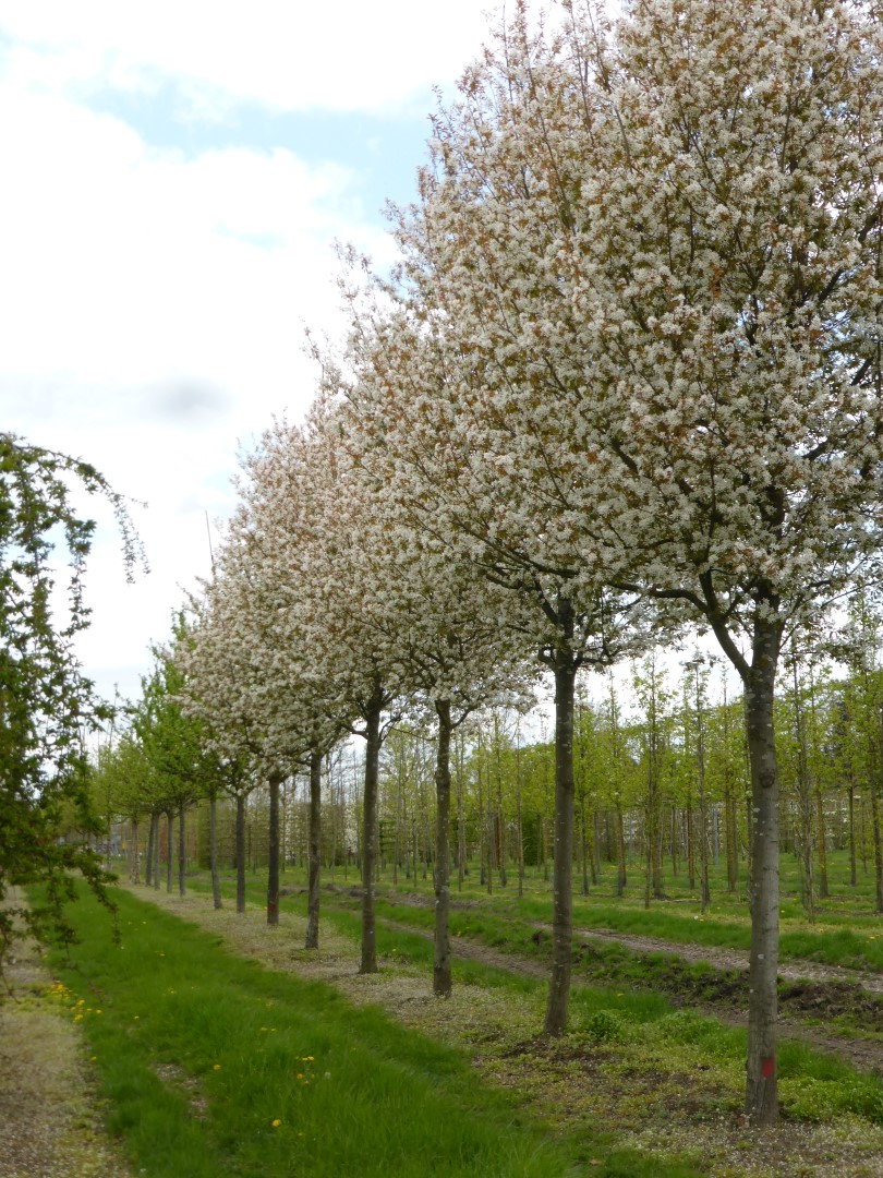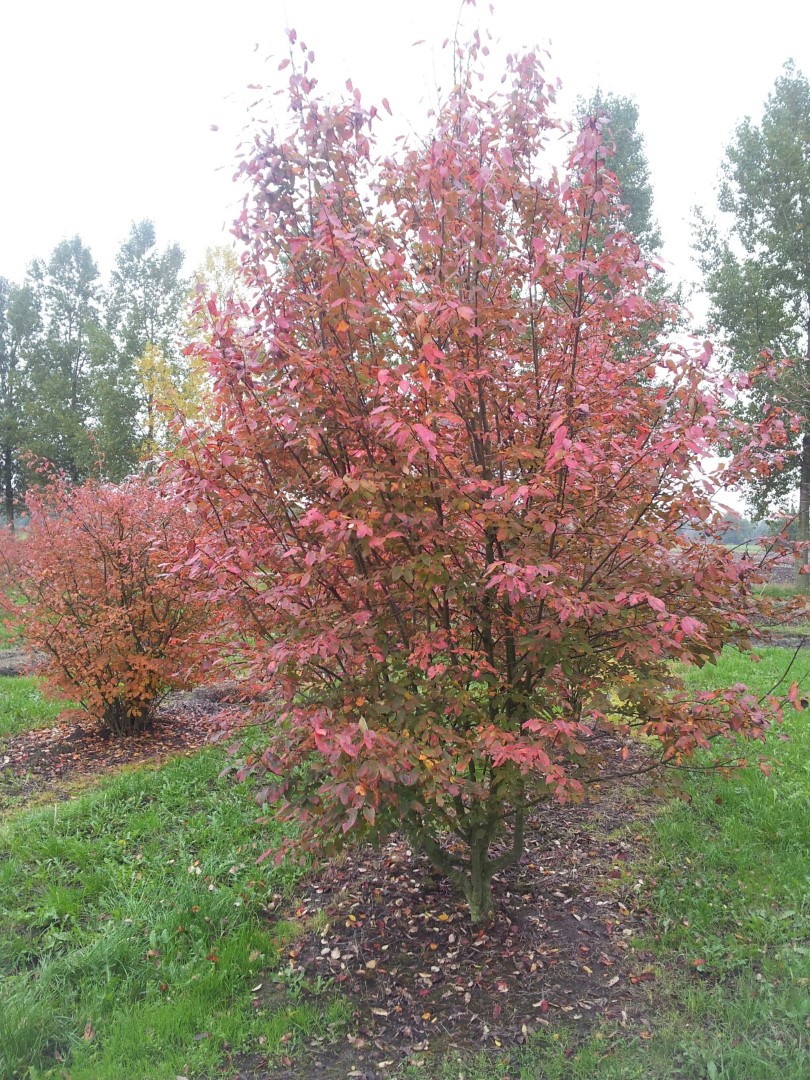 Small tree with a striking winter silhouette thanks to the fine branching pattern. In the winter, the grey colour of the bark is striking. The reverse ovoid to oval, densely haired leaves have a pointy top and are dark green on the top and greyish green underneath. They turn spectacular yellow and red tints in the autumn. The flowers are in large, loose, pendulous clusters. When in the bud, they are pink, but turn completely white when open. The warmer the weather, the whiter the colour of the flowers. Berries appear in the autumn and turn from a dark red colour to black. 'Robin Hill' produces very little fruit. The tree has a fine root system close to the surface. It places little demands on the soil, prefers slightly calcareous soil that is not too wet.