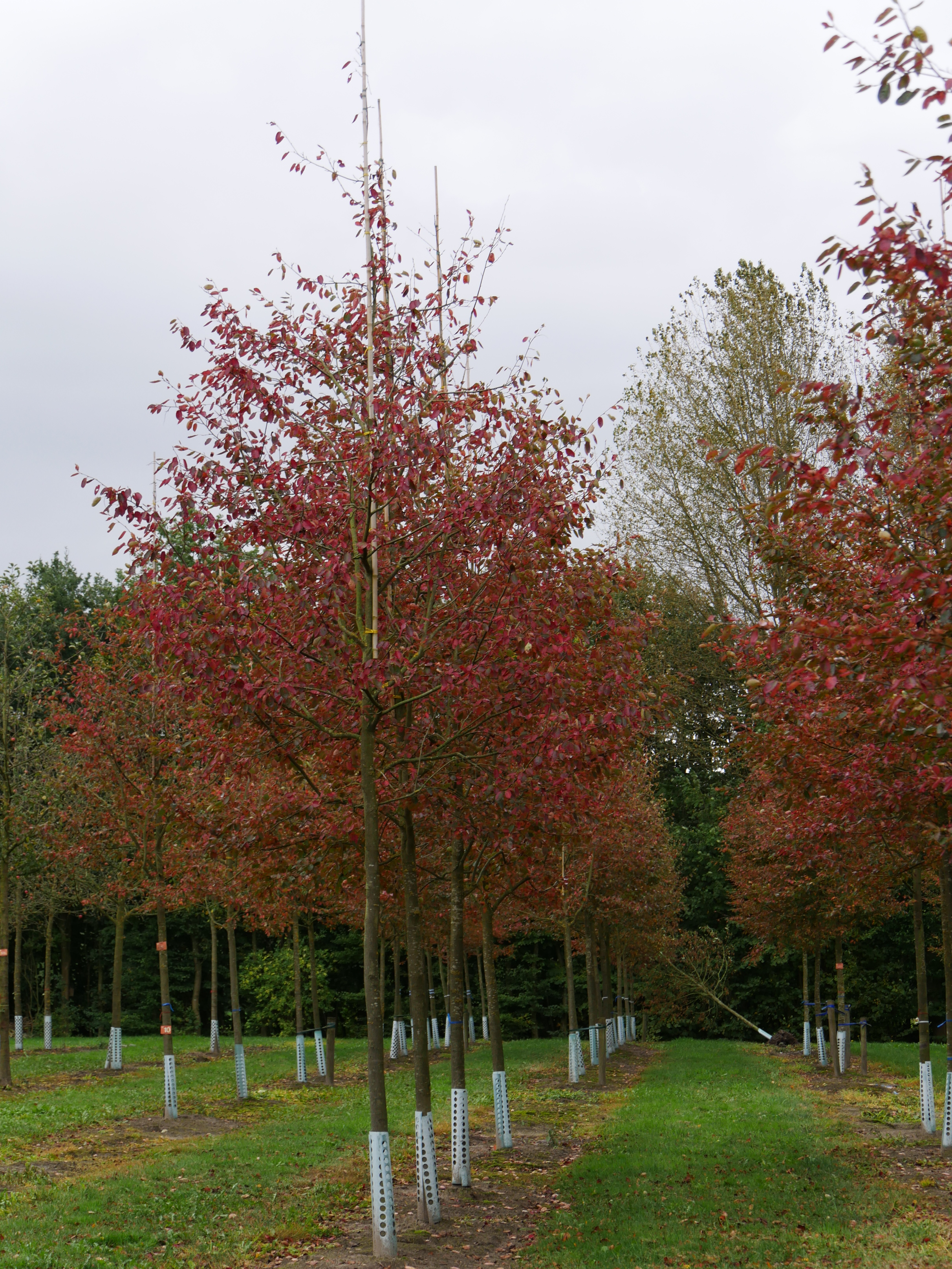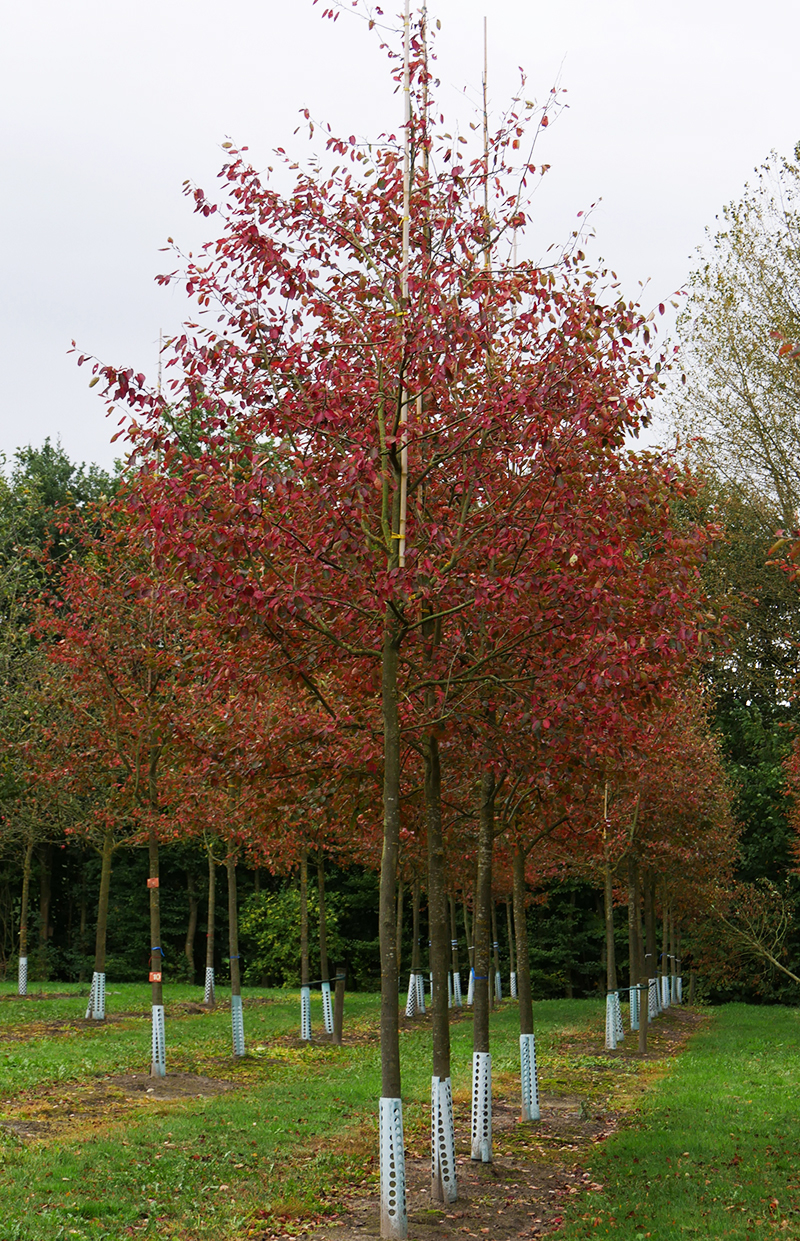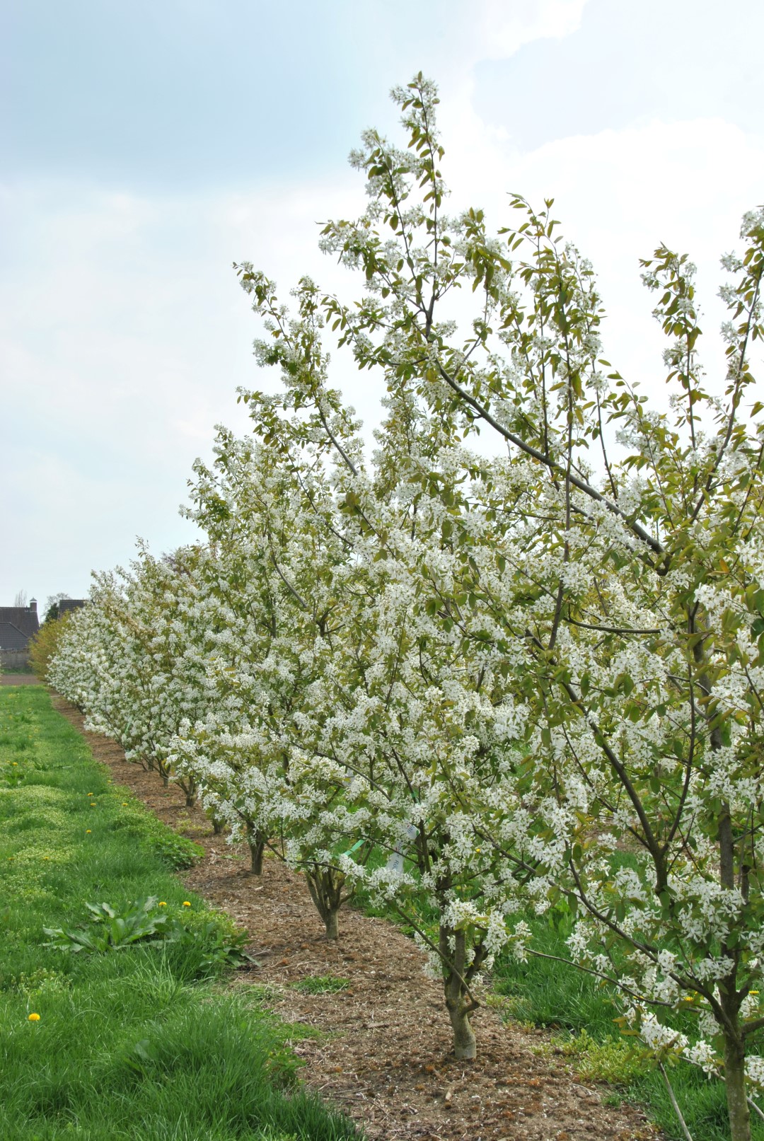 From being a shrub it sometimes grows to become a small tree. The broad, vase-shaped crown and fine branching pattern give this tree a striking winter silhouette. The dark-green, long-stemmed and broadly elliptical leaves are bare and coloured greyish green underneath. In the autumn they turn to purple. The white flowers are in large, loose, pendulous flower clusters. Berries appear starting in late July and turn from a purplish red colour to black. They are 1 cm large and very edible, with a sweet flavour. The large quantity of berries can create problems for paved ground below. 'Ballerina' has a fine root system close to the surface. It places little demands on the soil, prefers slightly calcareous soil that is not too wet. Very strong tree, resistant to wind and severe frost.