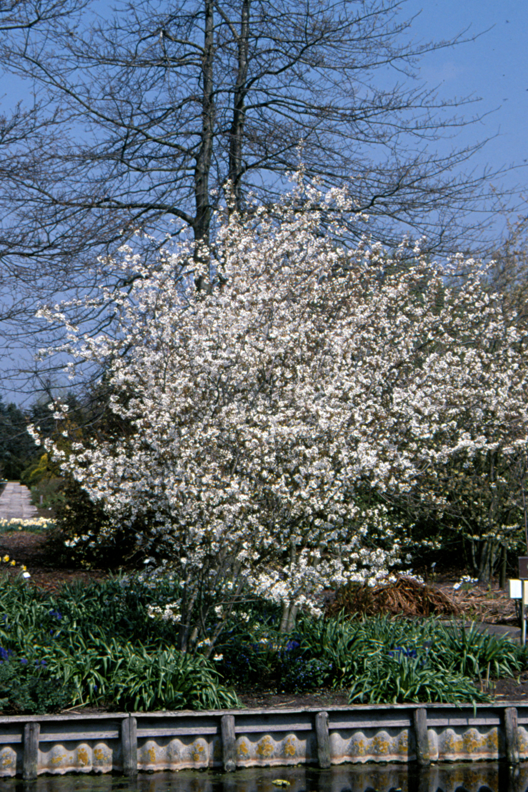 Initially grows as a large, fairly slender, vertical shrub, growing later into a small tree with a broader, oval crown. The dark green leaf emerges with a slightly bronze colour. It is somewhat irregular, broadly elliptical and turns yellow and red in autumn. In comparison with other cultivars, the leaf is rather less attractive, but the bright white flowers are strikingly big. This effect is reinforced because they are grouped in somewhat overhanging racemes. They are followed by brownish red, edible fruits. The plant has a reasonable to good fruit yield. ‘Snowflakes’ originated from seed imported from Canada by Proefstation voor de Boomkwekerij in Boskoop (NL). Amelanchier has few soil requirements but grows best in calcareous soil.