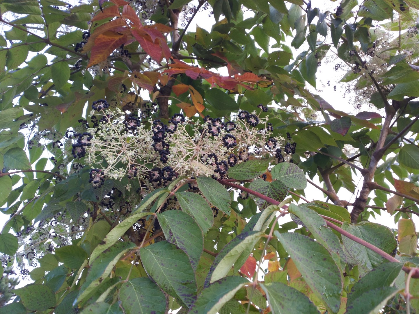 The leaves of Aralia elata turn yellow, orange, red in autumn.