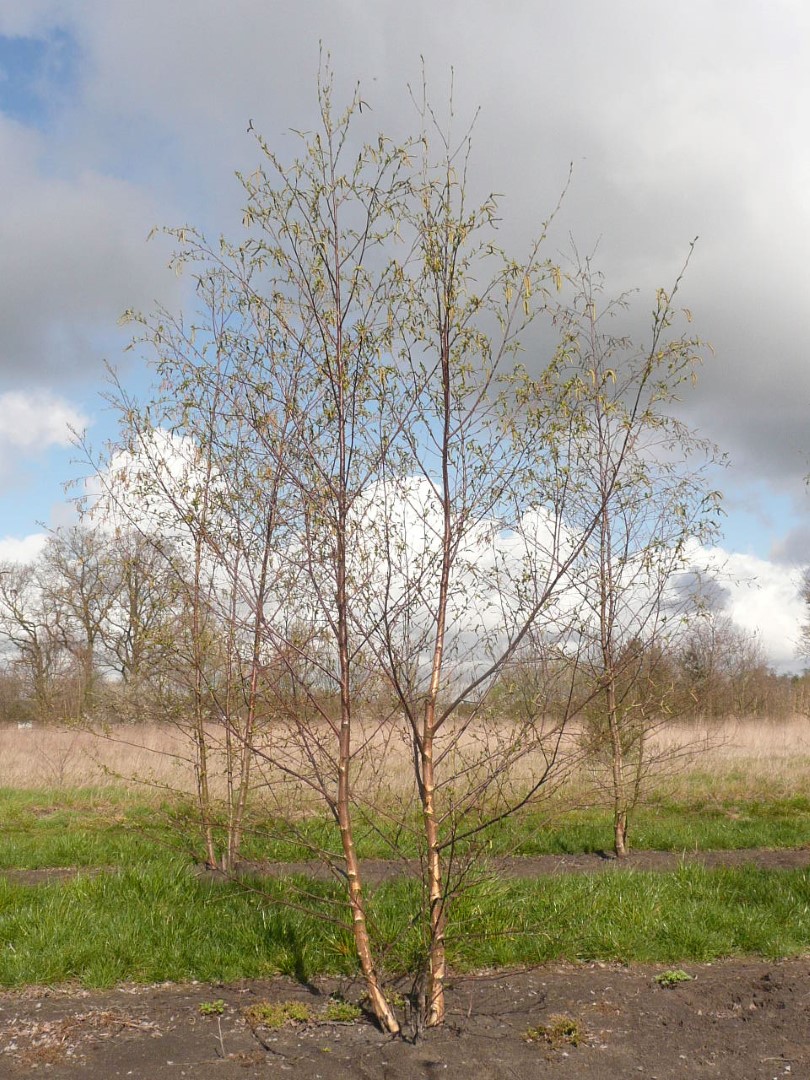 Beautiful birch with a loose crown and slightly pendent branches. Originally growing in the northern parts of the United States and in Canada. Here the tree is an important producer of veneers and pulp. In these regions it attains a height of 30 m and therefore it is considered to belong to the highest of the birches. Can grow into a multiple-stemmed tree with wide spreading branches that are slightly pendent. Often has a variable crown. Width circa 12 m. The bark is bright white and peels in paper-thin plates. Under the plates the bark is darker. Twigs are shiny red brown and display many warty lenticels. The leaf is dull green and the underside is a lighter green. The leaf margin is coarsely toothed. Prefers slightly moist soil, dry soil gives much dead wood. Shallow rooting.