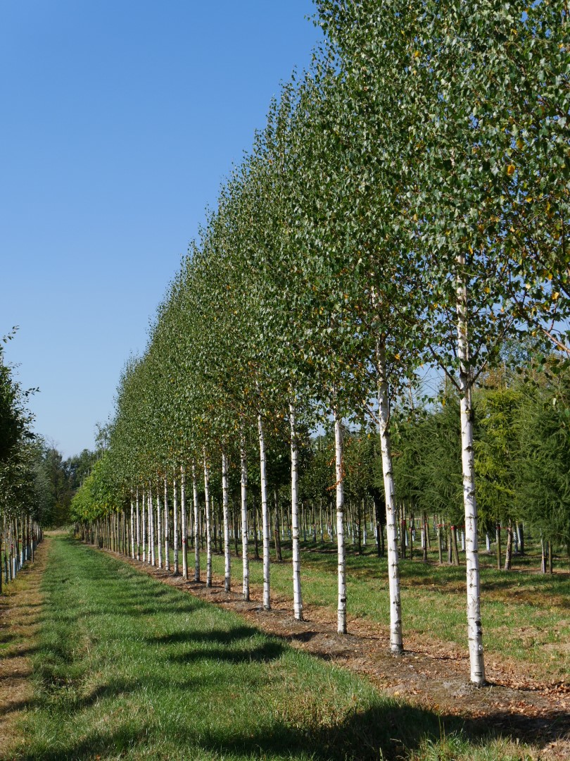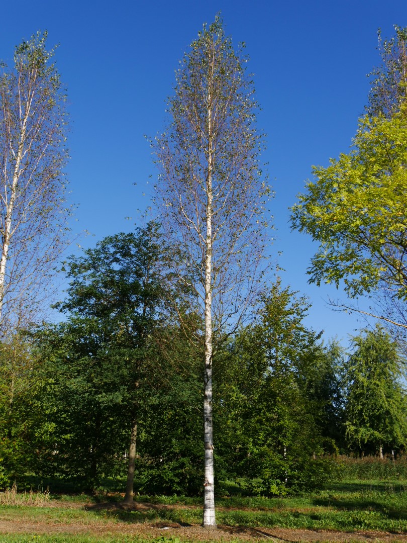 Medium-size tree with healthy, vigorous growth: has a slender, narrowly pyramidal crown. First year twigs dark brown, older bark white to grey-white. The bark is only slightly peeling: only older trees acquire a grooved trunk base. Forms a nicely vertical main stem with the branches growing from the central leader at an angle of about 45°. The glossy, fresh green leaf turns golden yellow in autumn. Due to the narrowly pyramidal crown, good anchoring and fairly light side branches, the tree is highly suitable for avenues and streets. Also very useful in landscape planting. Was discovered in Switzerland by Sjef van Roessel and introduced after extensive testing.