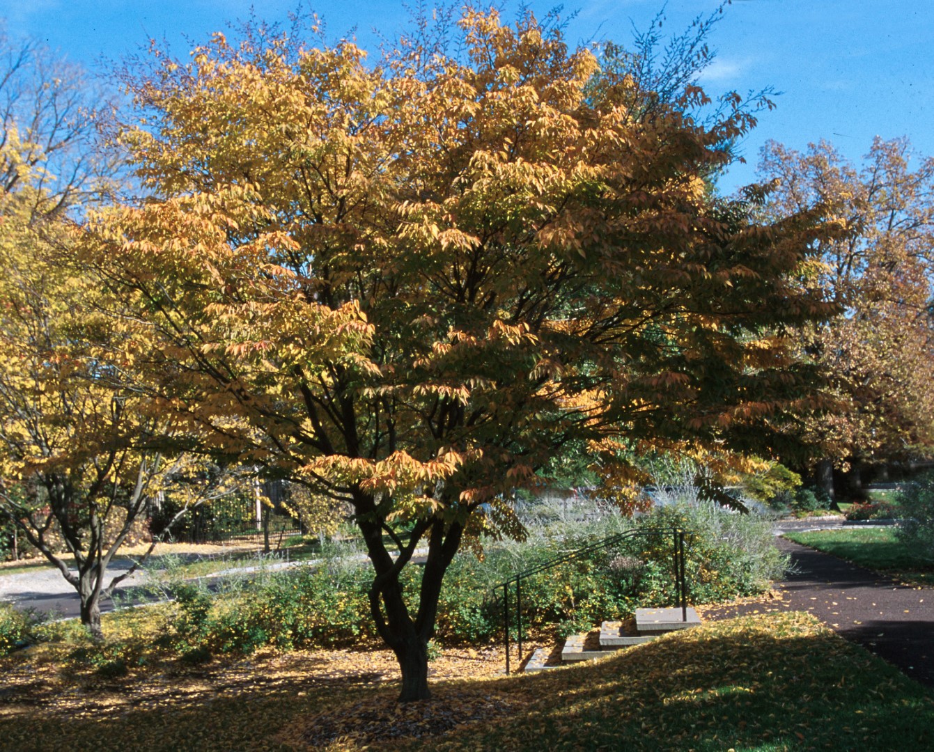 A small tree under cultivation, but can grow into a medium-size or even large tree under favourable conditions. The broad crown is round to flat-topped spherical, an effect caused by the gracefully overhanging twigs. The young twigs are hairy, older twigs smooth and grey. Shallow, light grey grooves appear in the bark from as early as seven years. On emerging, the leaves are bronze to reddish: in summer they turn matt dark green. No remarkable autumn colours. Root growth is relatively close to the surface. Has few soil requirements but flourishes best in loamy soils. The rotted leaves are good soil improvers.