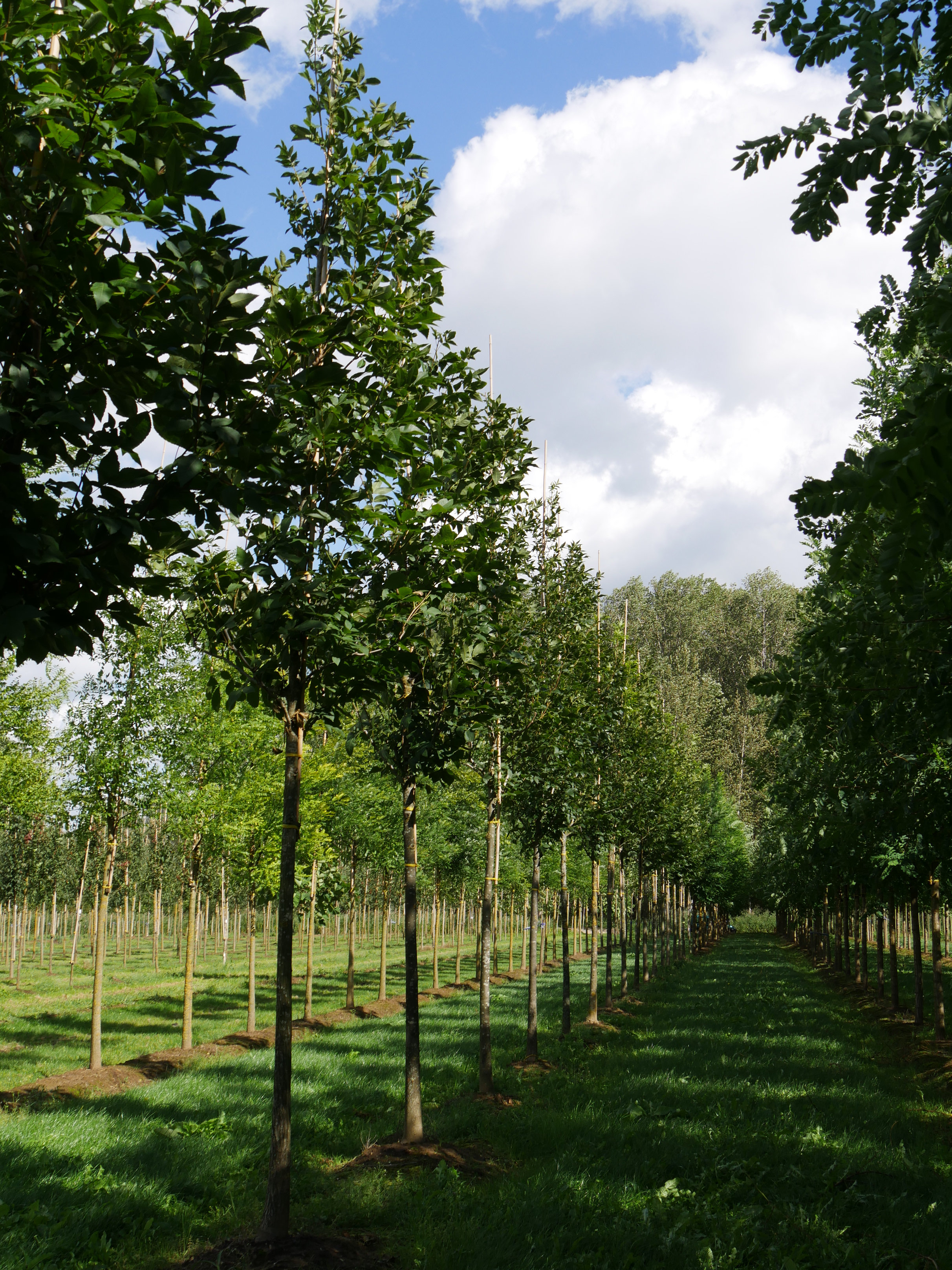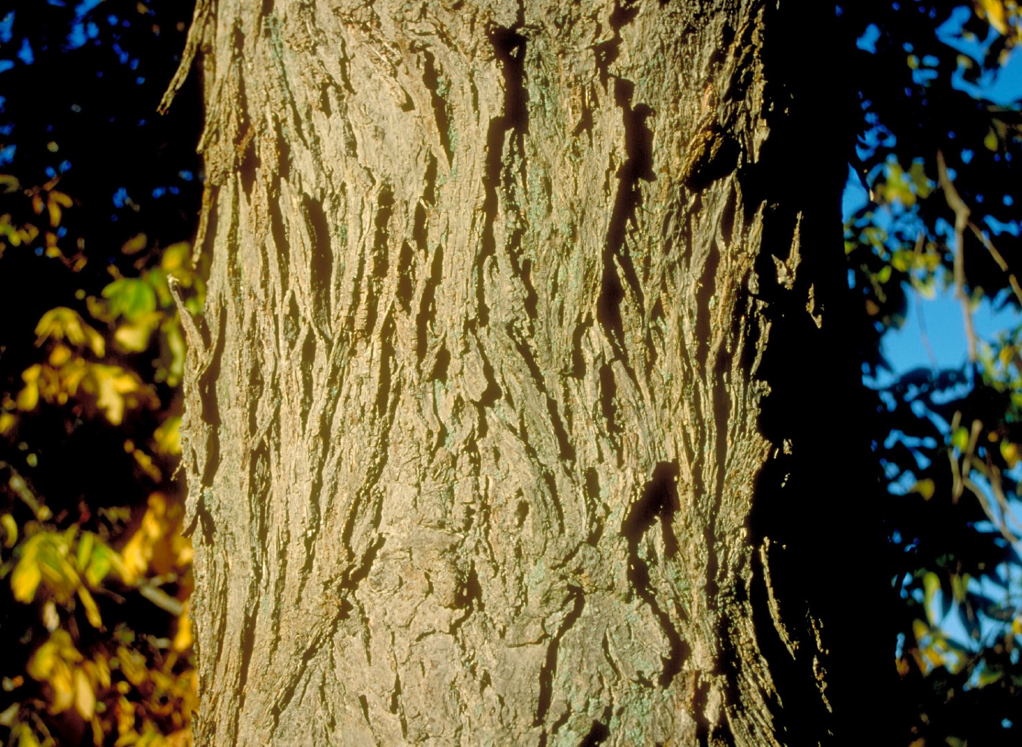 A tall tree with relatively thin, strongly spreading branches and twigs. Grows up to 50 m in height in its natural habitat but is practically always smaller when cultivated. Old trees are valued for their durable carpentry wood. The bark is grey and flakes off in long plates. Young branches carry felt-like hair, The leaf is a compound of 5 to 9 lanceolate leaf segments. When rubbed they give off a strong smell. The leaf edge is serrated and fimbriate. The leaf axis is pretty well bald and sometimes remains hanging on the tree for a long time in the winter. The leaves are somewhat brown tinted when they first appear but are light green in the summer and flaming yellow in the autumn. The round, sweet, edible nuts are contained in a smooth husk that opens practically completely. Deep root system.