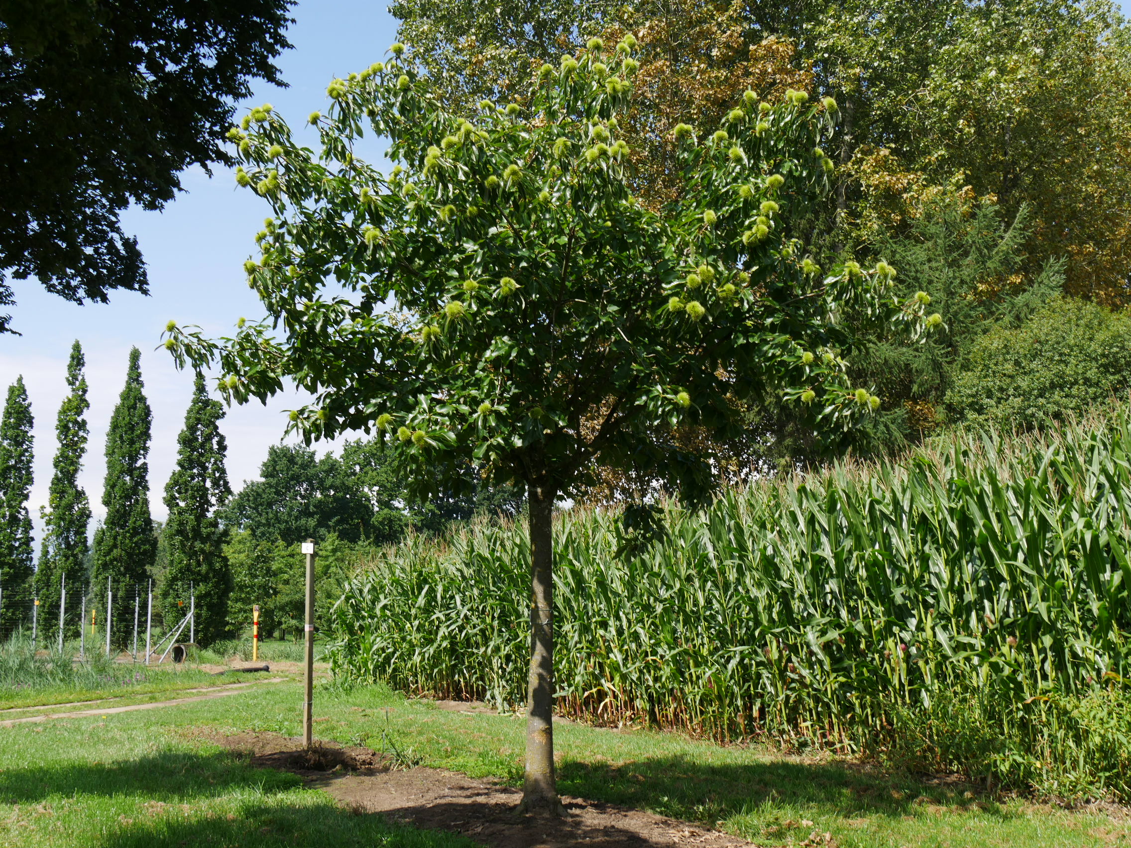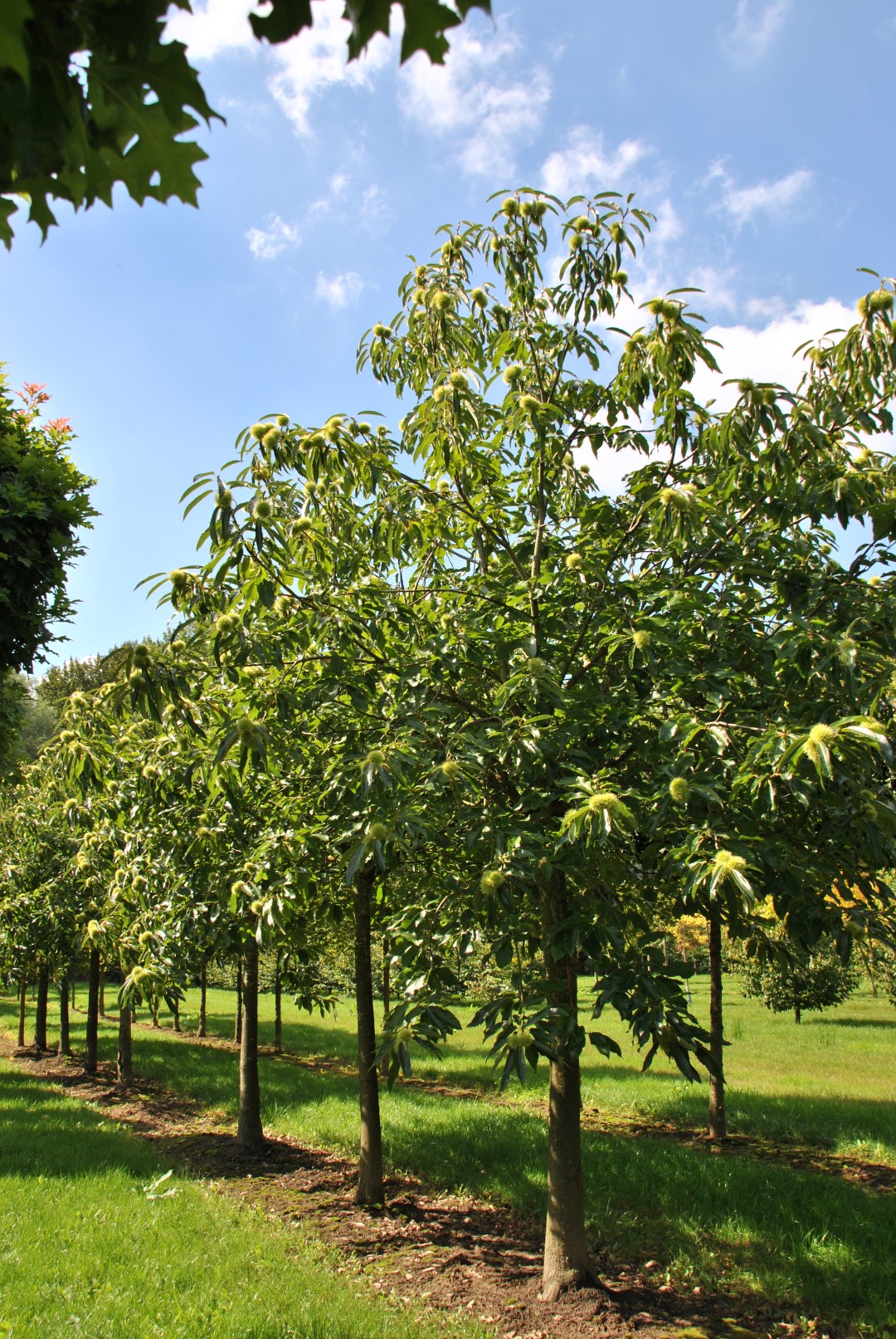 Castanea sativa 'Lyon'. A small tree with a maximum height of up to approx. 7 m. The squat crown has an irregular shape. The leaves and flowers are similar to those of the species. But the major difference is that this clone produces an enormous quantity of fruit and bears a great deal while still young. The edible fruits are larger than those produced by the species. Suitable as a fruit tree in small garden and orchard. Winter hardiness zone: 6a