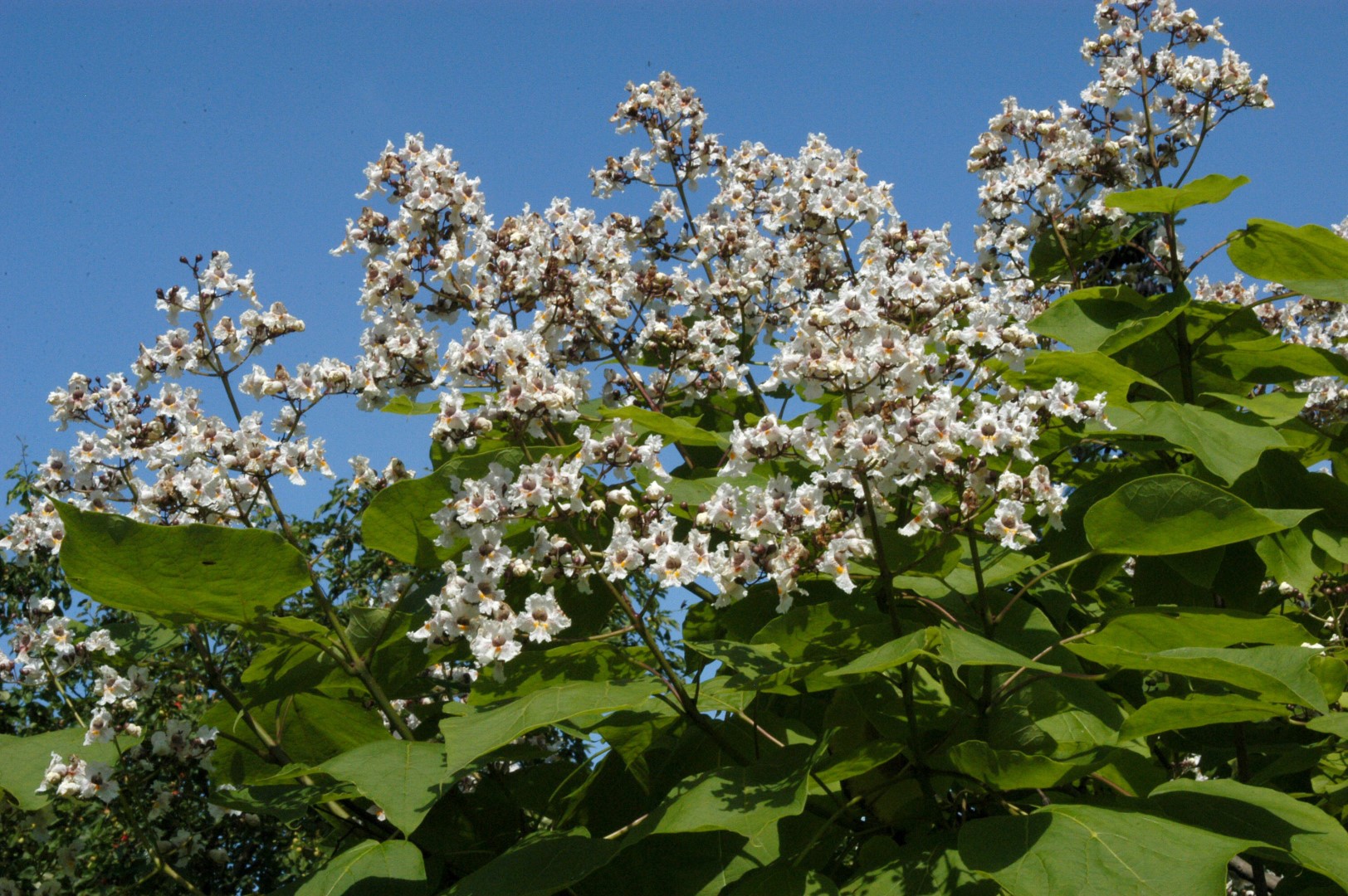 A cultivated crossing between C. bignonioides and C. ovata. Has heavy main branches and grows from shrub into an average-sized tree. The initial pyramidal, but later round crown, is half-open. The hard wood breaks easily. The acuminate and entire, heart-shaped to ovate leaf appears late in spring and it has a slightly purplish-brown colour, later turning dark green. Young plants have a larger leaf, to 30 cm. It is shed relatively early. The white, tubular flowers are slightly smaller than of C. bignonioides and appear in erect, long panicles of 20 to 30 cm. Inside the flowers are yellow and have small brown spots. They are followed by 25 to 35 cm long capsules that are 1 cm thick. These persist during winter.