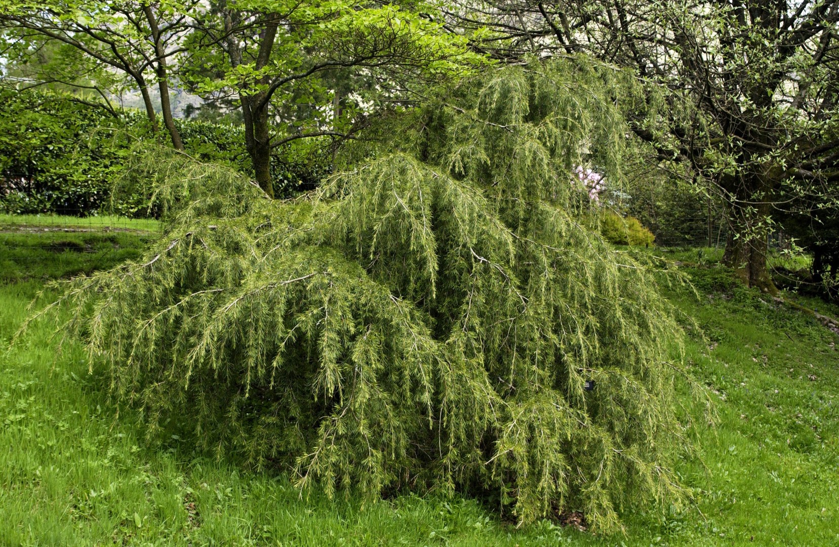 This is a cultivar with horizontal lateral branches that are irregularly pendulous at the end. The tree grows out very broadly and develops a broad, pyramidal crown. The crown is more open than those of the species. The needles grow in groups, with up to 30 bundled together. They are dark, bluish green and remarkably longer than those of the species and other cultivars: up to 8 cm. The ovoid, upright cones grow singly or in pairs and have a round top. Saplings are particularly sensitive to frost, requiring a sunny site sheltered from wind. Does not thrive well in high-pH soils.