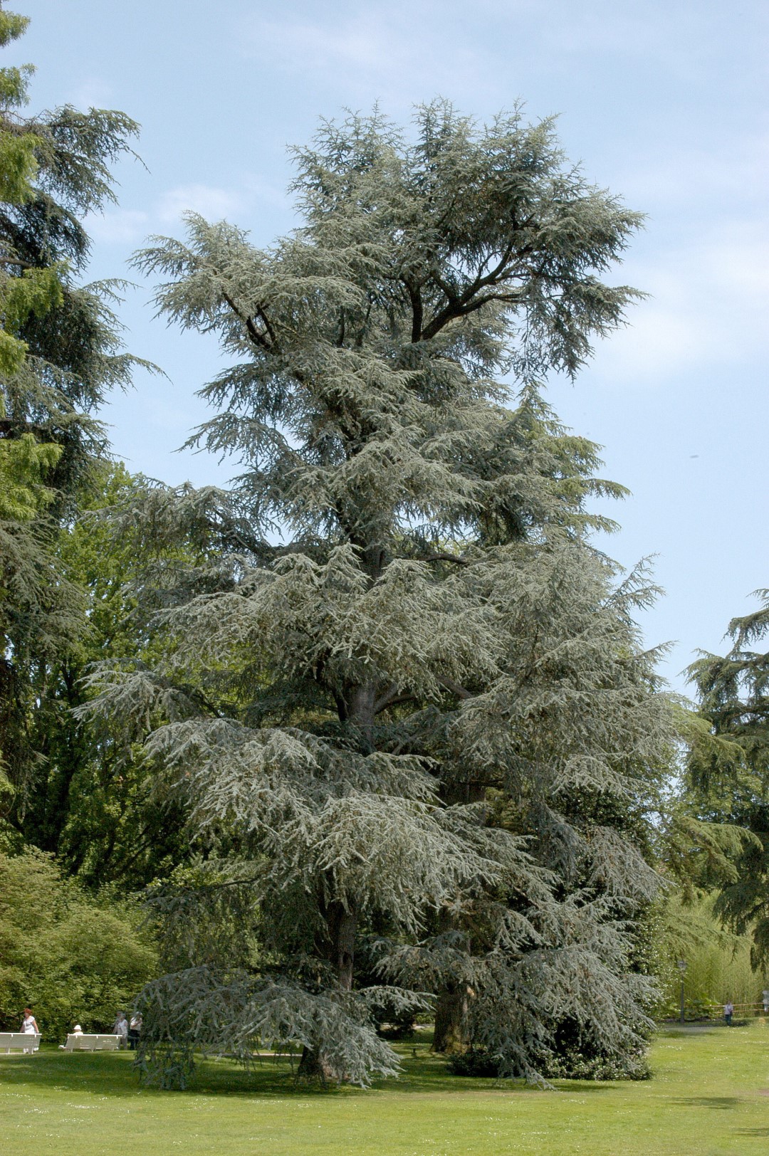 A tree that resembles C. libani subsp. atlantica in all respects except for the distinguishing characteristic of the intense blue-grey colour of its needles. First the trunk is grey and smooth, but rougher in older trees. Later, the bark flakes off in small plates, revealing the reddish brown bark. The branches are fairly loose, but more close than C. libani subsp. atlantica. All lateral branches slant slightly upwards. The twigs are first greyish green to greyish brown but turn grey in the second year. The needles, 2 - 2.5 cm long, grow in bundles of 20 - 40 together. The needles are a striking grey-blue, particularly on young shoots. Upright cones appear in autumn. Young cones are green but turn purplish brown to brown later. This cedar requires ample sun and is highly tolerant of air pollution. Cedrus libani 'Glauca' grows into a large tree that can be used as a solitary in large parks. The tree is still often traded under its old name C. atlantica 'Glauca'.