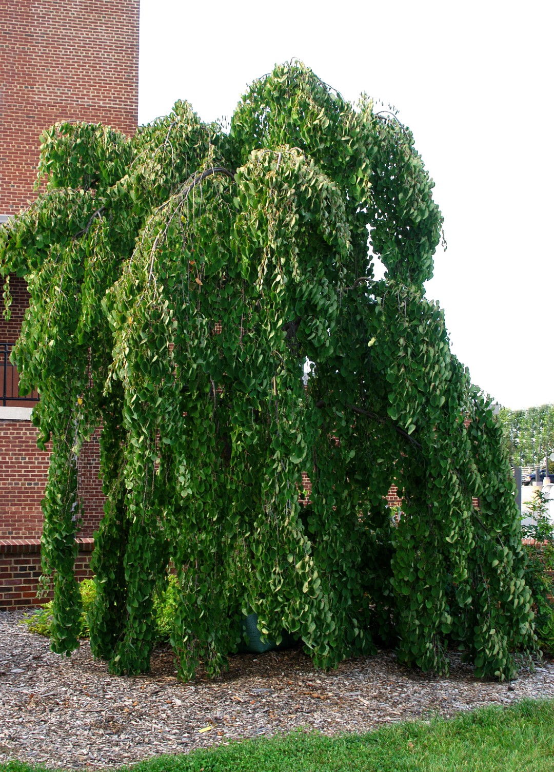Relatively fast growing, small to medium size tree with very pendulous branches, creating a broad, weeping shape. Can eventually grow 8 m tall and at least as broad. The bark is grey, peeling in strips when mature. The almost round leaf is light bronze-green on emerging, turning (blue-)green in summer. The autumn colour is brownish yellow to orange-yellow. As typical for the species, the falling leaf has a pleasantly spicy/cinnamon scent. Was already being cultivated in the 17th century at a Buddhist temple on the Japanese island of Honshu. Thrives in loose, preferably loamy soil. Poor tolerance to drought. The spring leaf is sensitive to night frosts. Primarily for use as a solitary tree in a large garden or park.