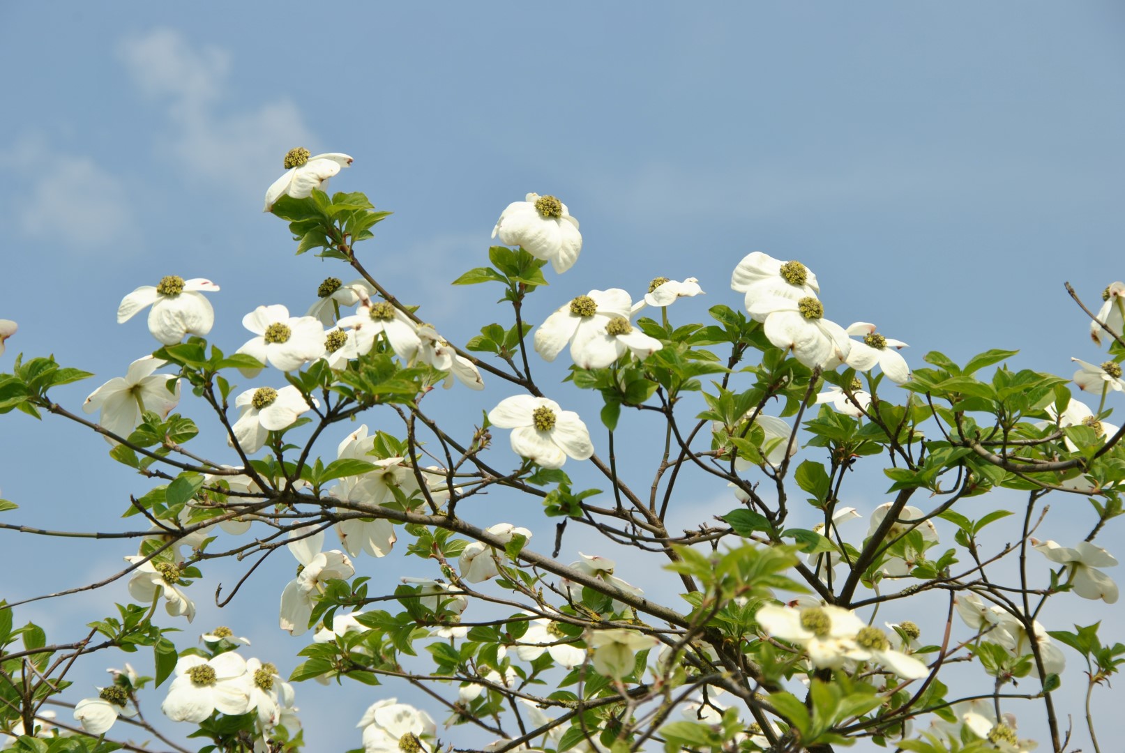 Small tree up to 8 m with a round crown and pendulous branches. The young twigs are purple to brown: older branches have grey, somewhat peeling bark. The large, glossy, dark green leaves produce splendid red to purple autumn colours. The flower panicle has a diameter of 6 to 10 cm. Each flower head is surrounded by 4 large, rather rounded bracts. The bracts are white and slightly grooved: the tips are somewhat folded back. ‘Ascona’ is a hybrid of C. florida and C. nuttallii, and most resembles C. nuttallii. However, the tree is sterile and more healthy.